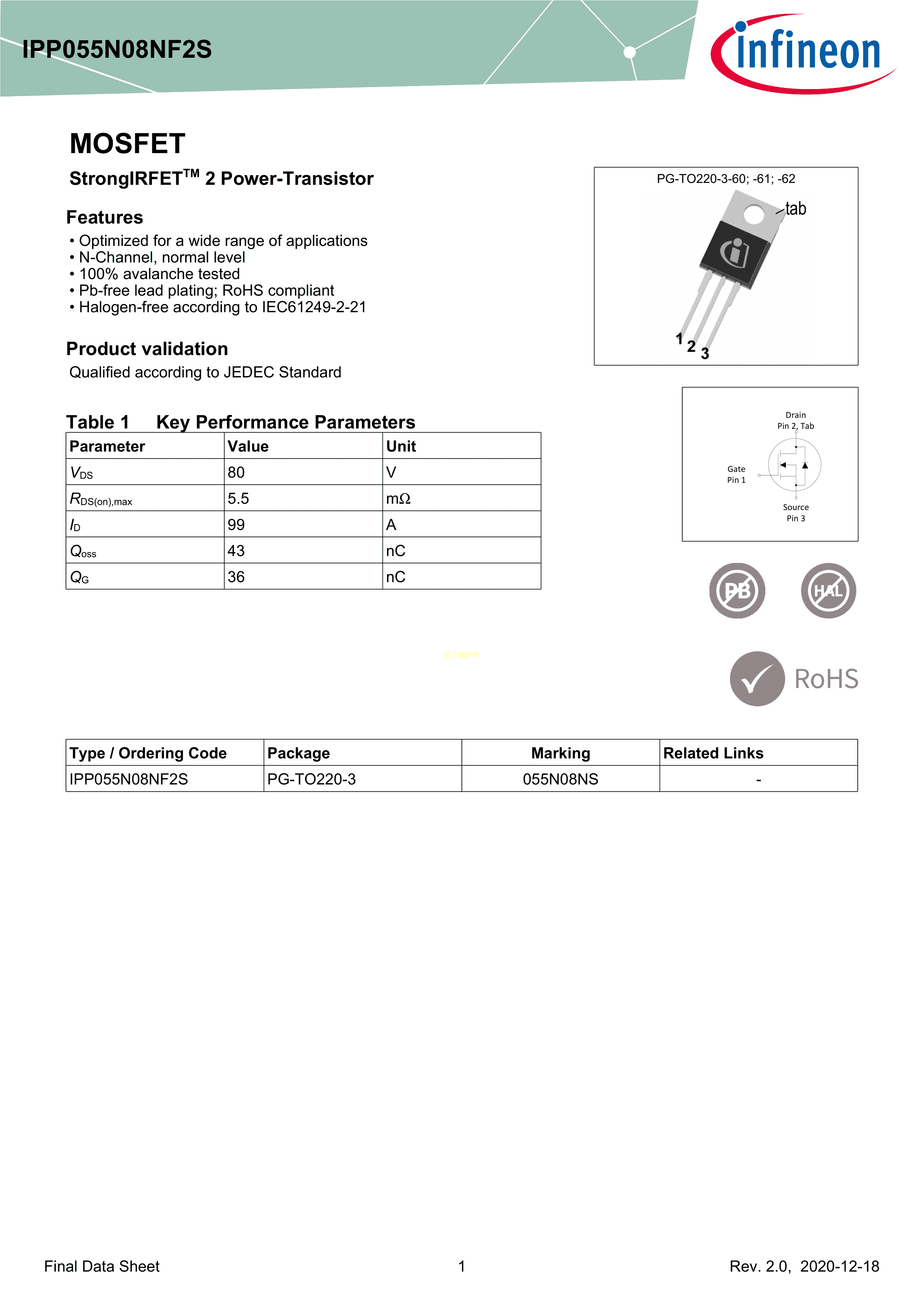 IPP055N08NF2S数据手册TO-220-3封装Infineon(英飞凌)PDF规格书,中英文
