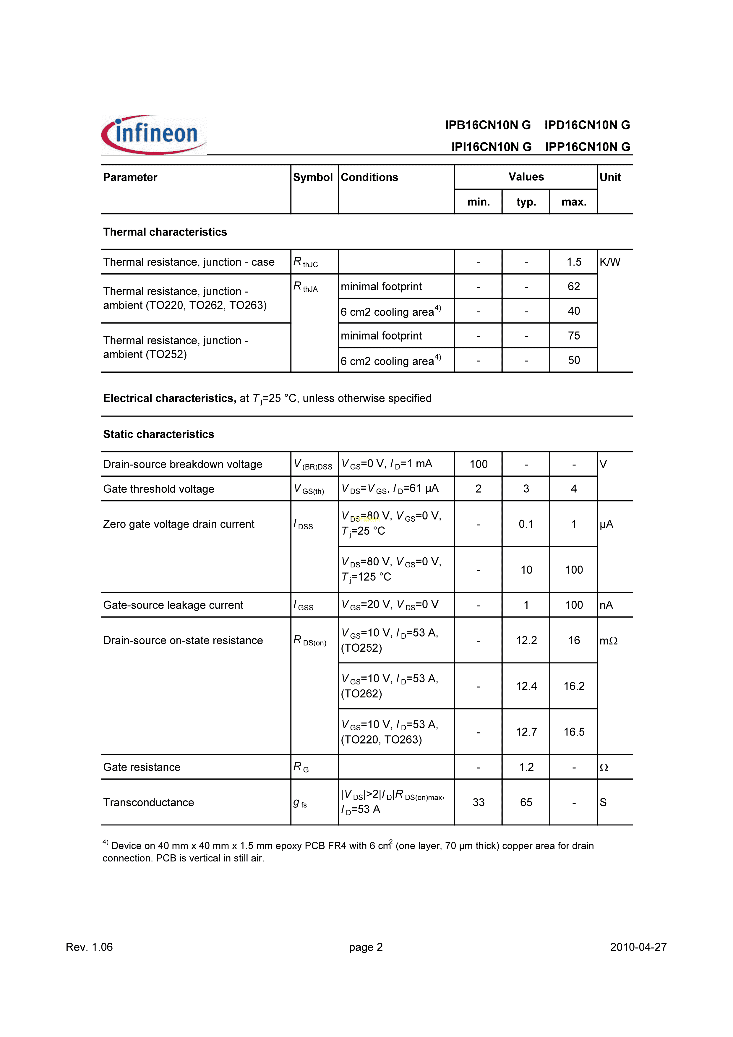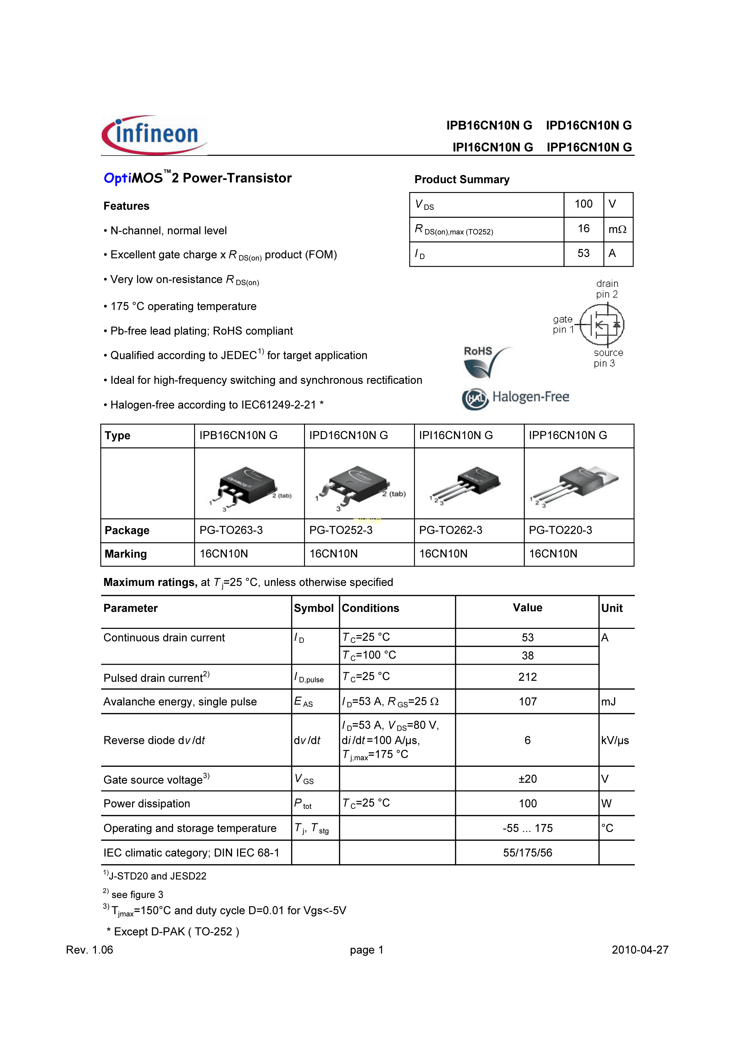 IPP16CN10NGXKSA1数据手册TO-220(TO-220-3)封装Infineon(英飞凌)PDF规格书,中英文下载
