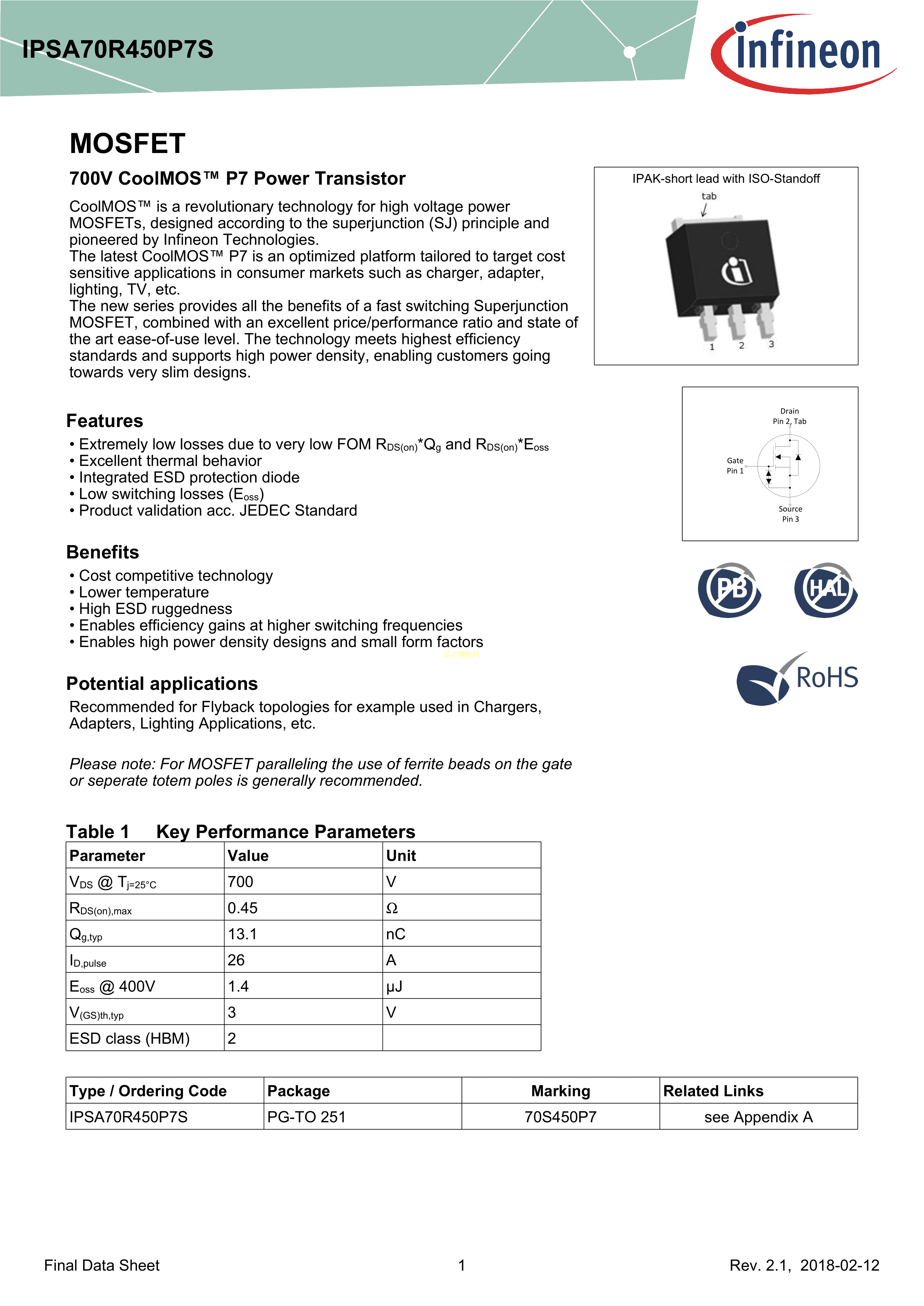 IPSA70R450P7S数据手册PG-TO251-3封装Infineon(英飞凌)PDF规格书,中英文下载