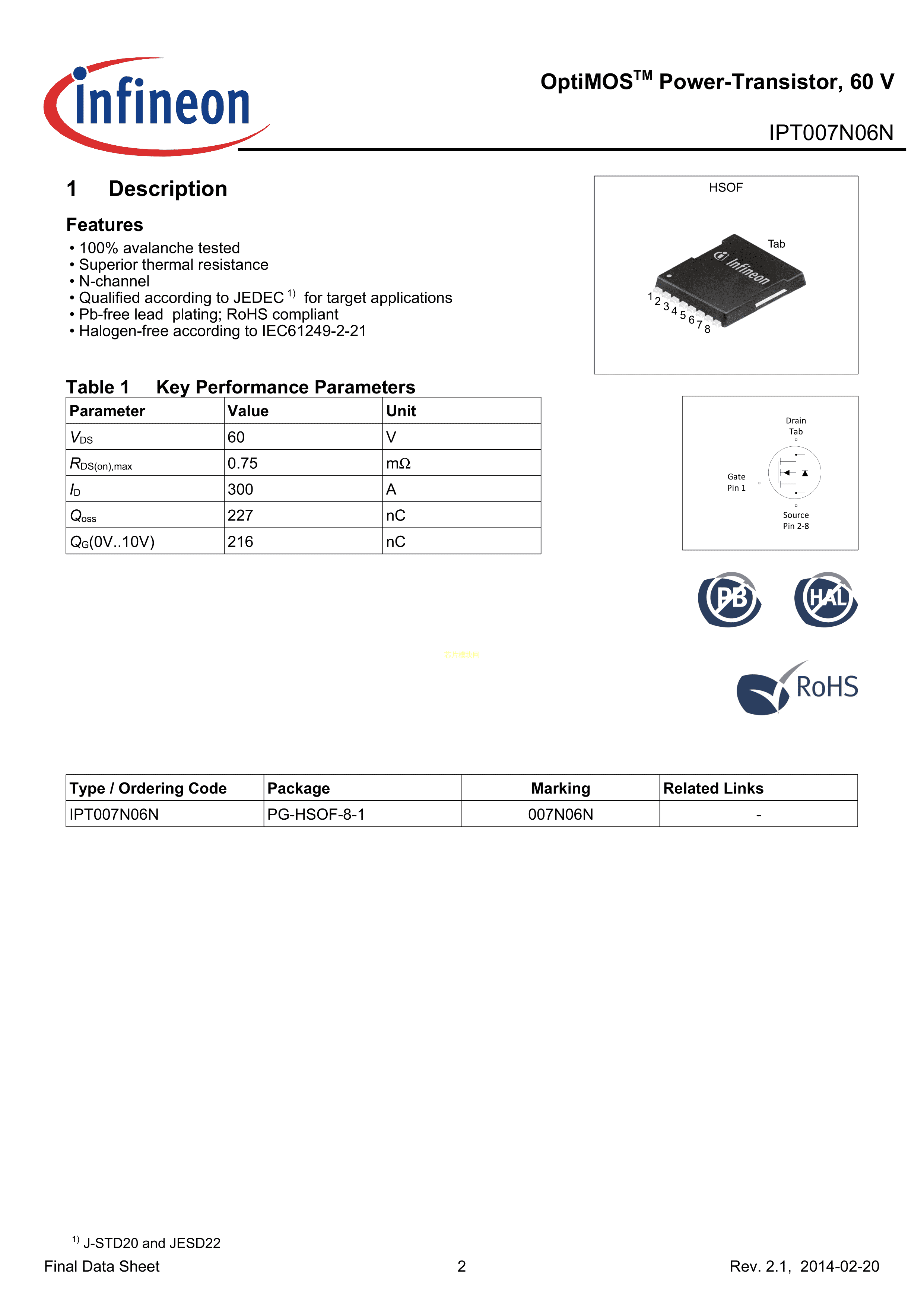 IPT007N06N数据手册PG-HSOF-8-1封装Infineon(英飞凌)PDF规格书,中英文