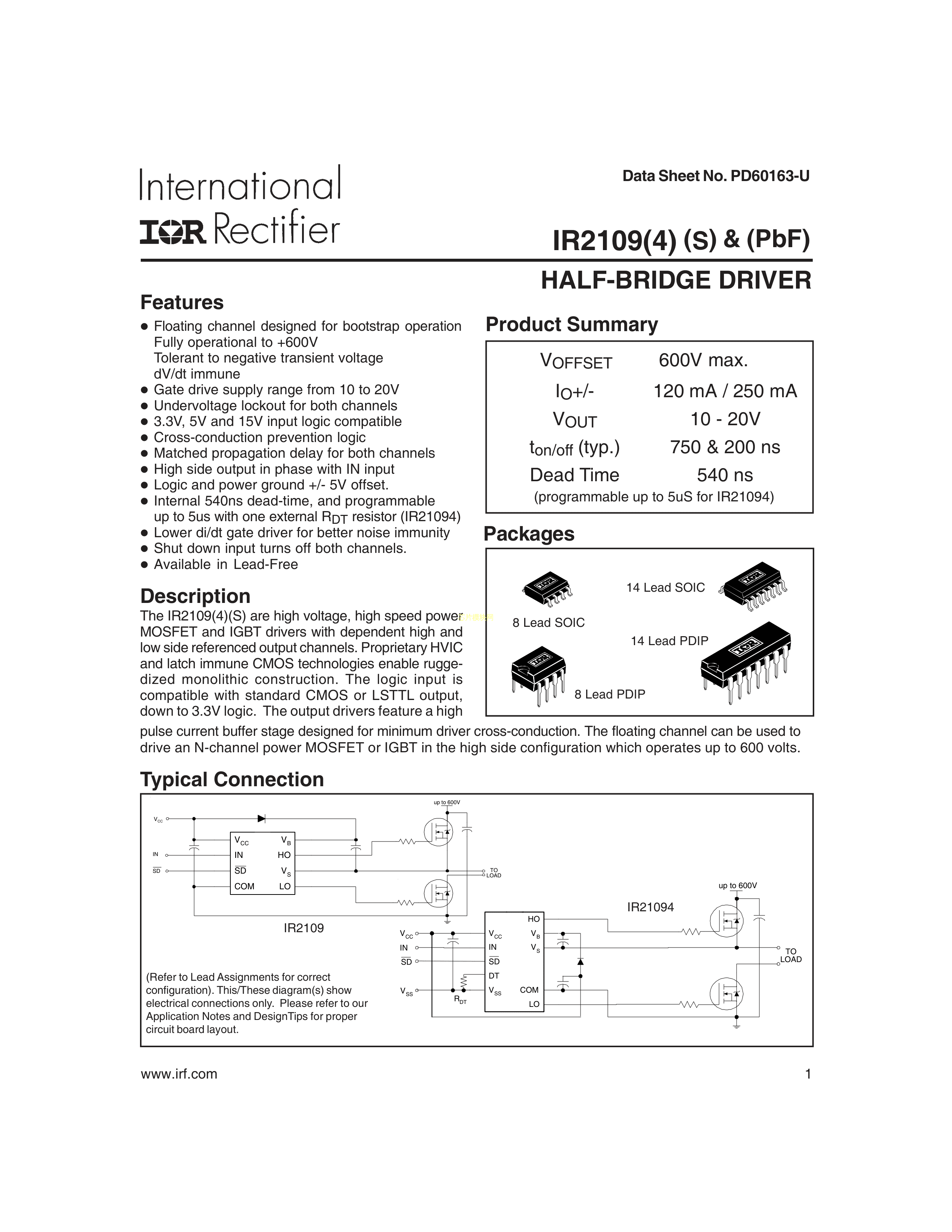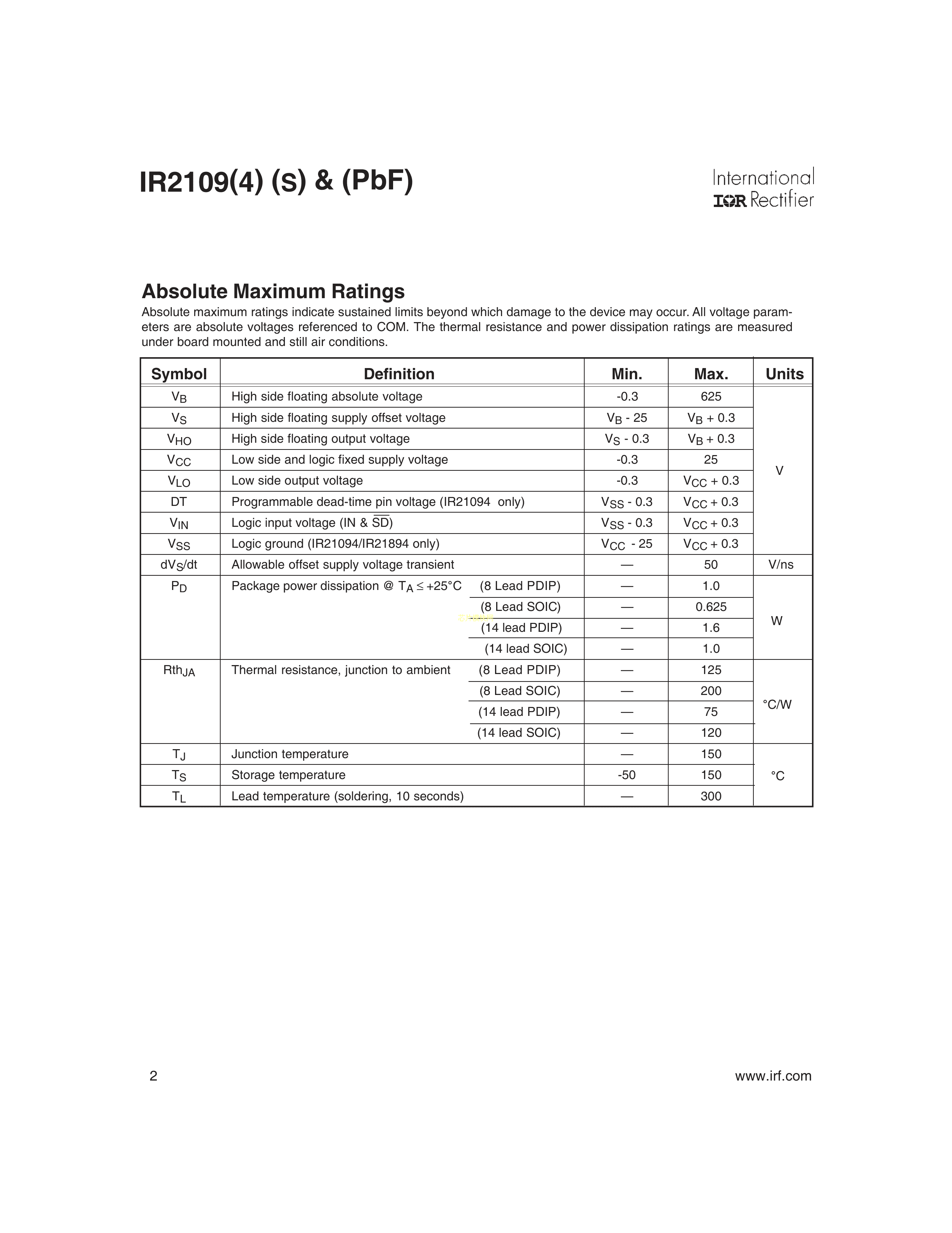 IR2109SPBF数据手册SOIC-8N封装Infineon(英飞凌)PDF规格书,中英文下载