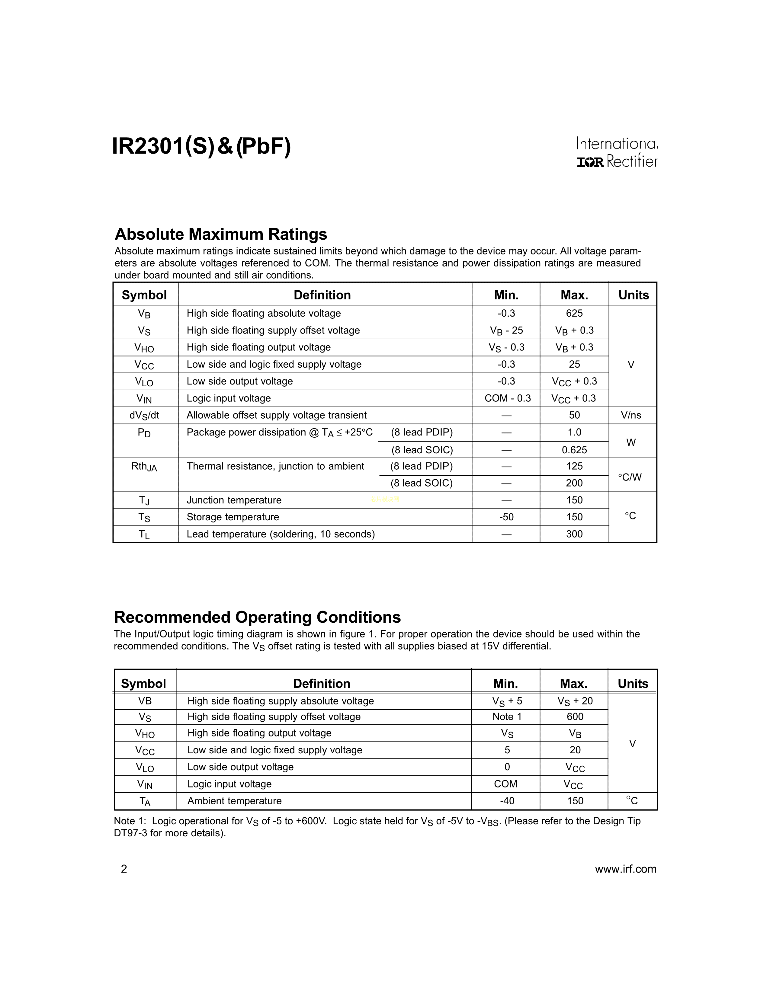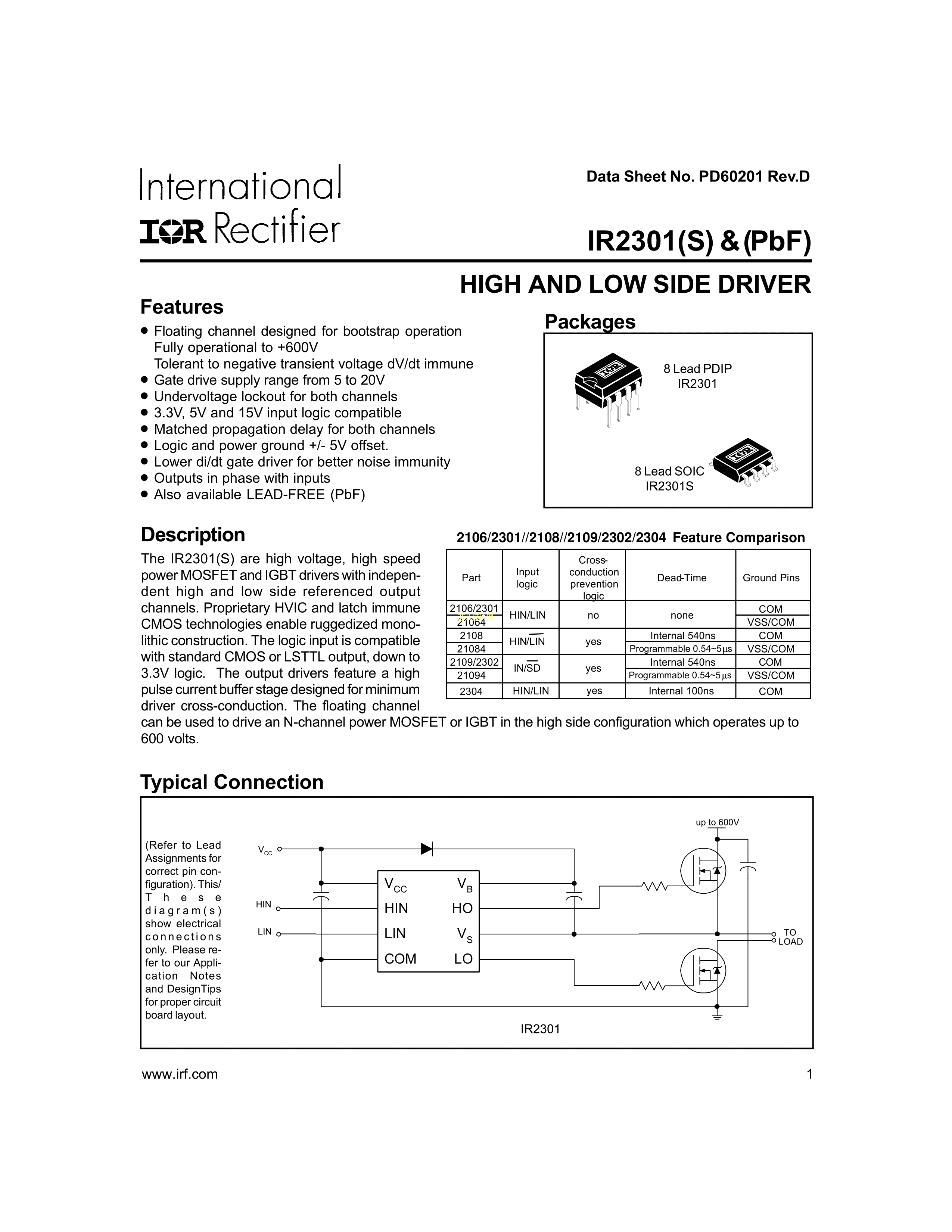 IR2301PBF数据手册PDIP-8封装Infineon(英飞凌)PDF规格书,中英文下载