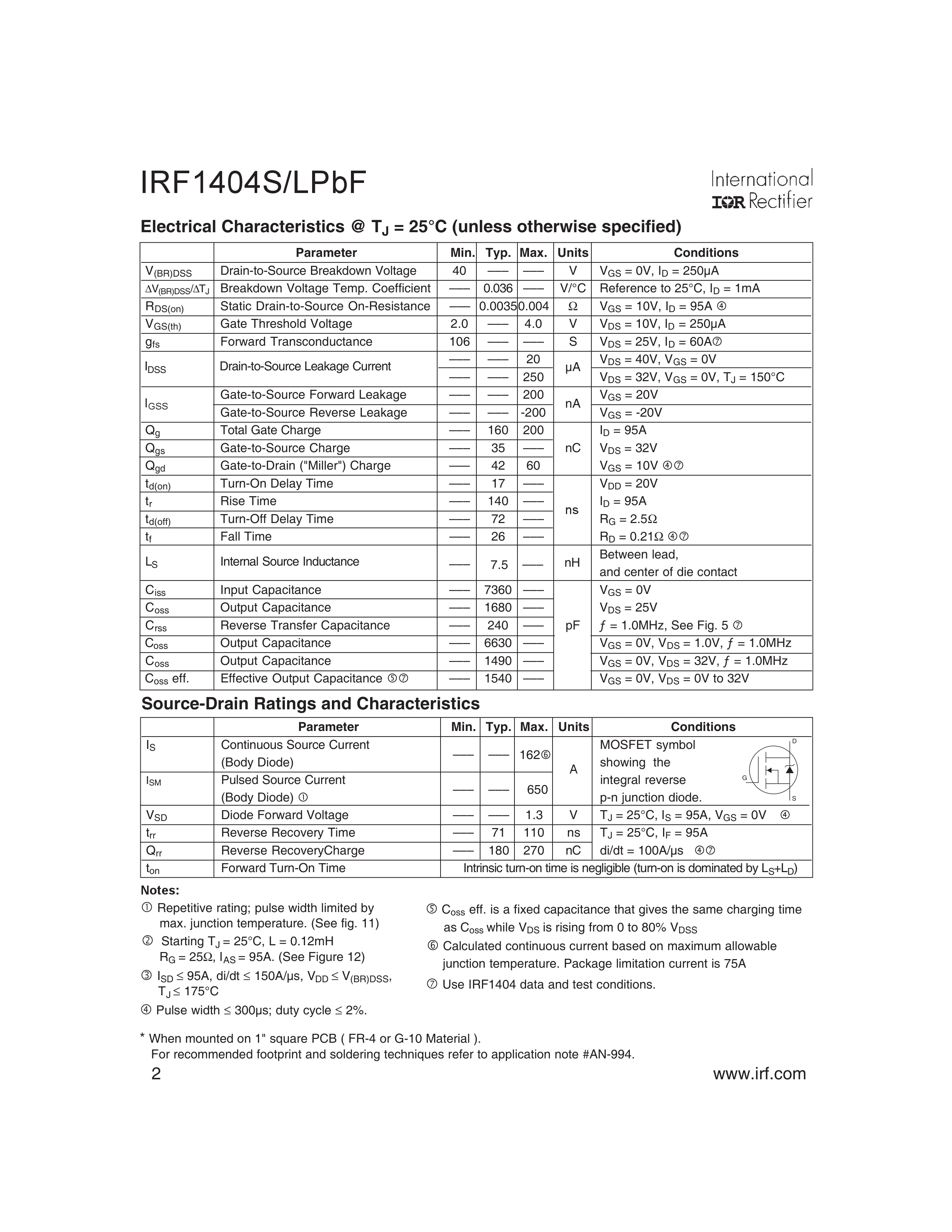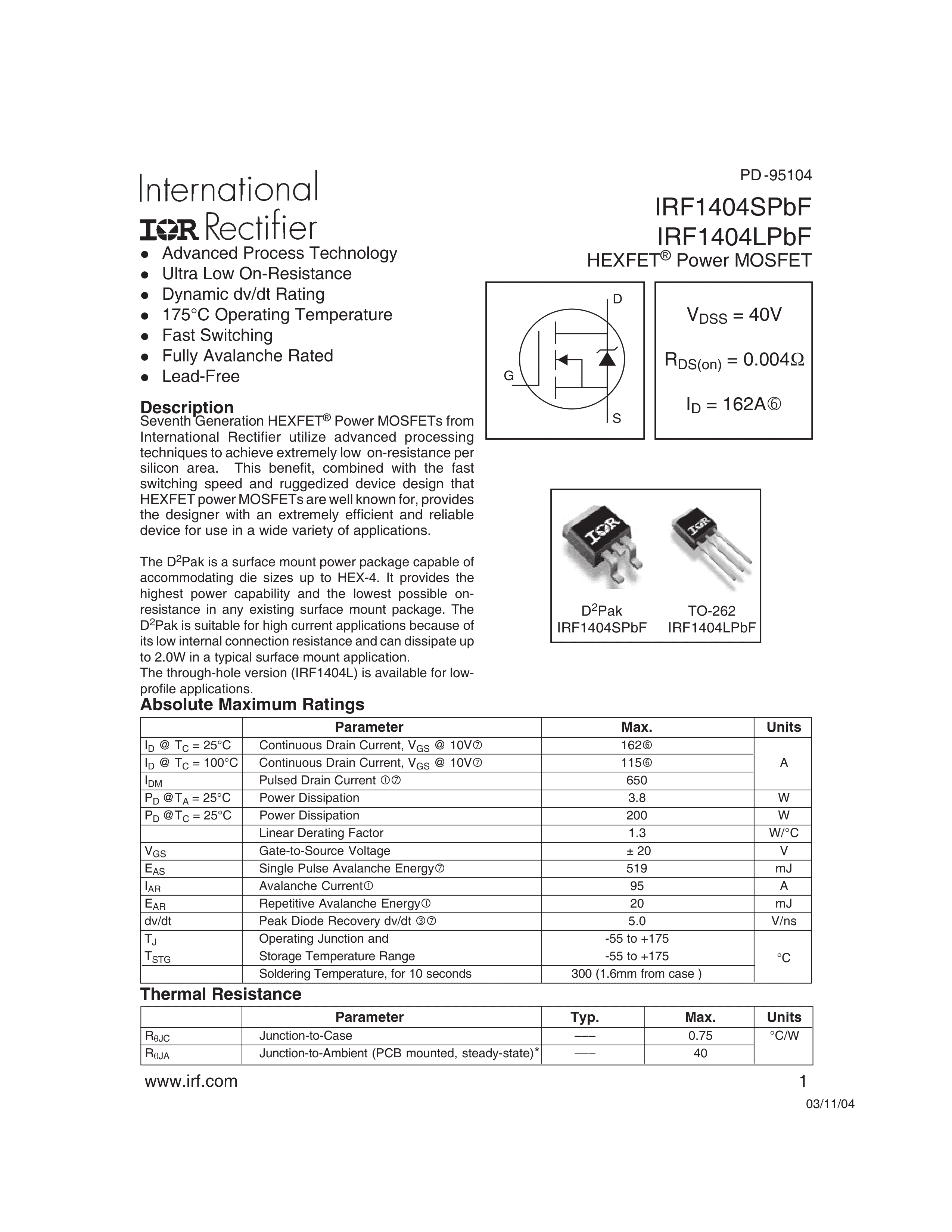 IRF1404STRRPBF数据手册D2PAK封装Infineon(英飞凌)PDF规格书,中英文下载