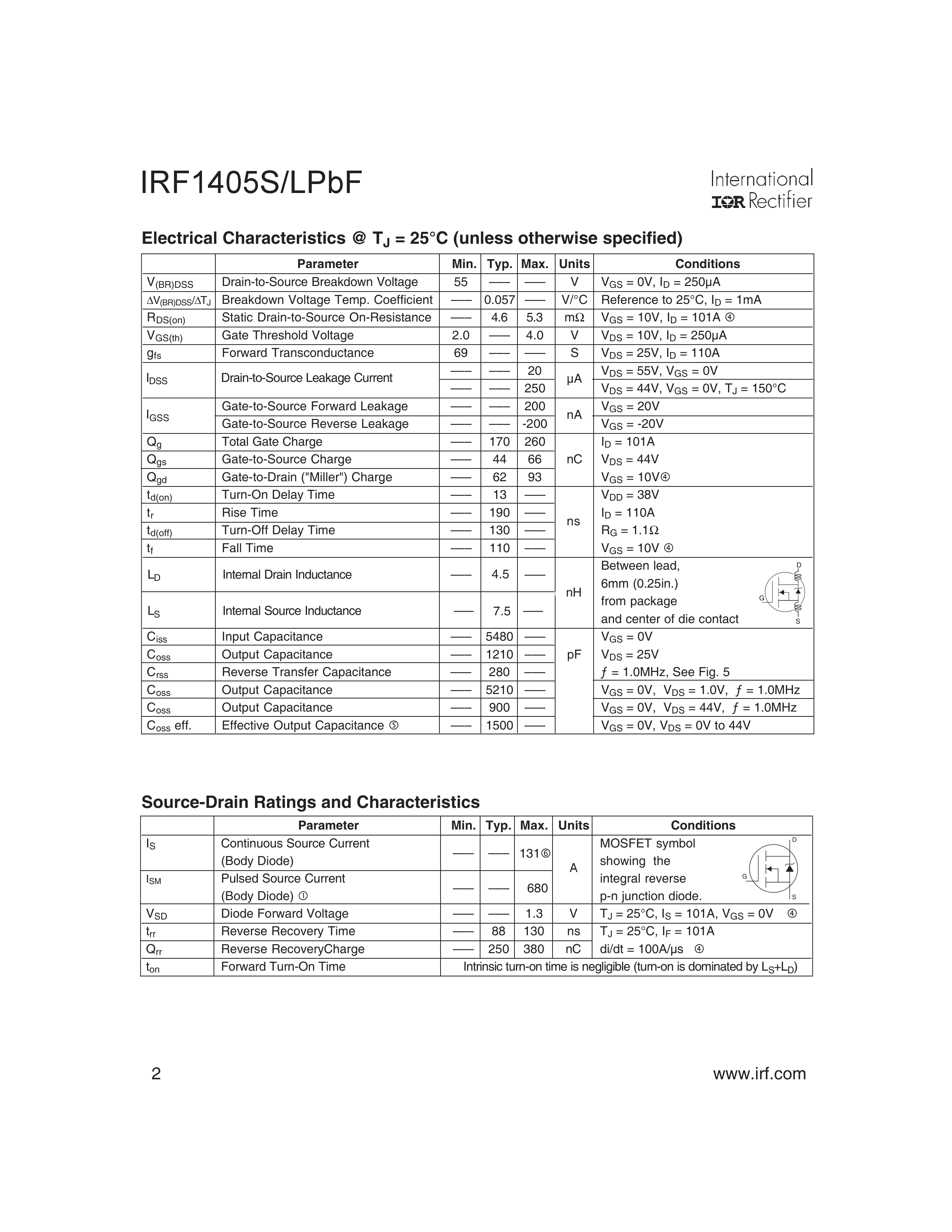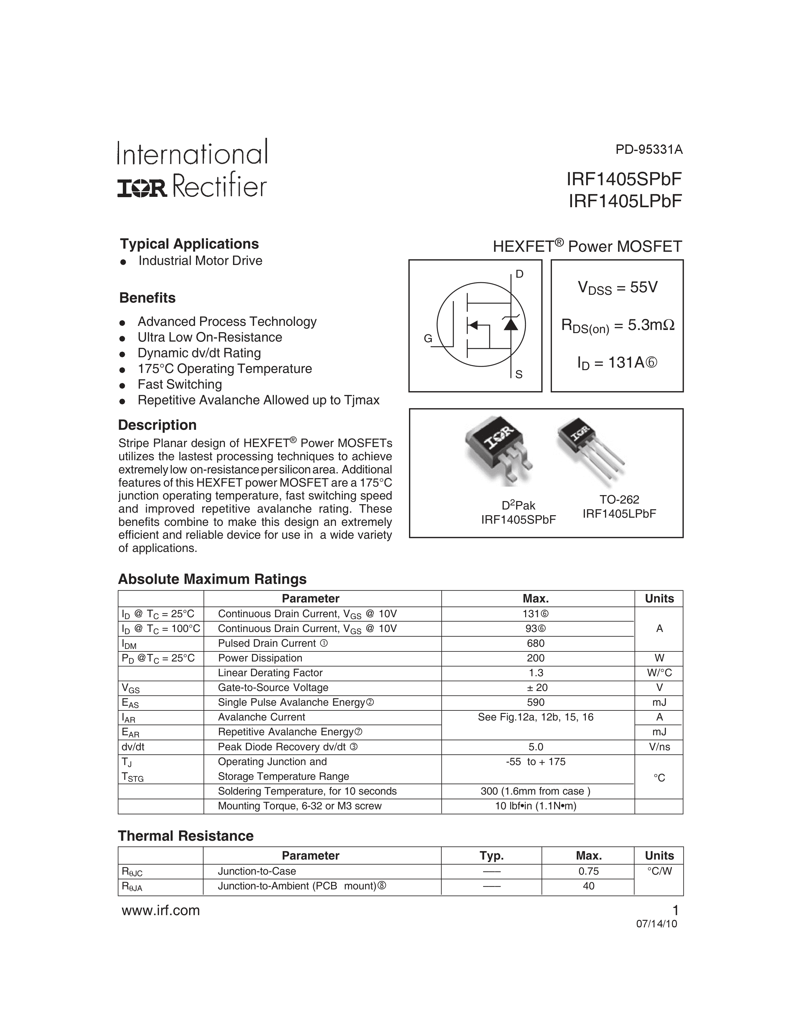 IRF1405STRRPBF数据手册D2PAK封装Infineon(英飞凌)PDF规格书,中英文下载