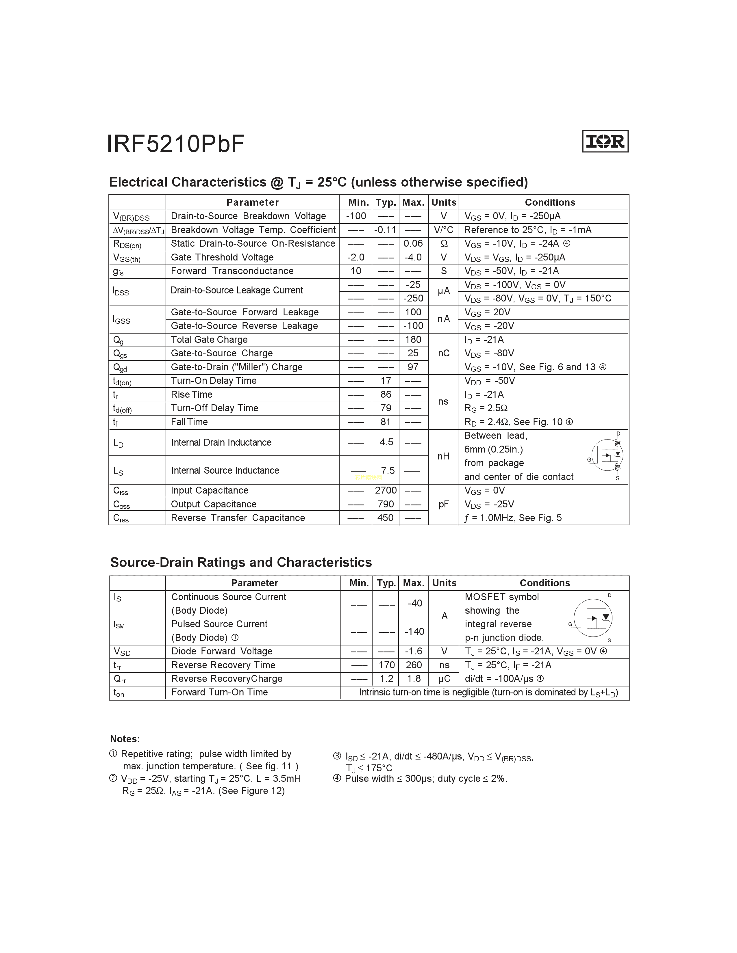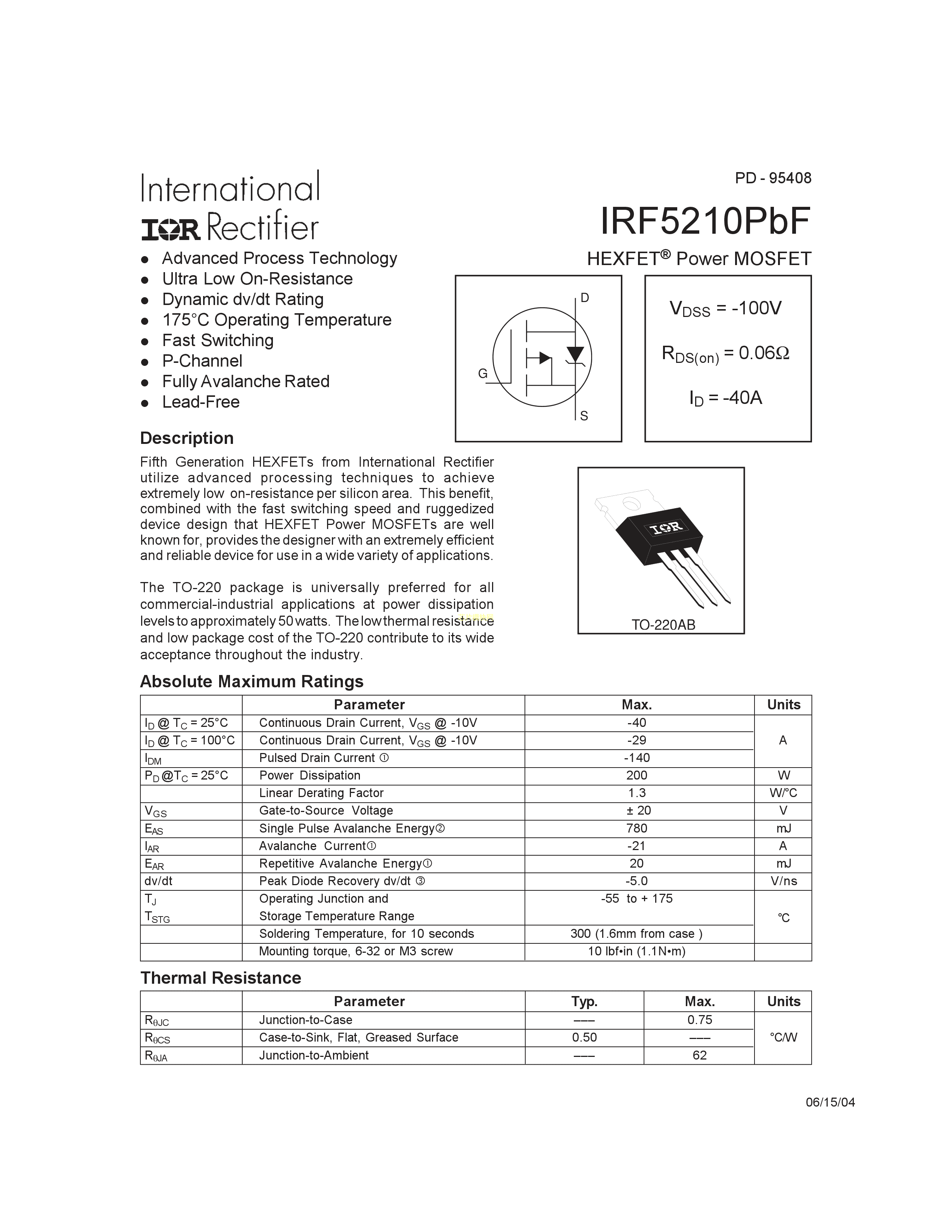 IRF5210PBF数据手册TO-220(TO-220-3)封装Infineon(英飞凌)PDF规格