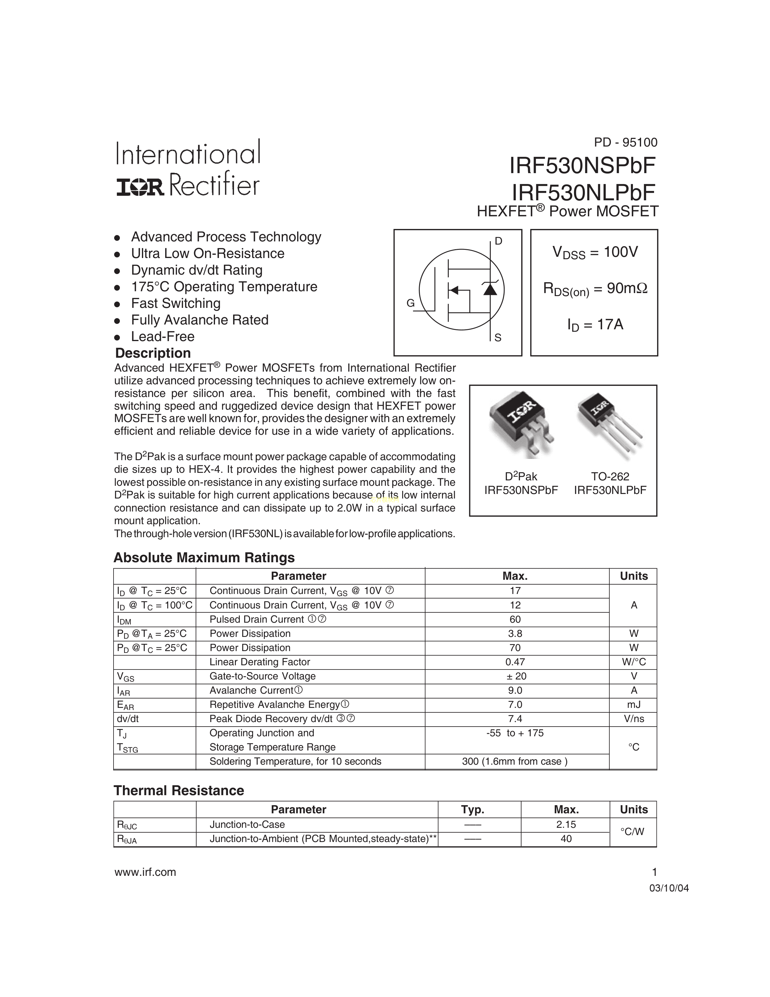 IRF530NSTRLPBF数据手册TO-263-2封装Infineon(英飞凌)PDF规格书,中英