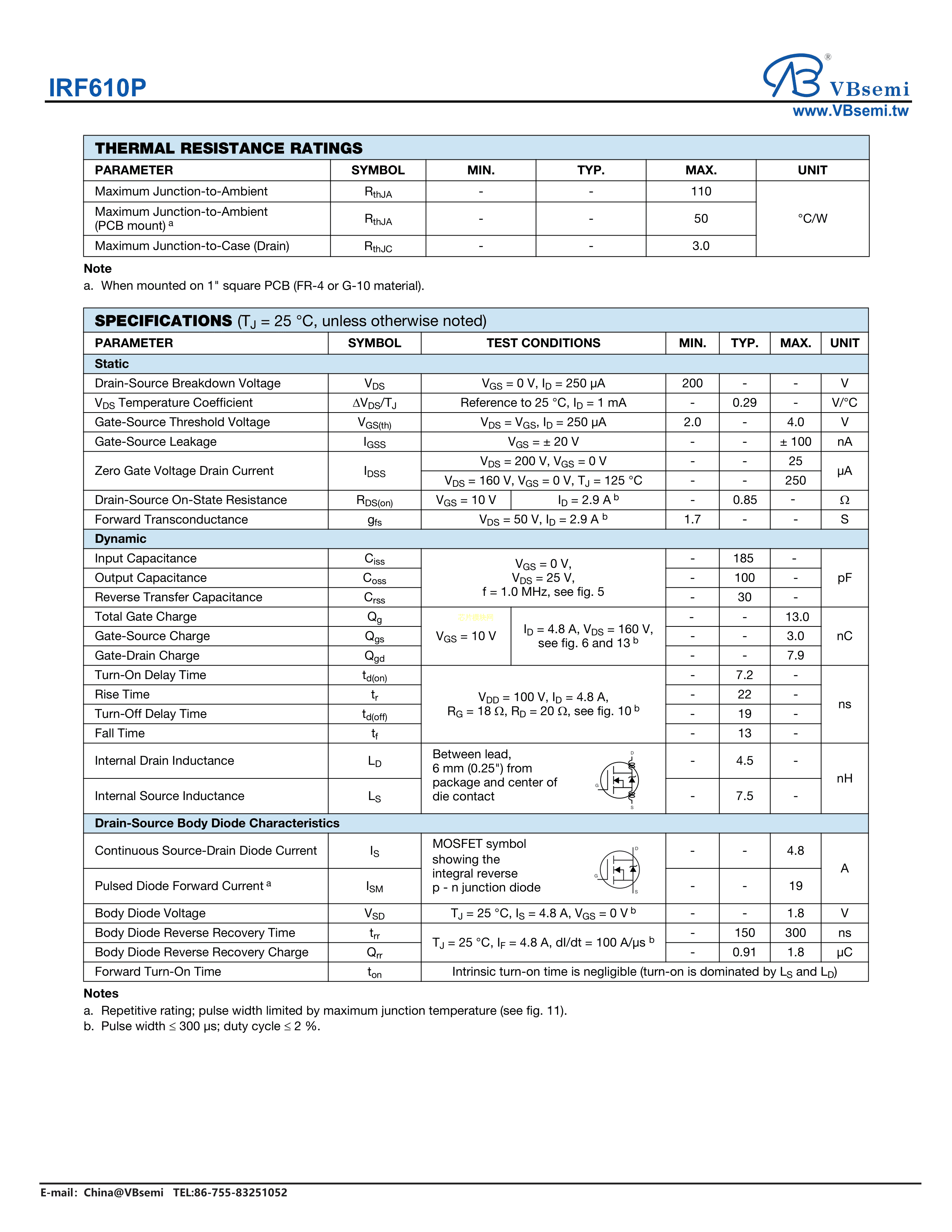 IRF610P数据手册TO-220AB封装VBsemi(台湾微碧)PDF规格书,中英文下载