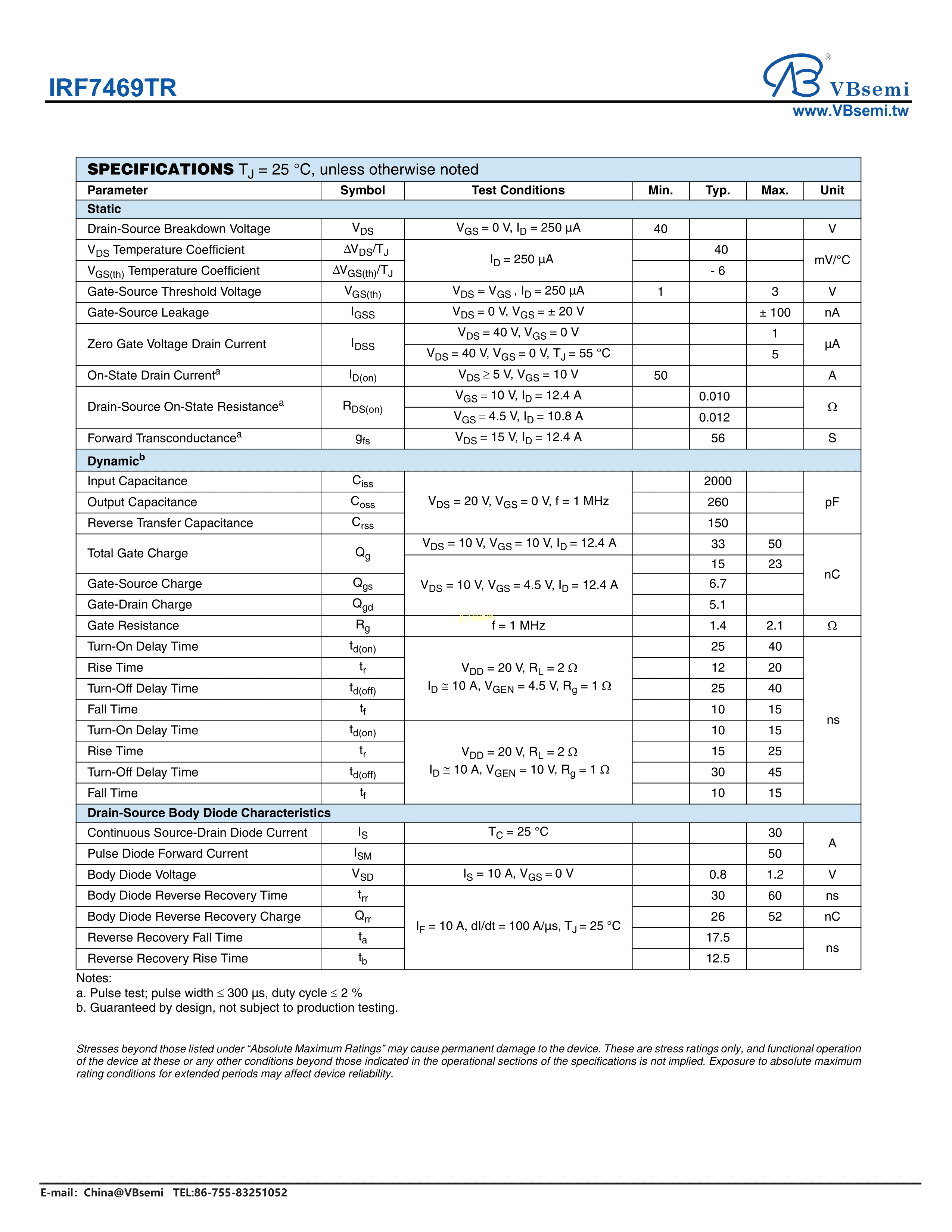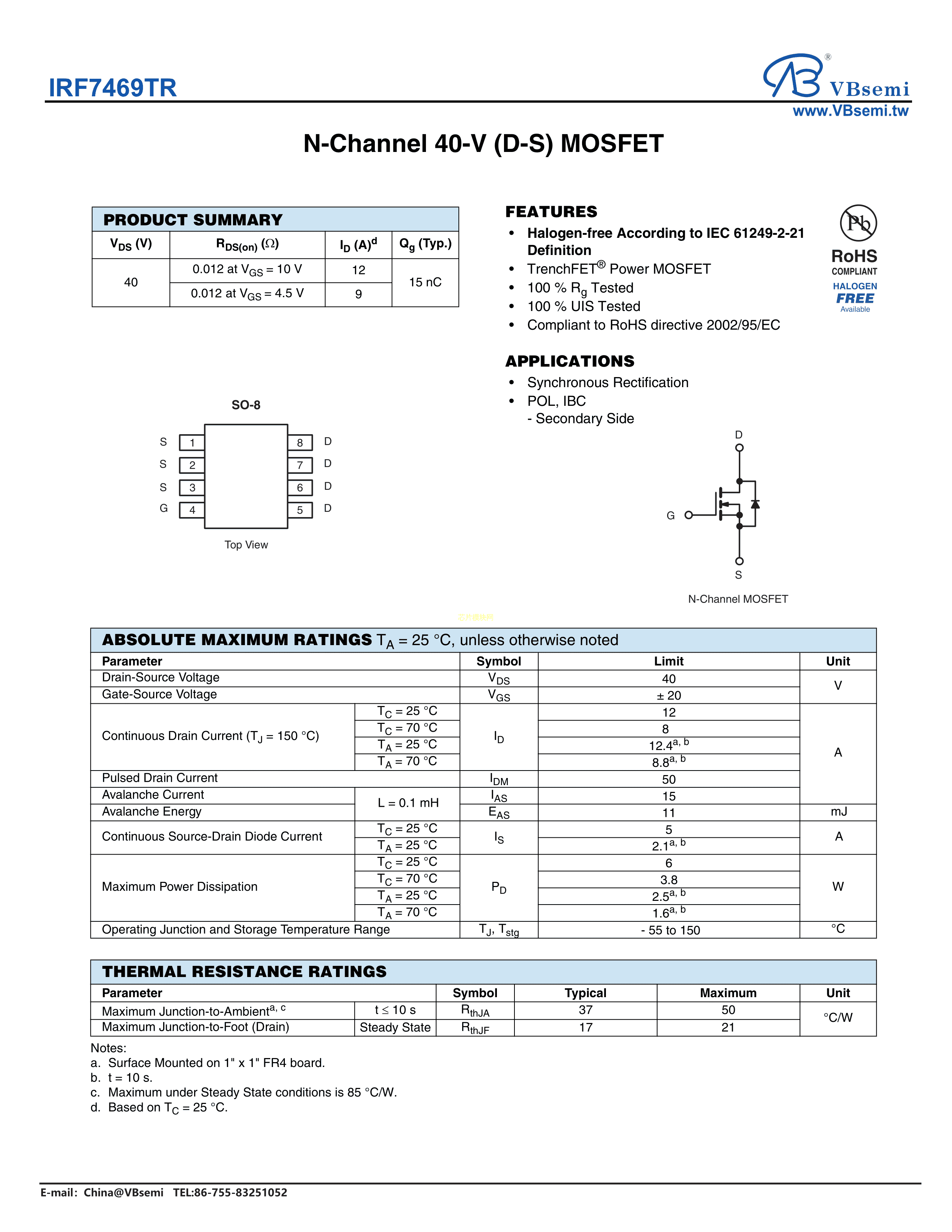 IRF7469TR数据手册SOP-8封装VBsemi(台湾微碧)PDF规格书,中英文下载
