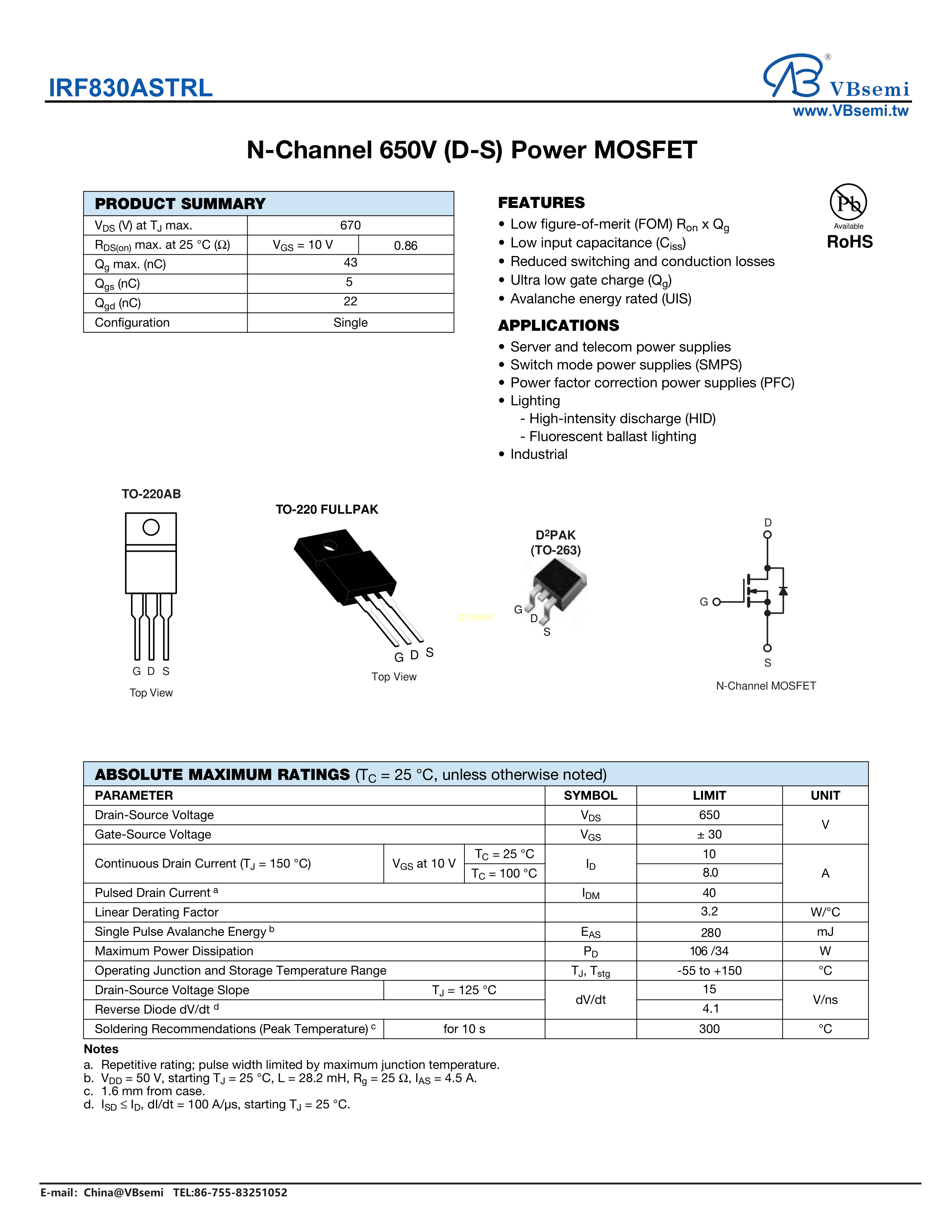 IRF830ASTRL数据手册TO-263封装VBsemi(台湾微碧)PDF规格书,中英文下载