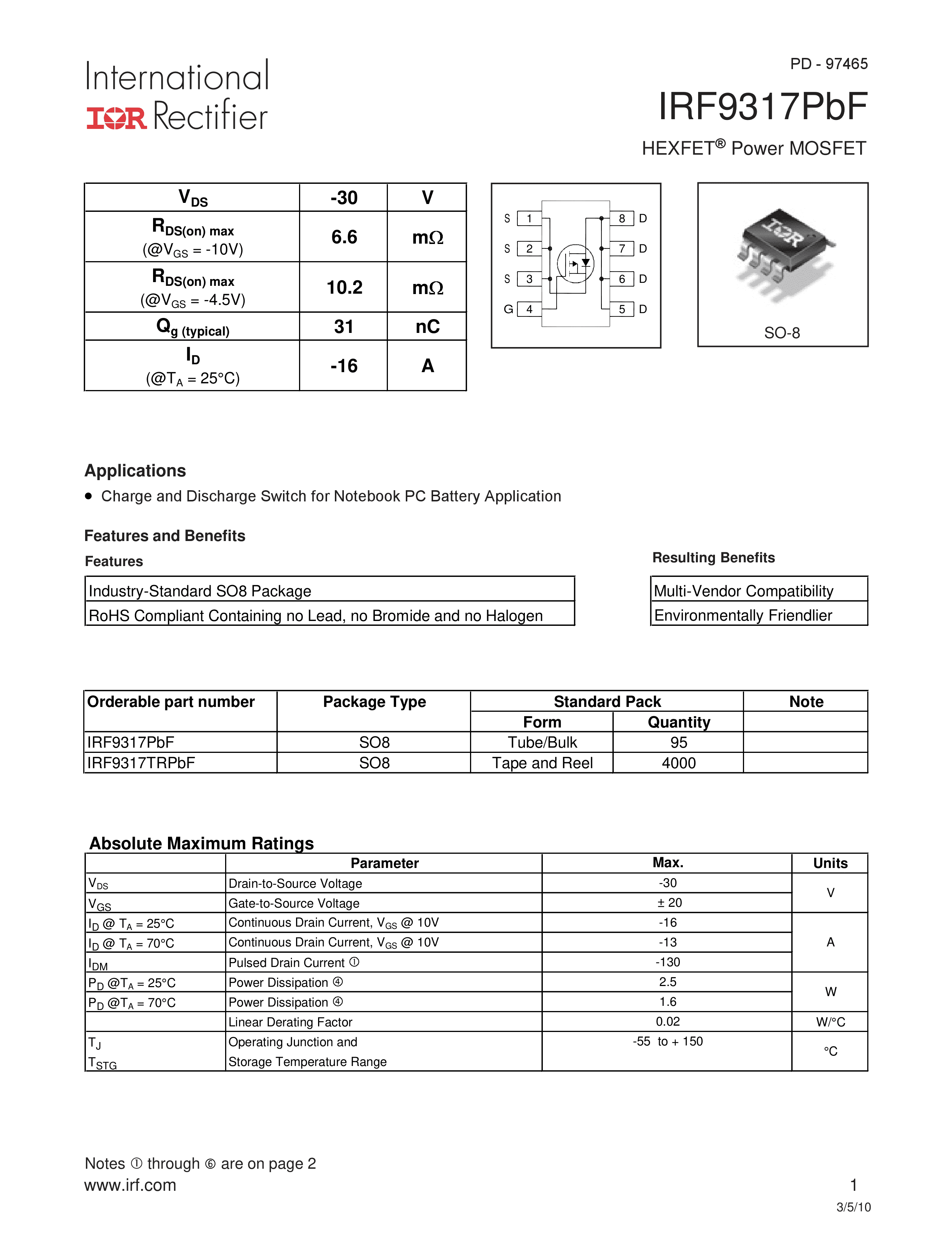 IRF9317TRPBF数据手册SOIC-8_150mil封装Infineon(英飞凌)PDF规格书