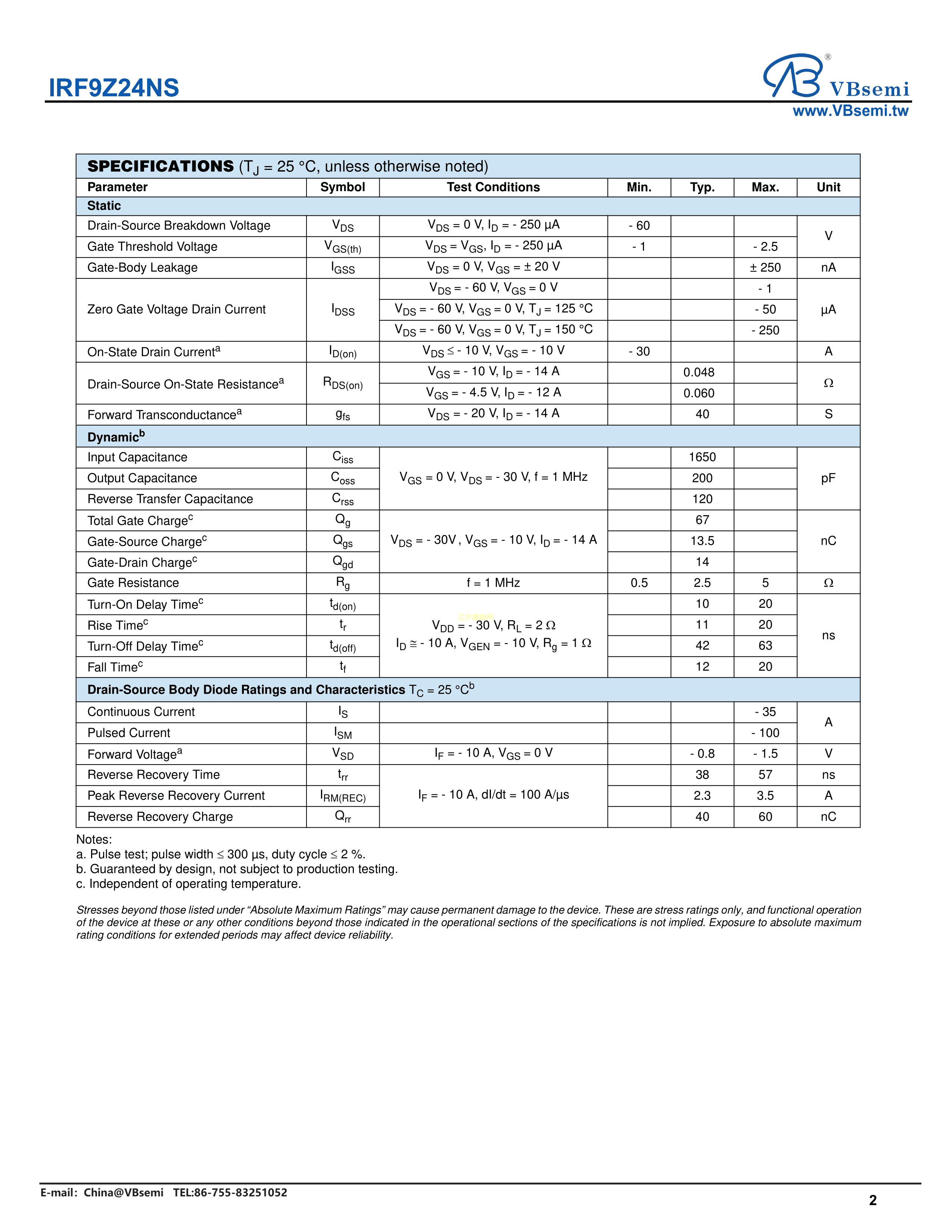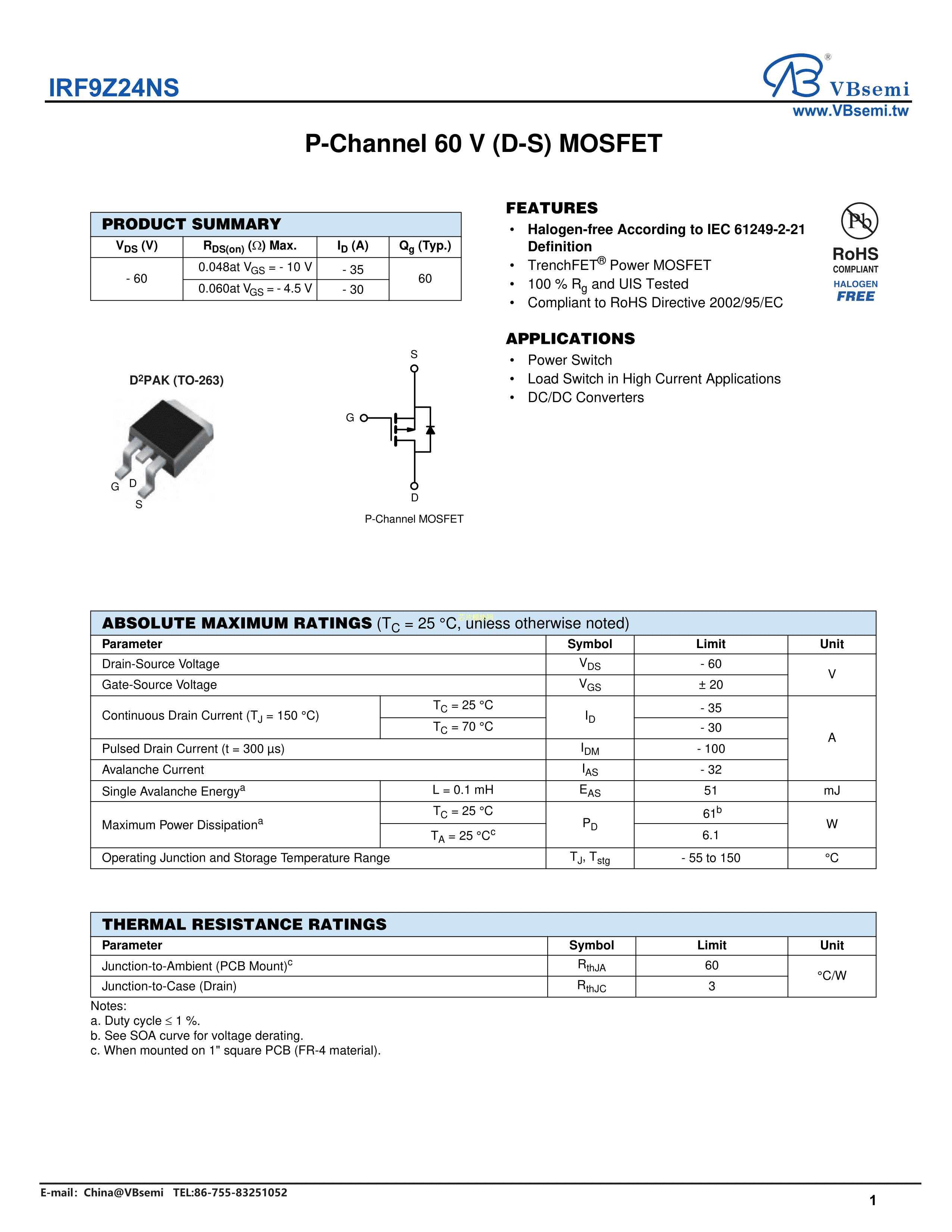 IRF9Z24NS数据手册TO-263封装VBsemi(台湾微碧)PDF规格书,中英文下载