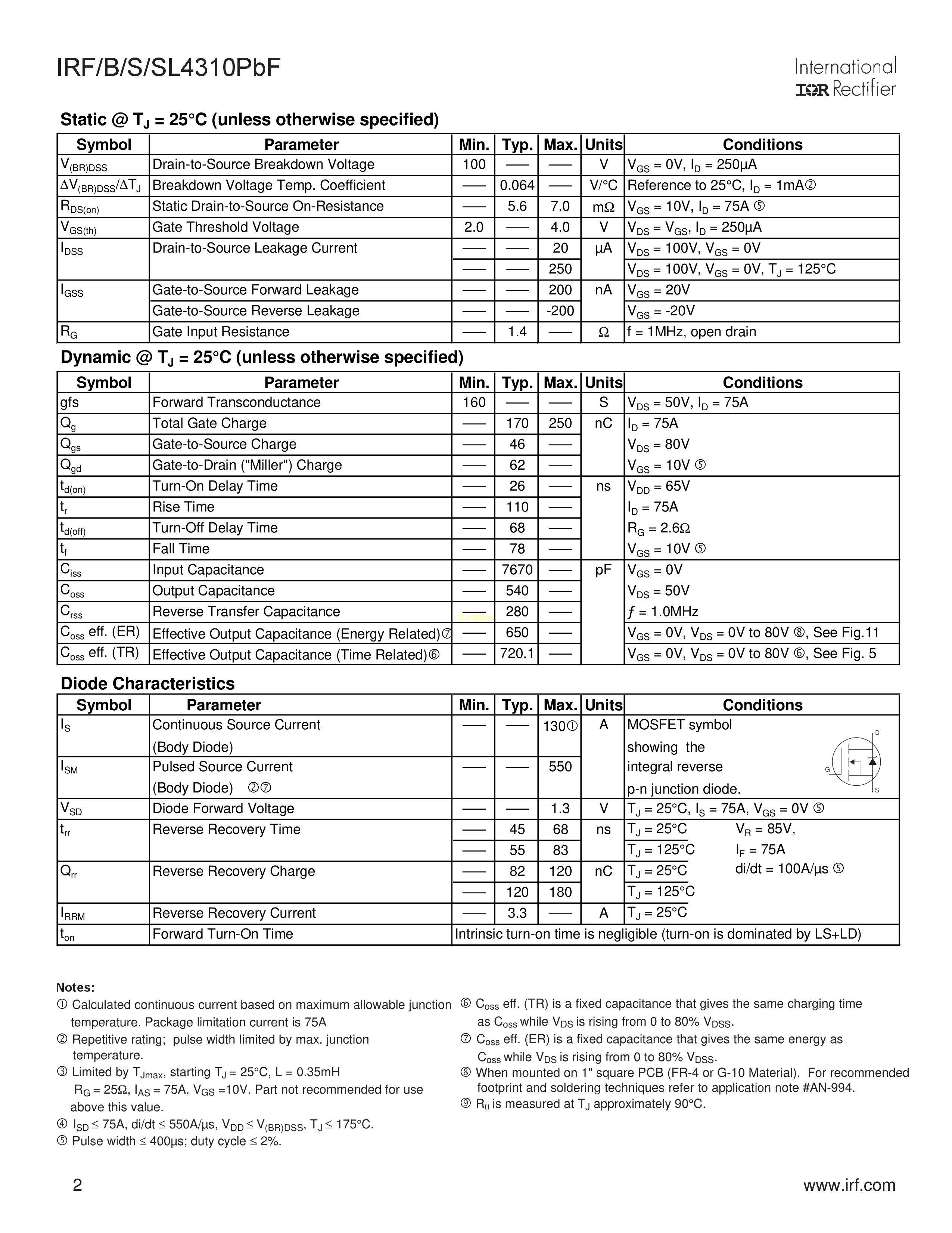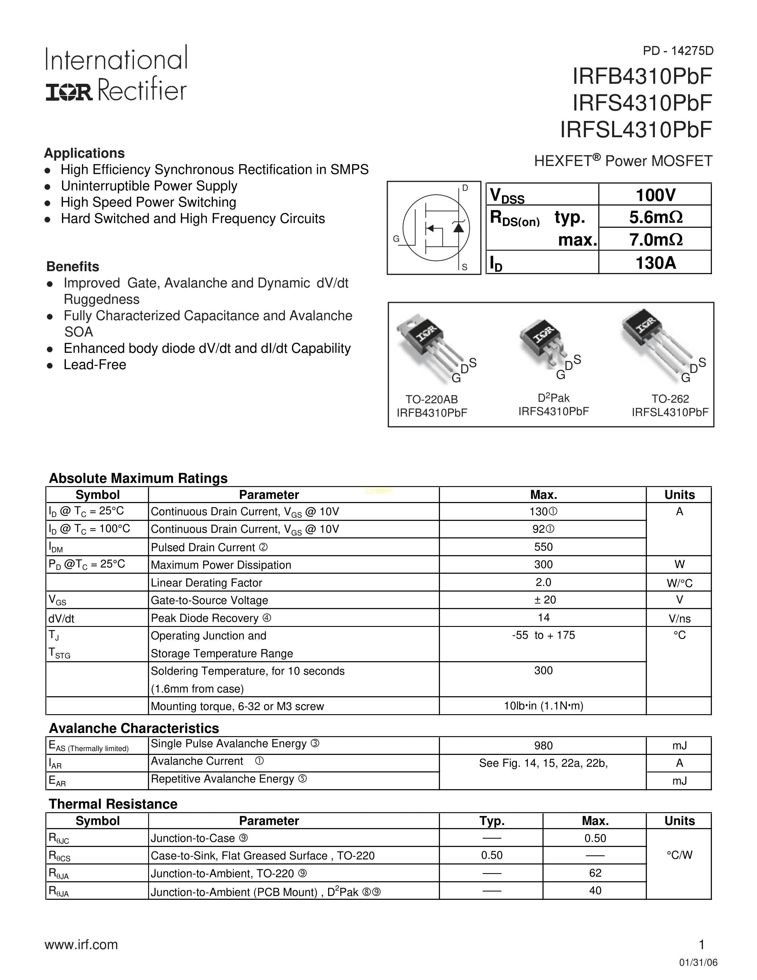 IRFB4310PBF数据手册TO-220AB封装Infineon(英飞凌)PDF规格书,中英文下载