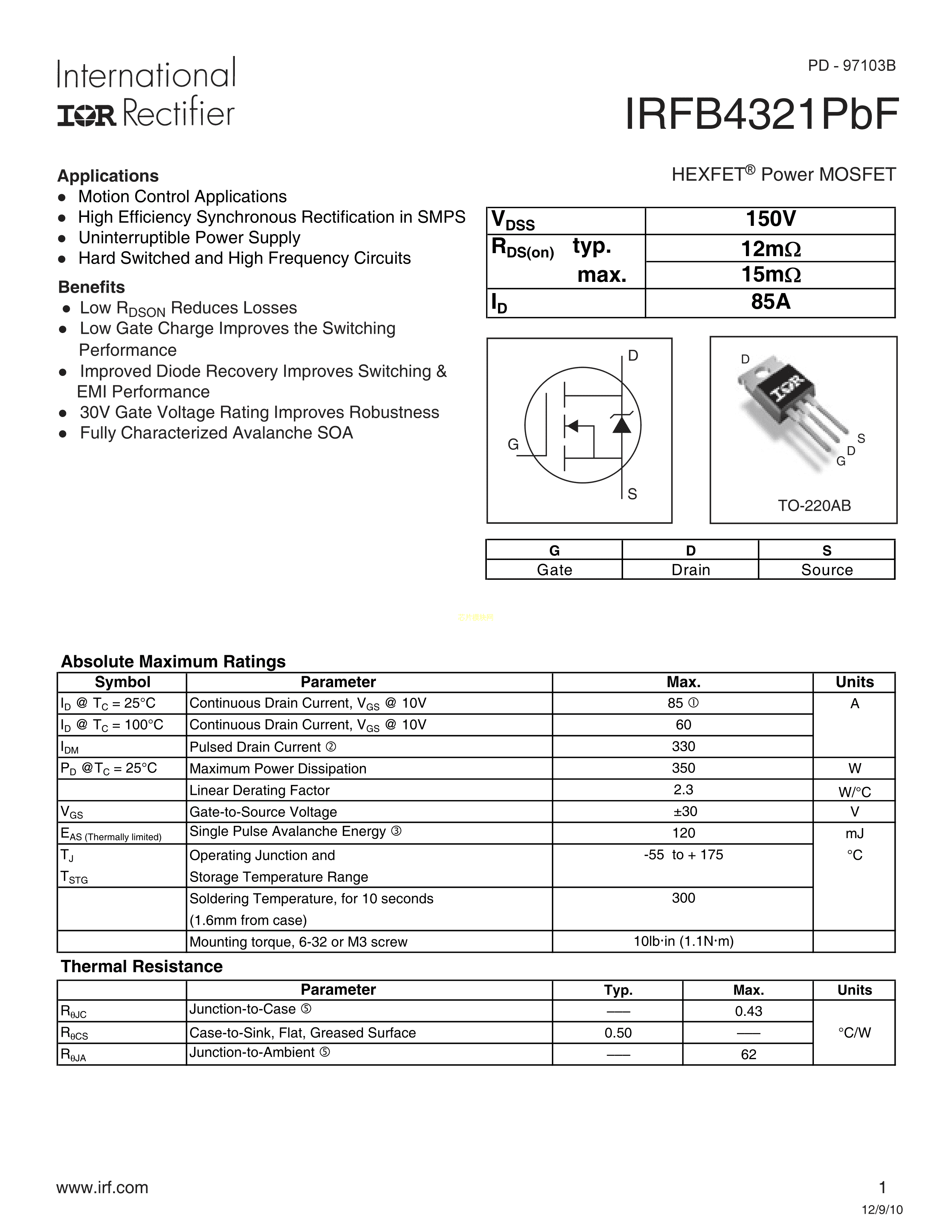 IRFB4321PBF数据手册TO-220(TO-220-3)封装Infineon(英飞凌)PDF规