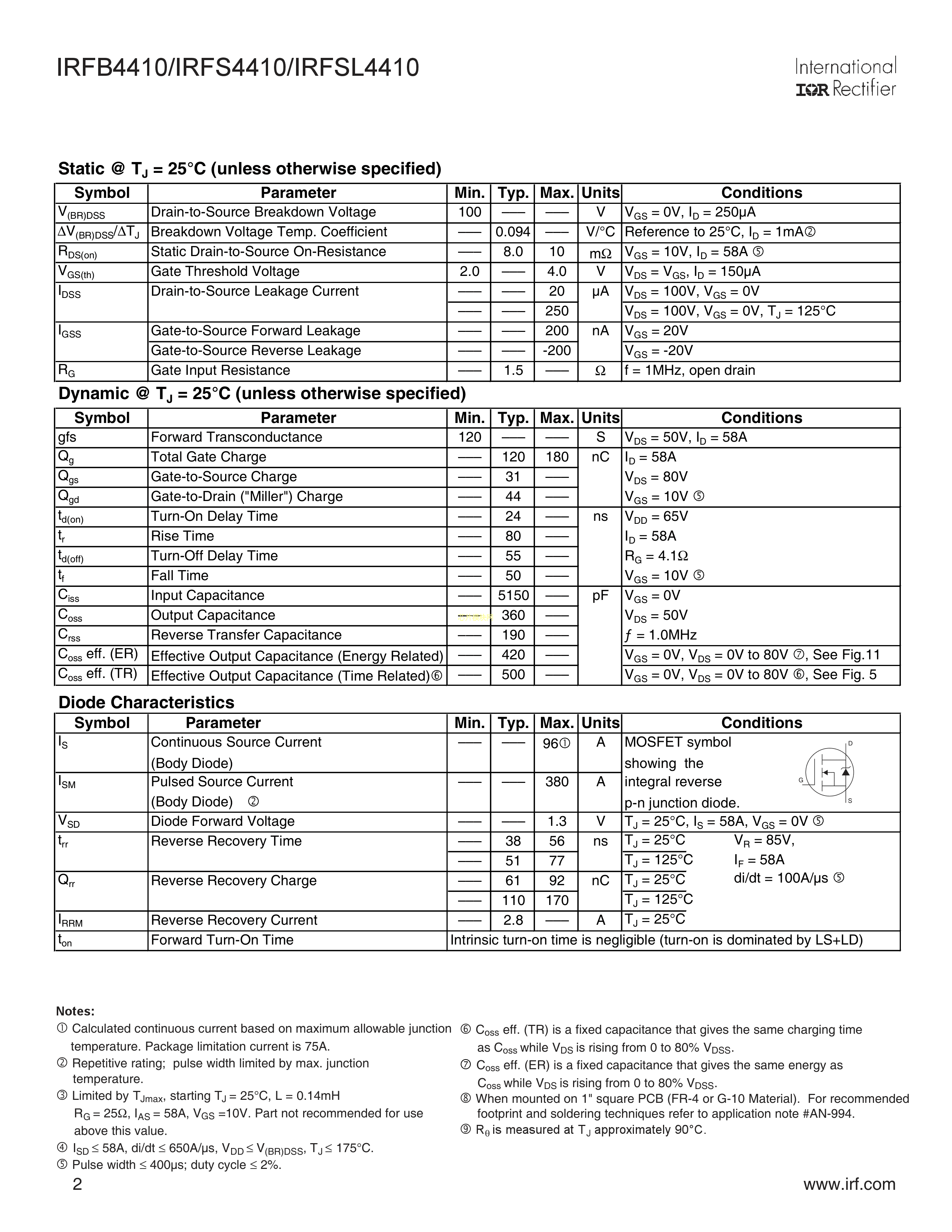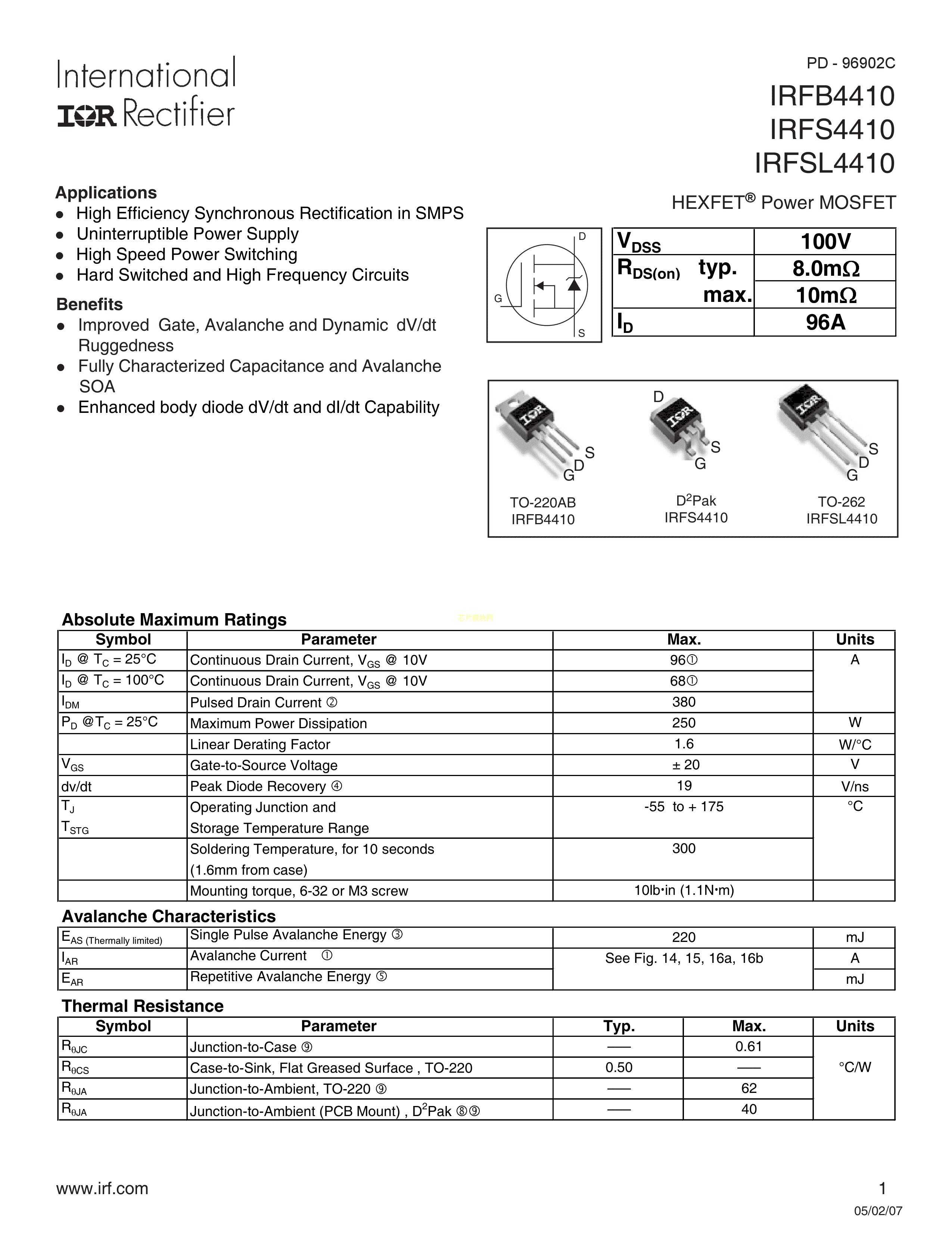 IRFB4410PBF数据手册TO-220(TO-220-3)封装Infineon(英飞凌)PDF规