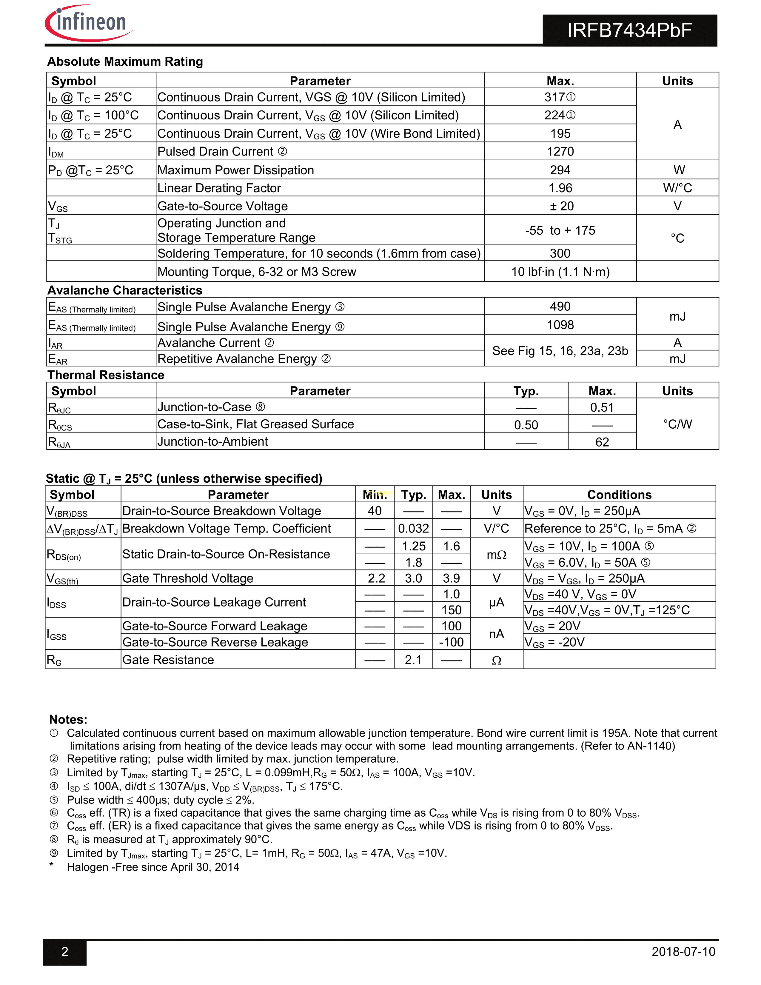 IRFB7434PBF数据手册TO-220-3封装Infineon(英飞凌)PDF规格书,中英文下载