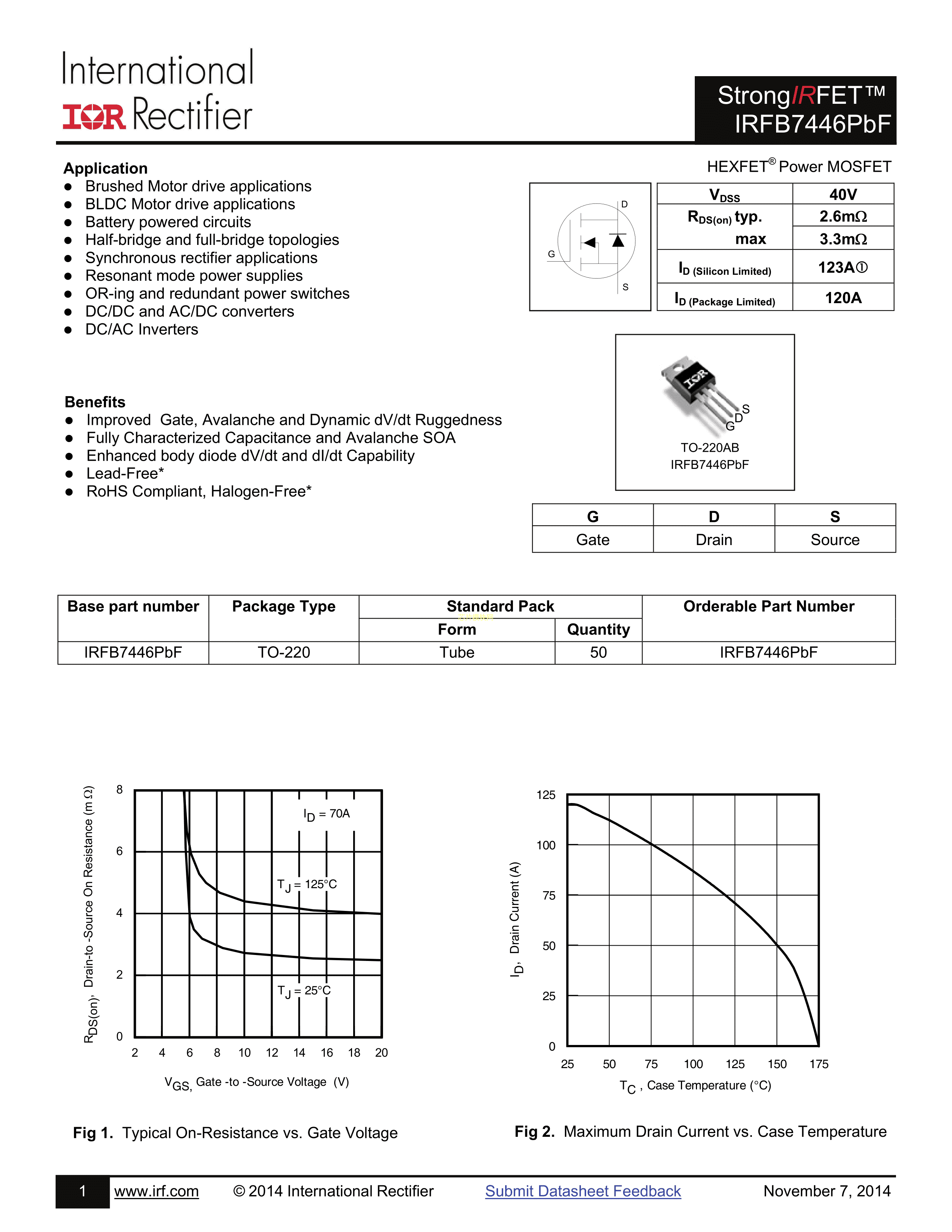 IRFB7446PBF数据手册TO-220AB封装Infineon(英飞凌)PDF规格书,中英文下载