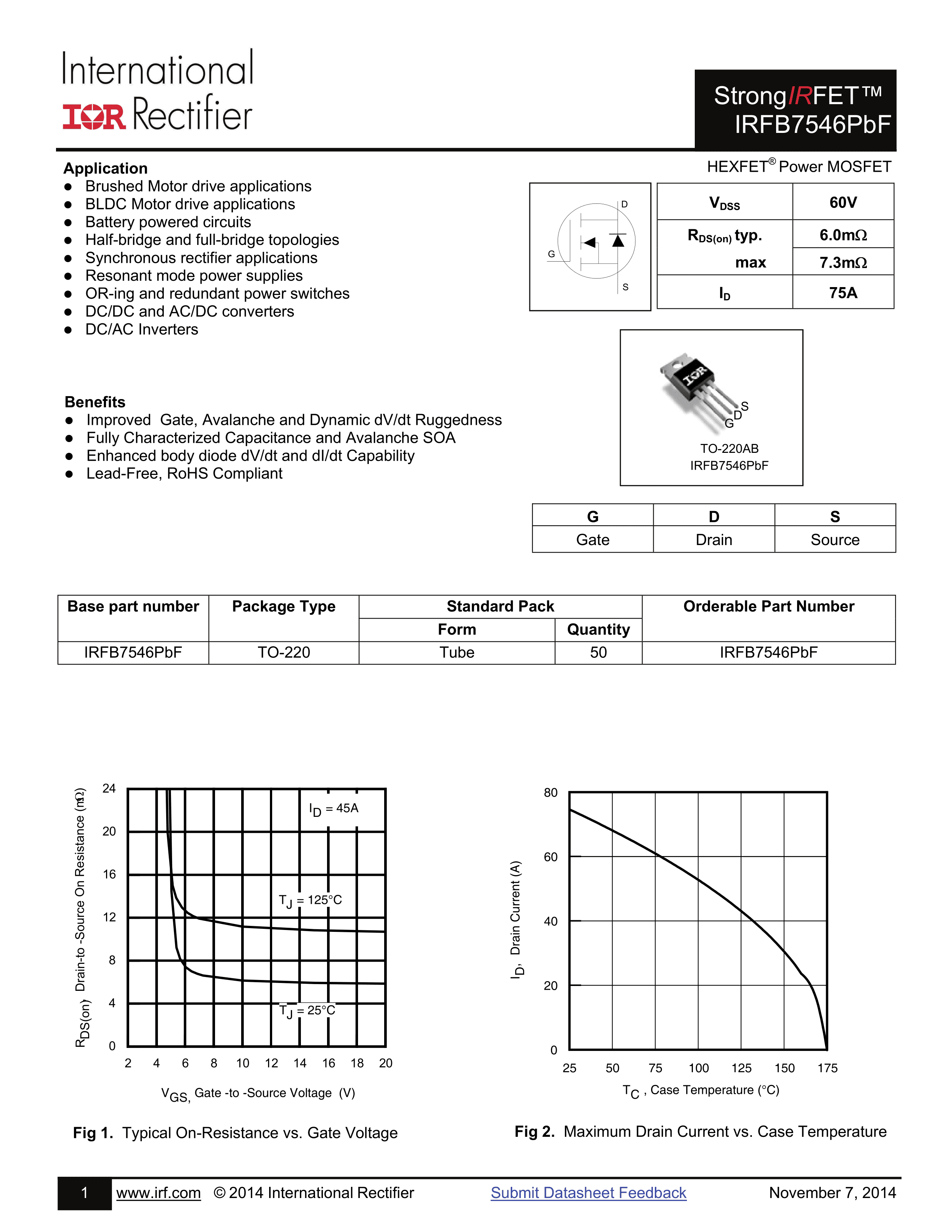 IRFB7546PBF数据手册TO-220封装Infineon(英飞凌)PDF规格书,中英文下载