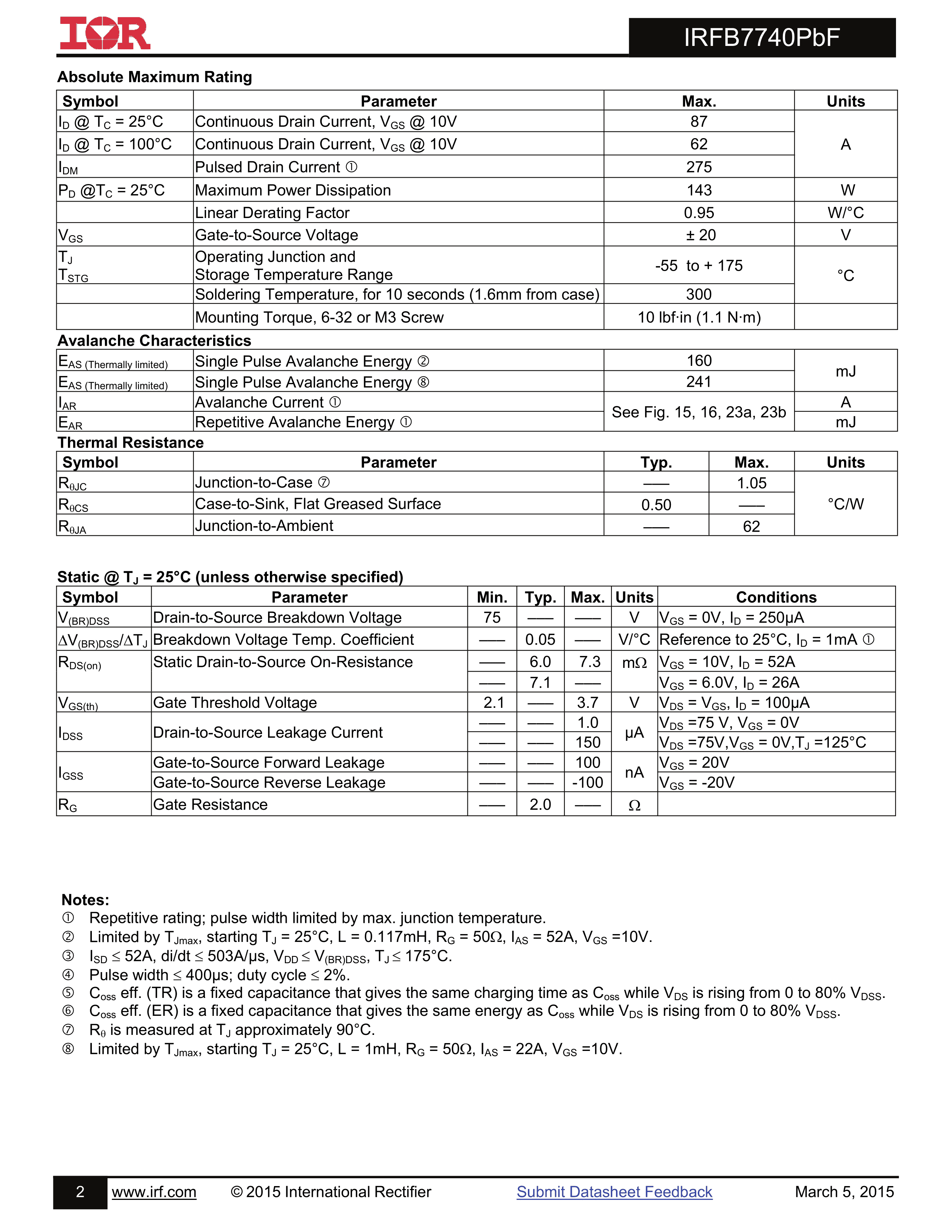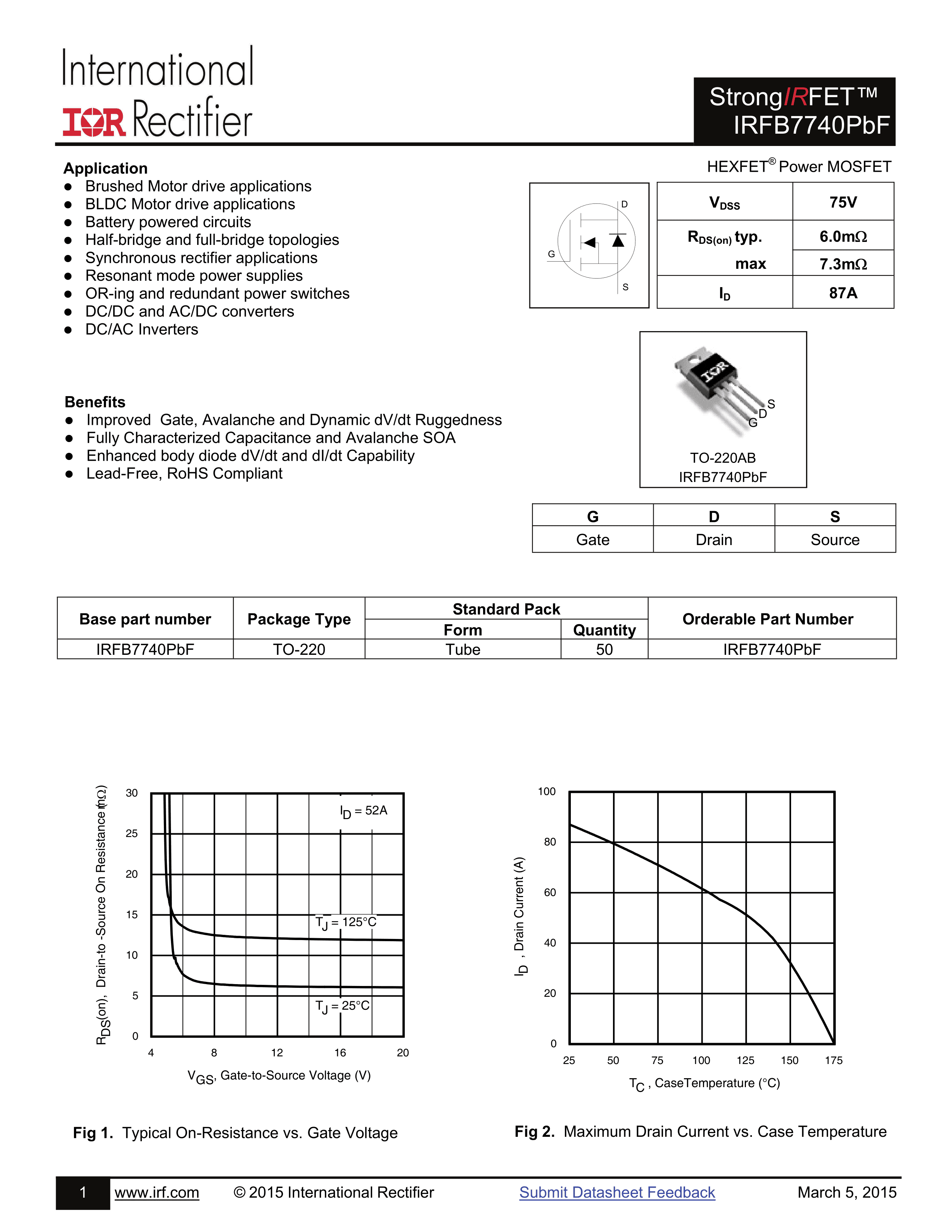 IRFB7740PBF数据手册TO-220封装Infineon(英飞凌)PDF规格书,中英文下载