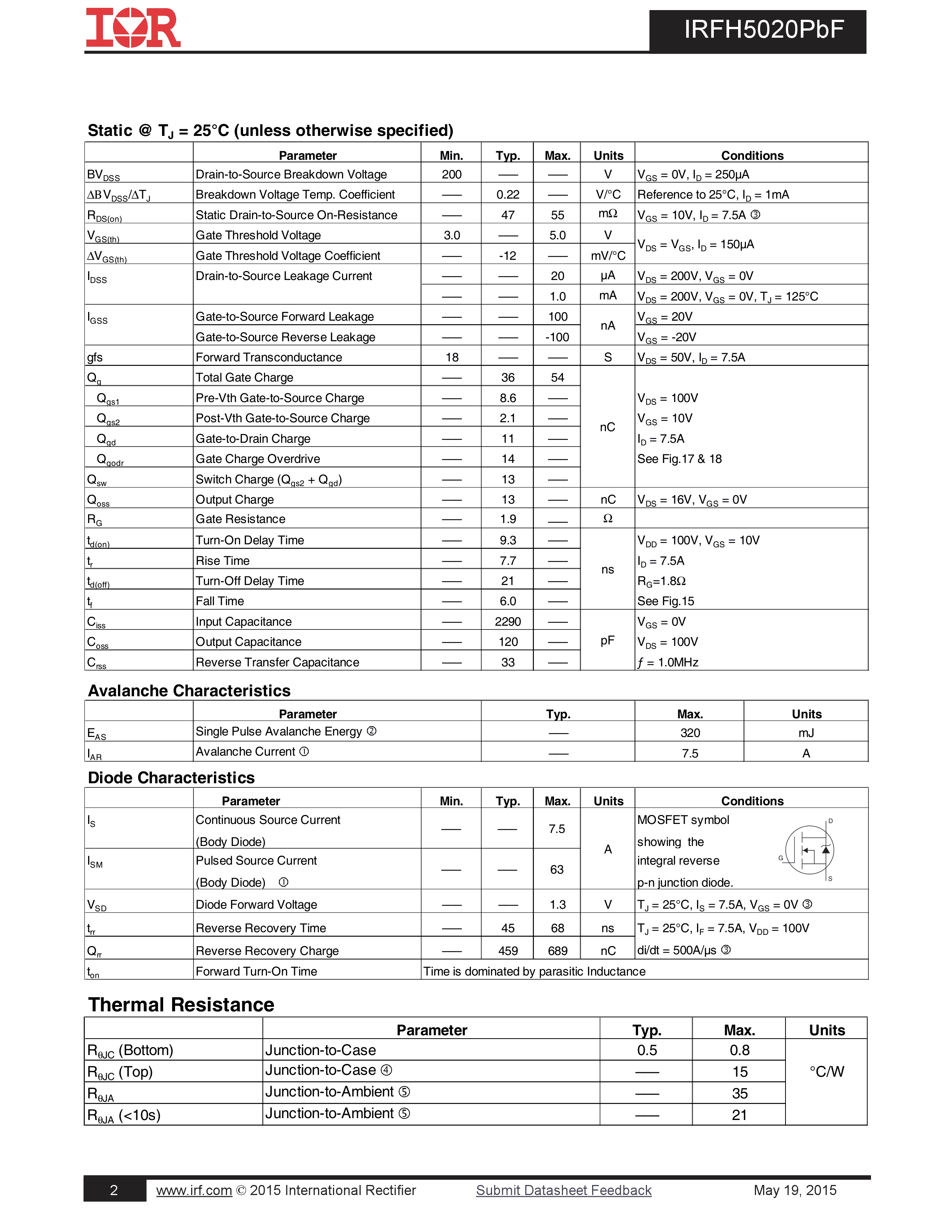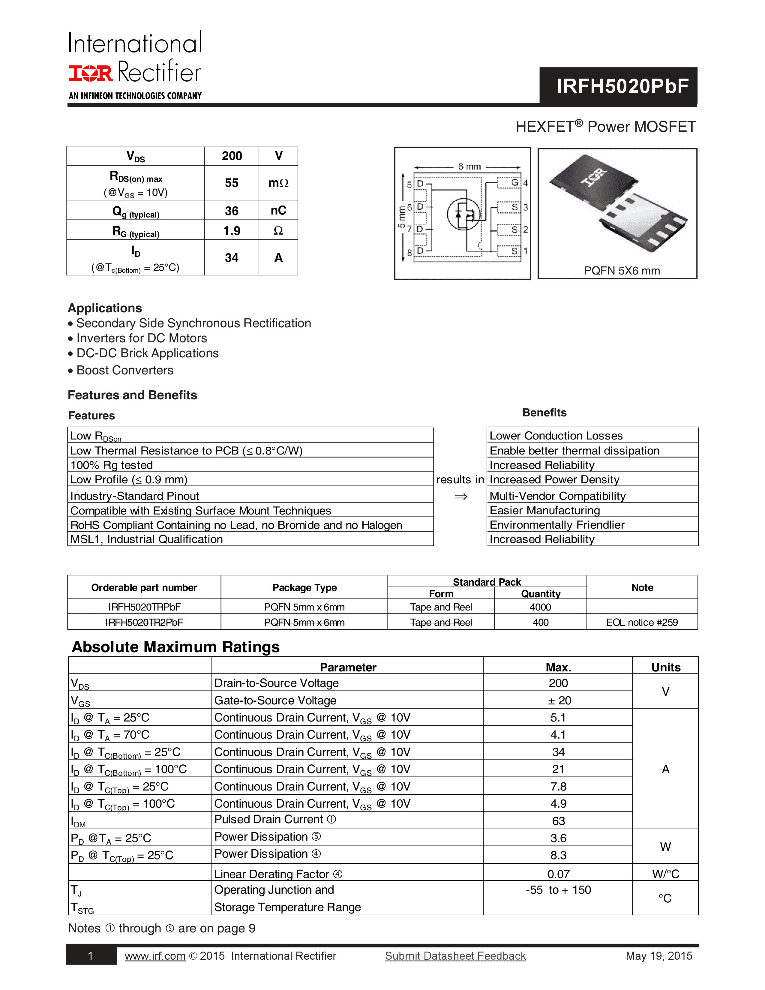 IRFH5020TRPBF数据手册PQFN5x6封装Infineon(英飞凌)PDF规格书,中英文下