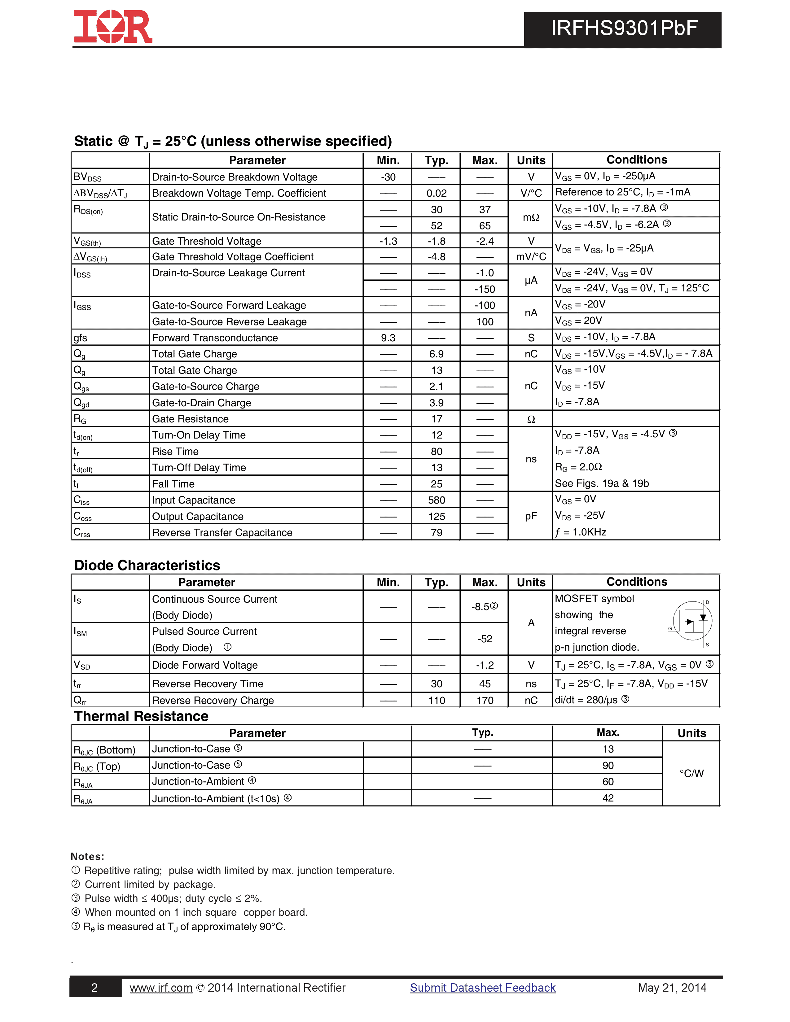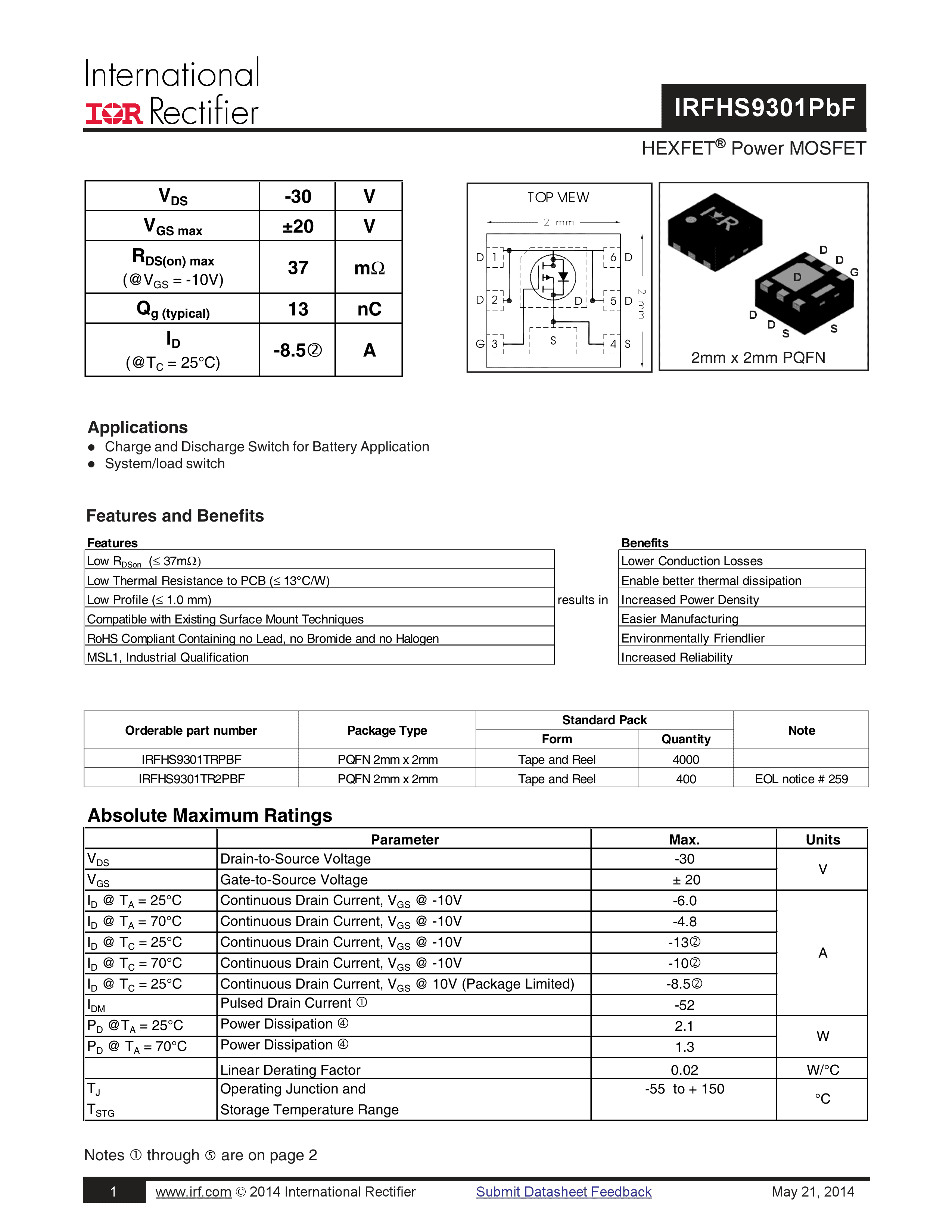 IRFHS9301TRPBF数据手册PG-TSDSON-6封装Infineon(英飞凌)PDF规格书