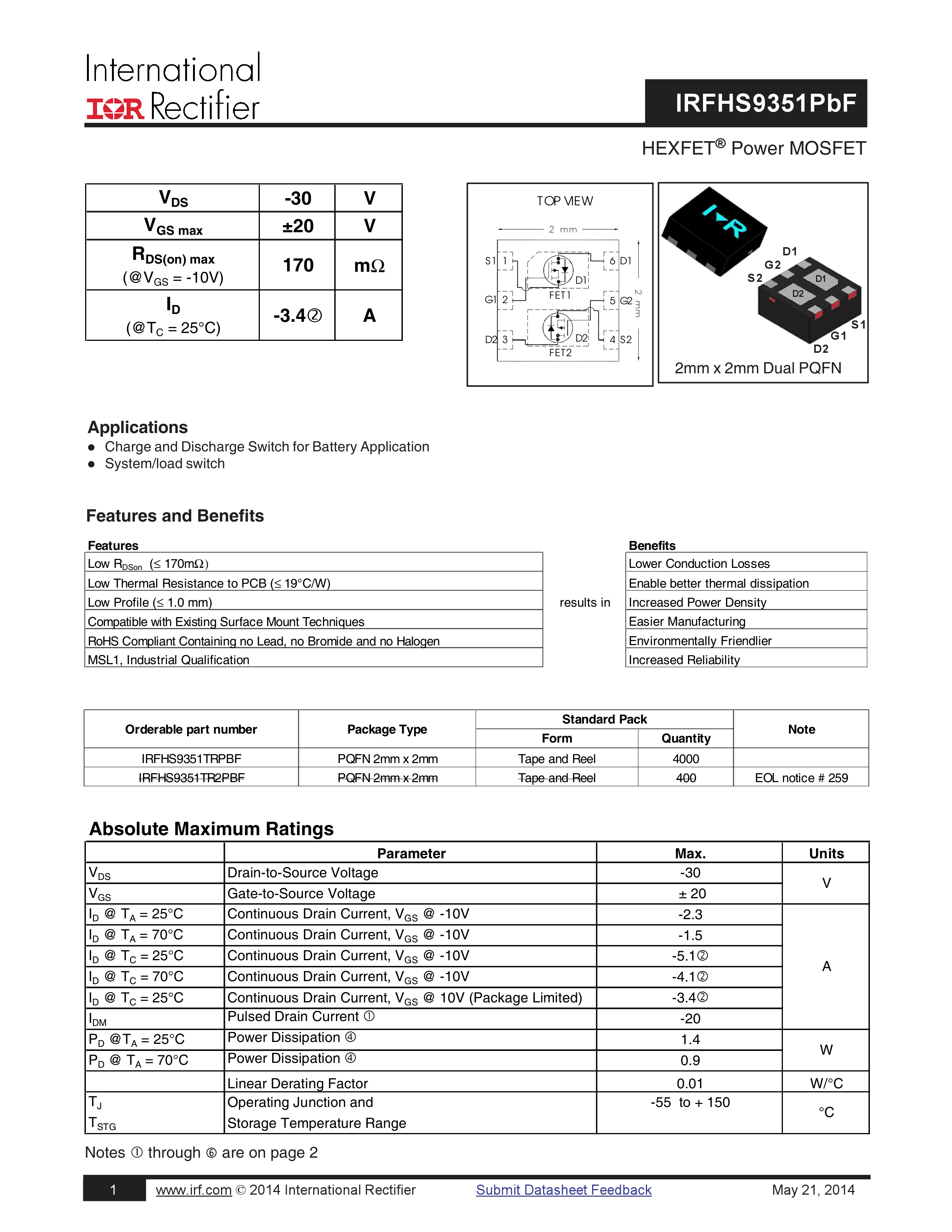 IRFHS9351TRPBF数据手册PG-TSDSON-6封装Infineon(英飞凌)PDF规格书