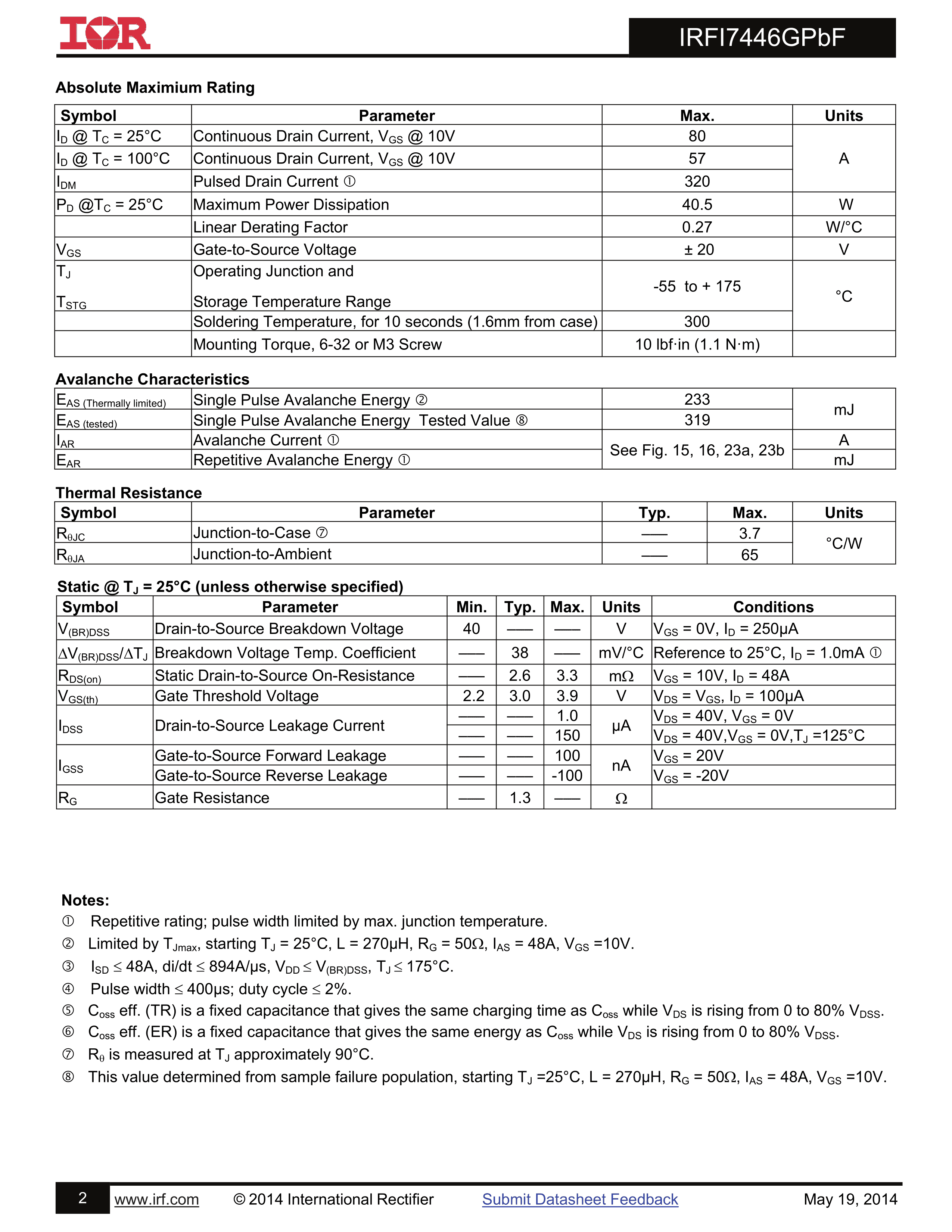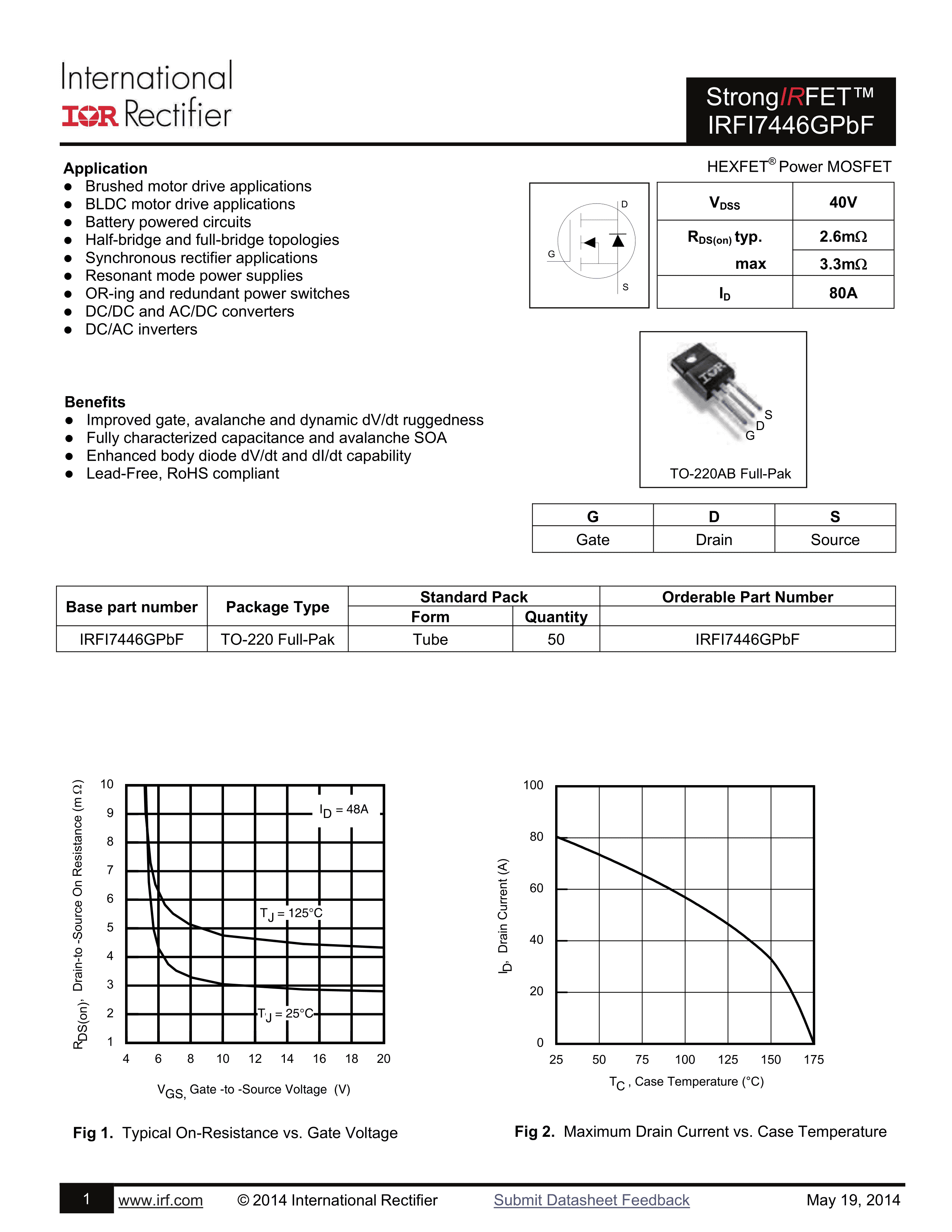 IRFI7446GPBF数据手册TO-220AB-3封装Infineon(英飞凌)PDF规格书,中英