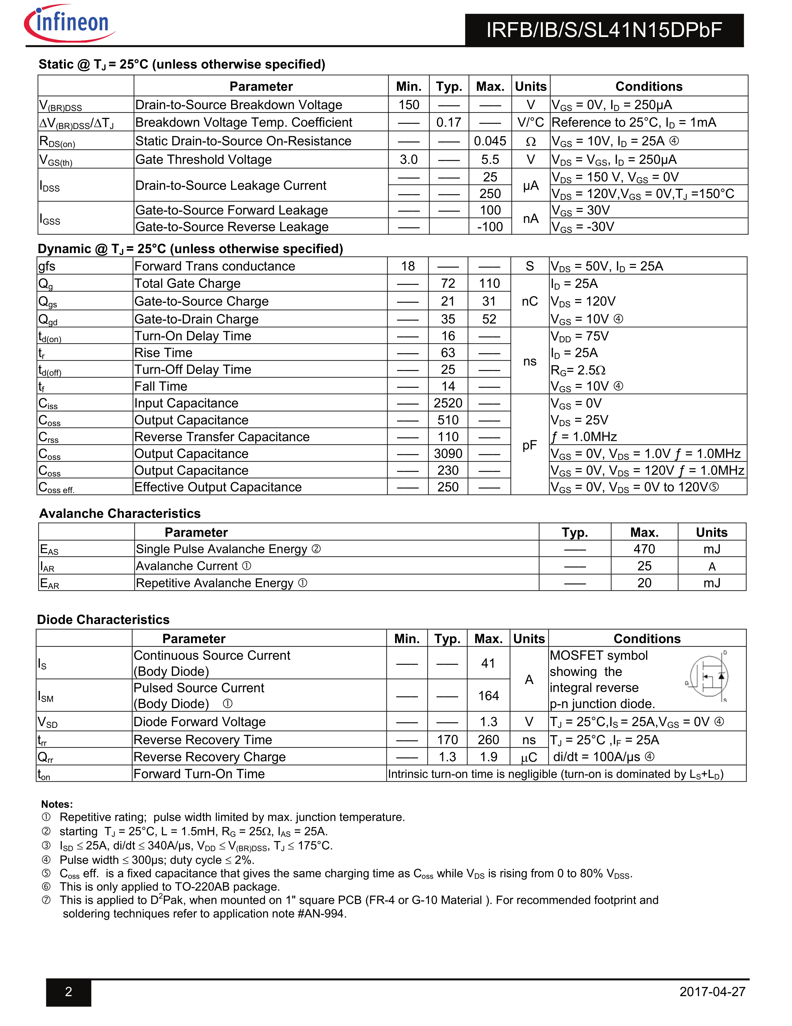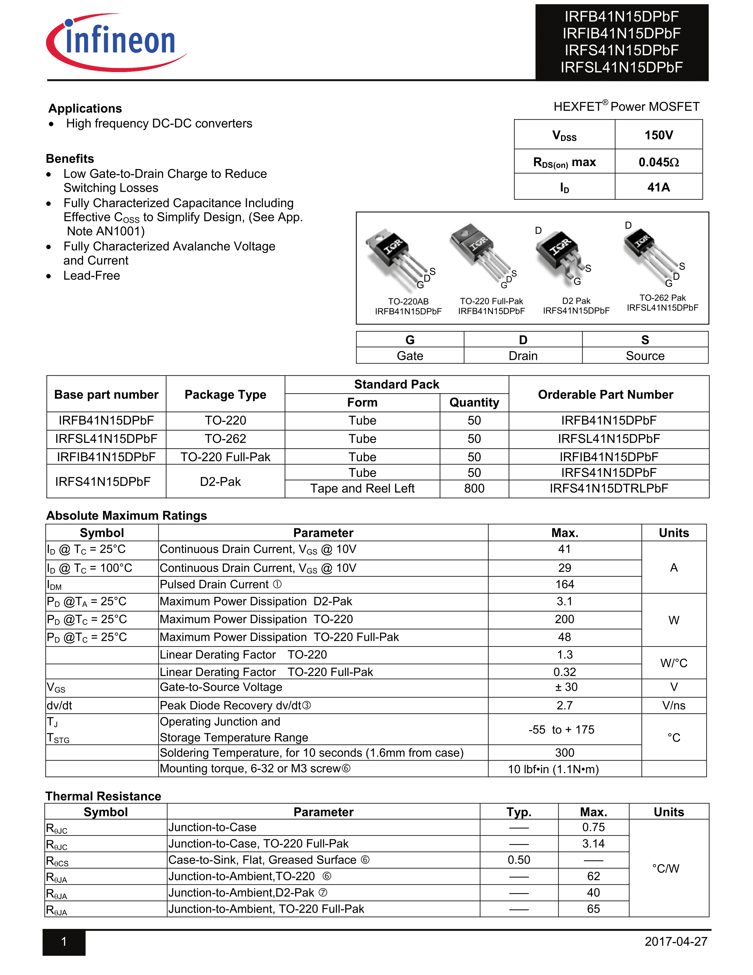 IRFIB41N15DPBF数据手册TO-220F封装Infineon(英飞凌)PDF规格书,中英文