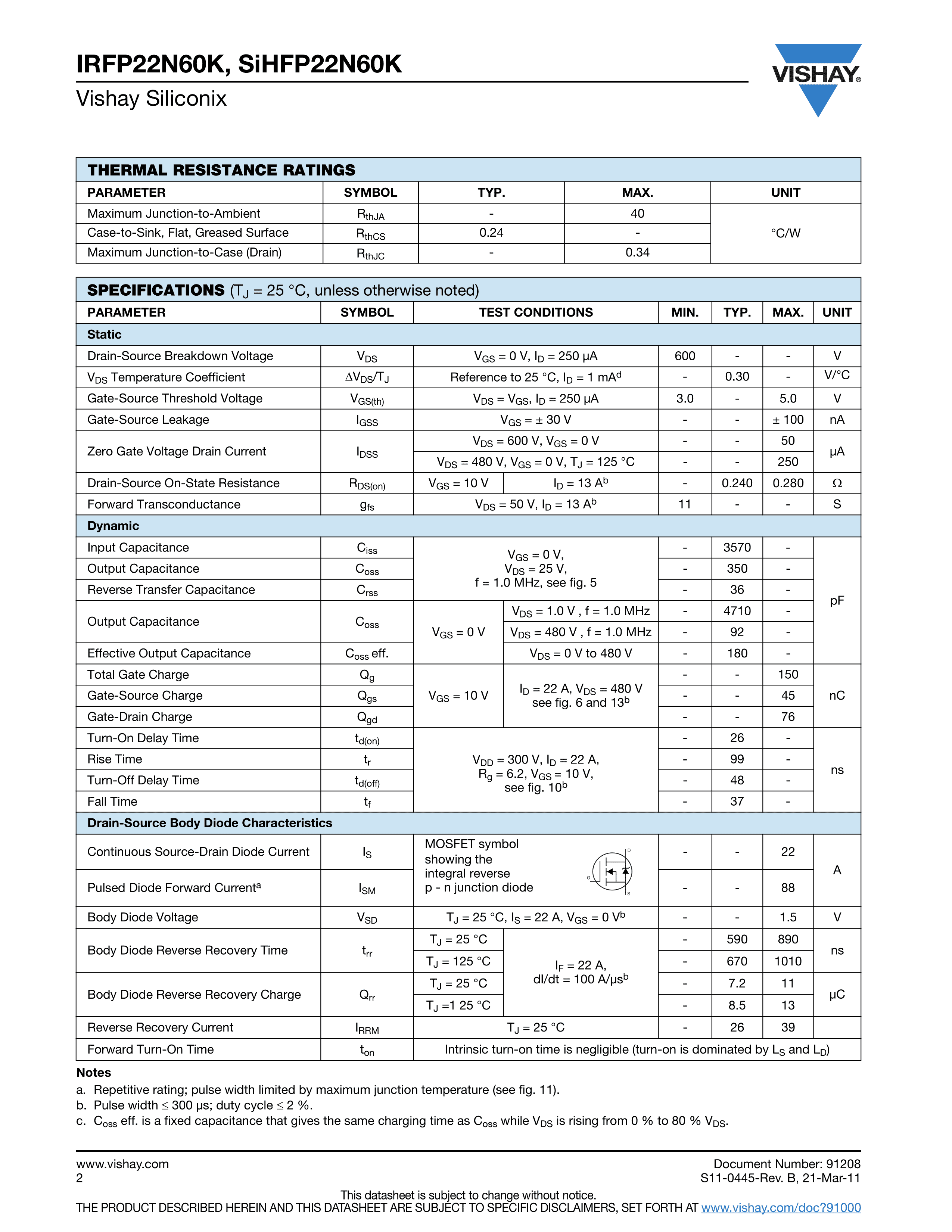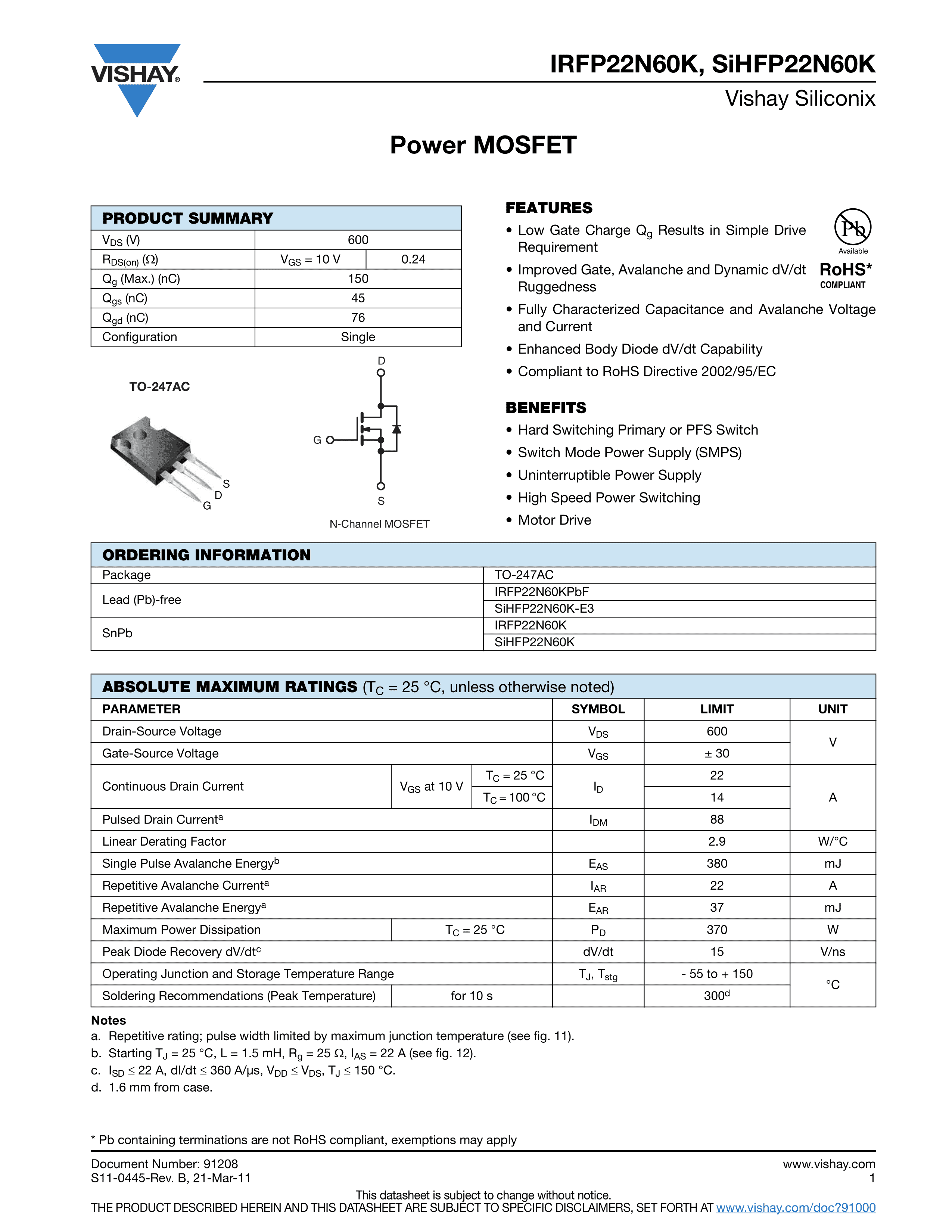 IRFP22N60KPBF数据手册TO-247AC封装VISHAY(威世)PDF规格书,中英文下载