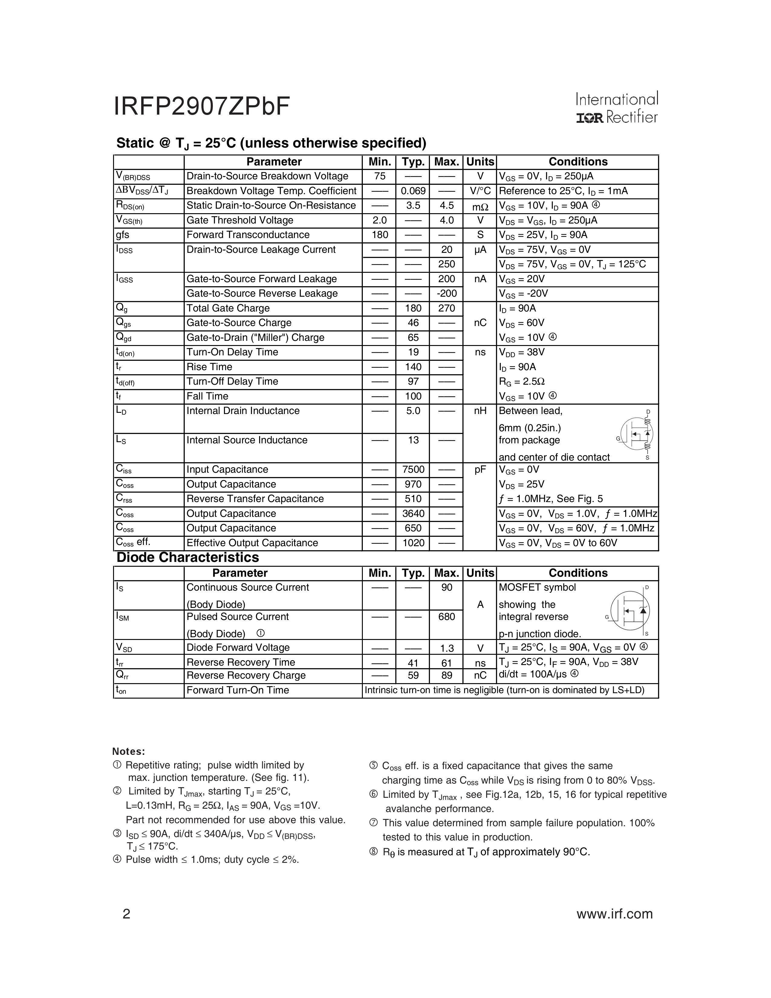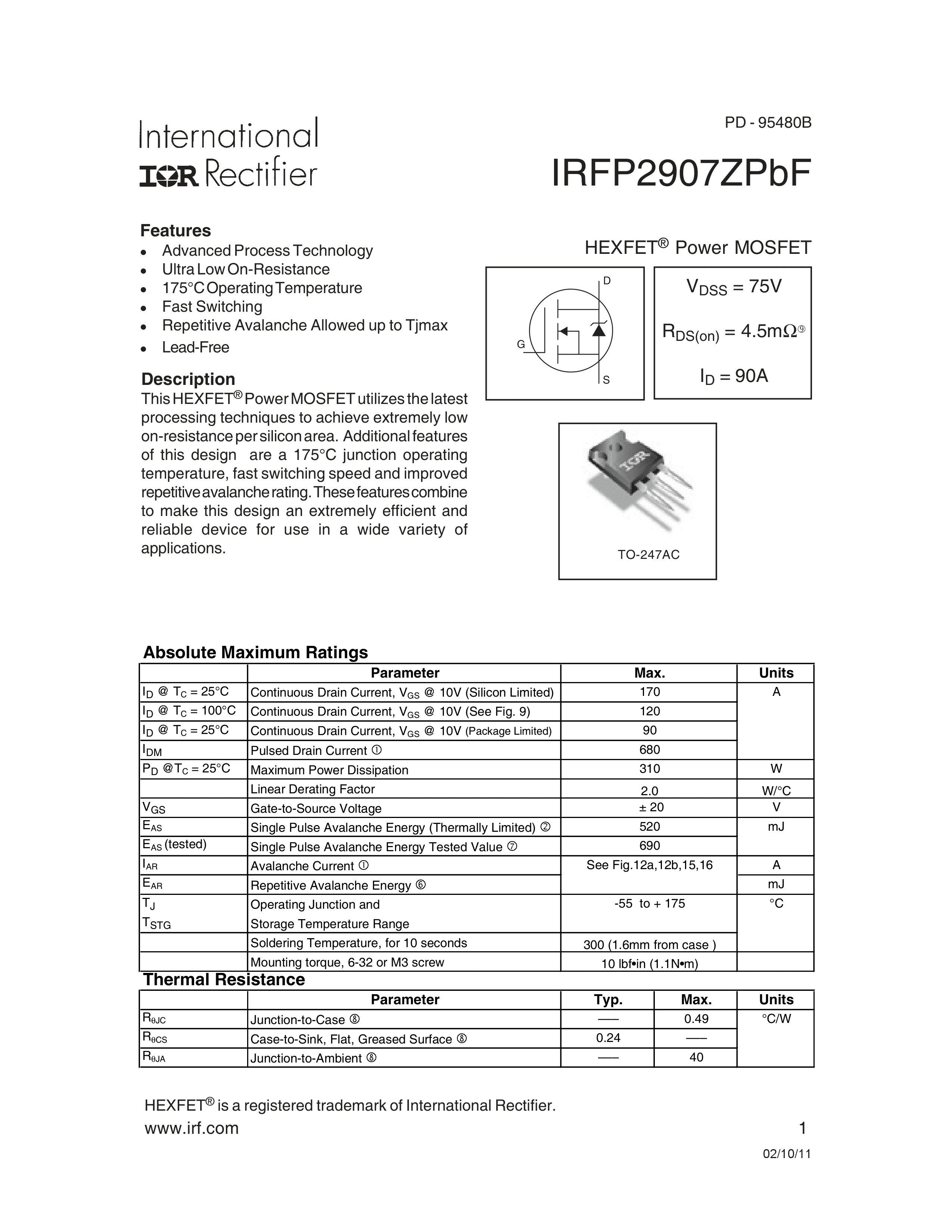 IRFP2907ZPBF数据手册TO-247封装Infineon(英飞凌)PDF规格书,中英文下载