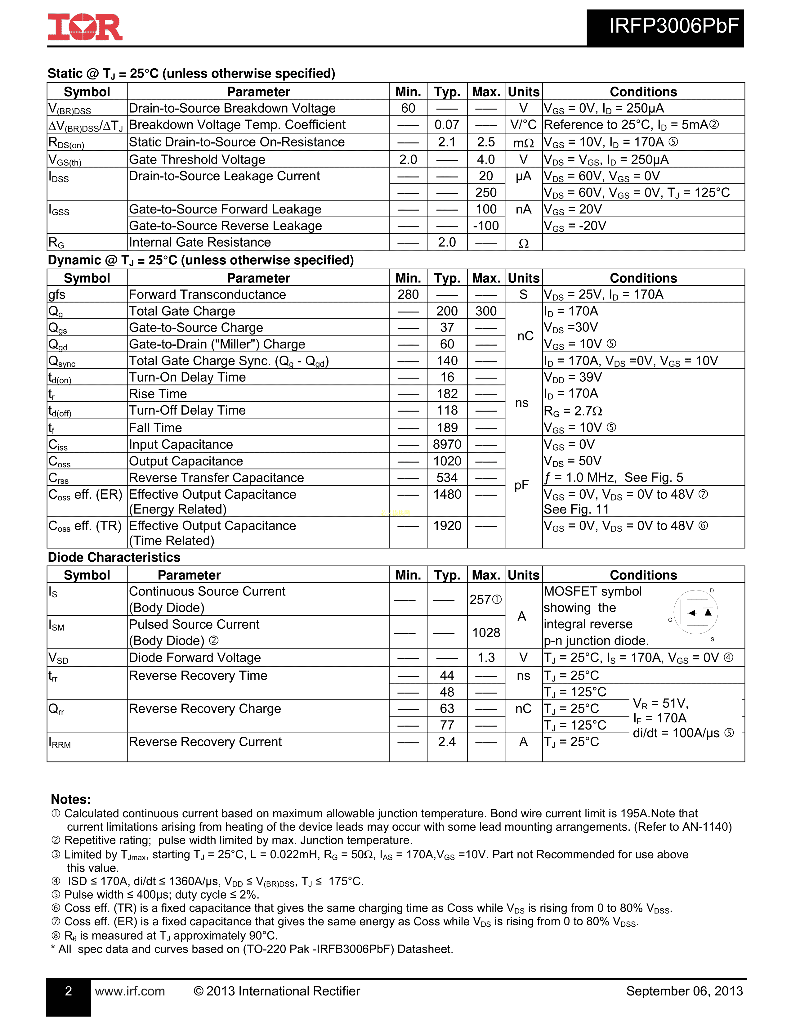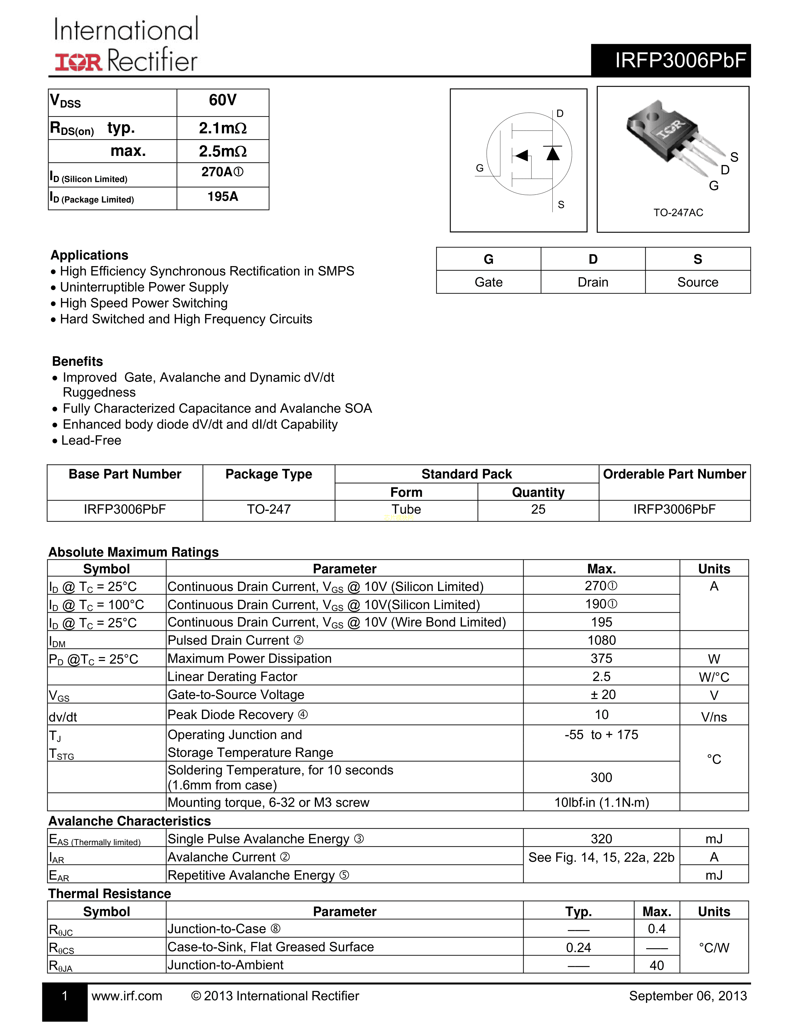IRFP3006PBF数据手册TO-247封装Infineon(英飞凌)PDF规格书,中英文下载