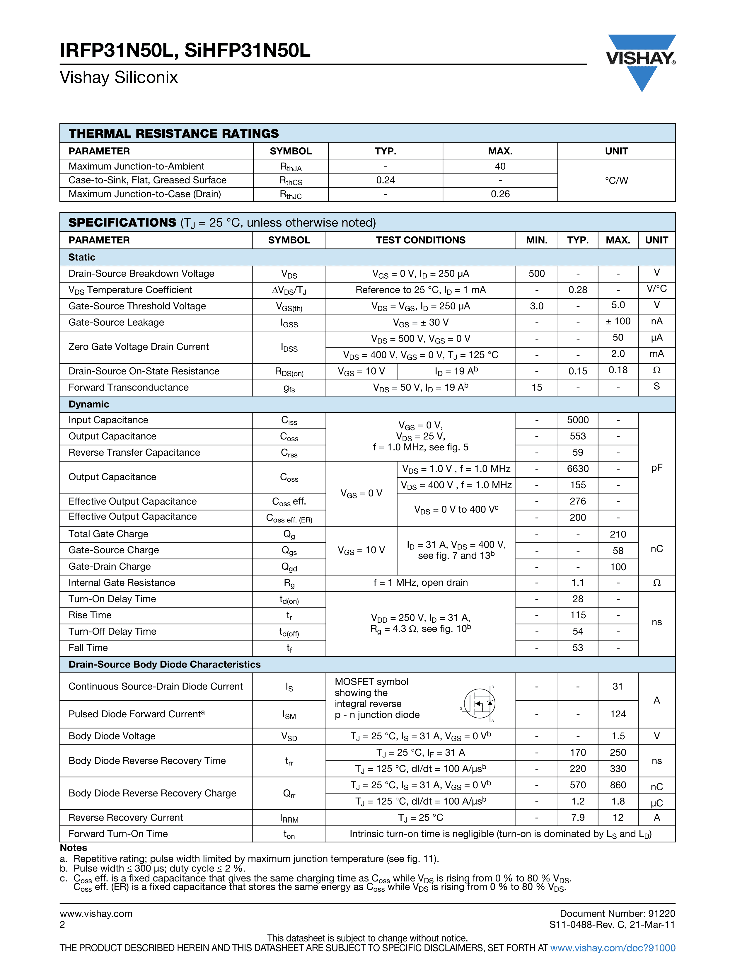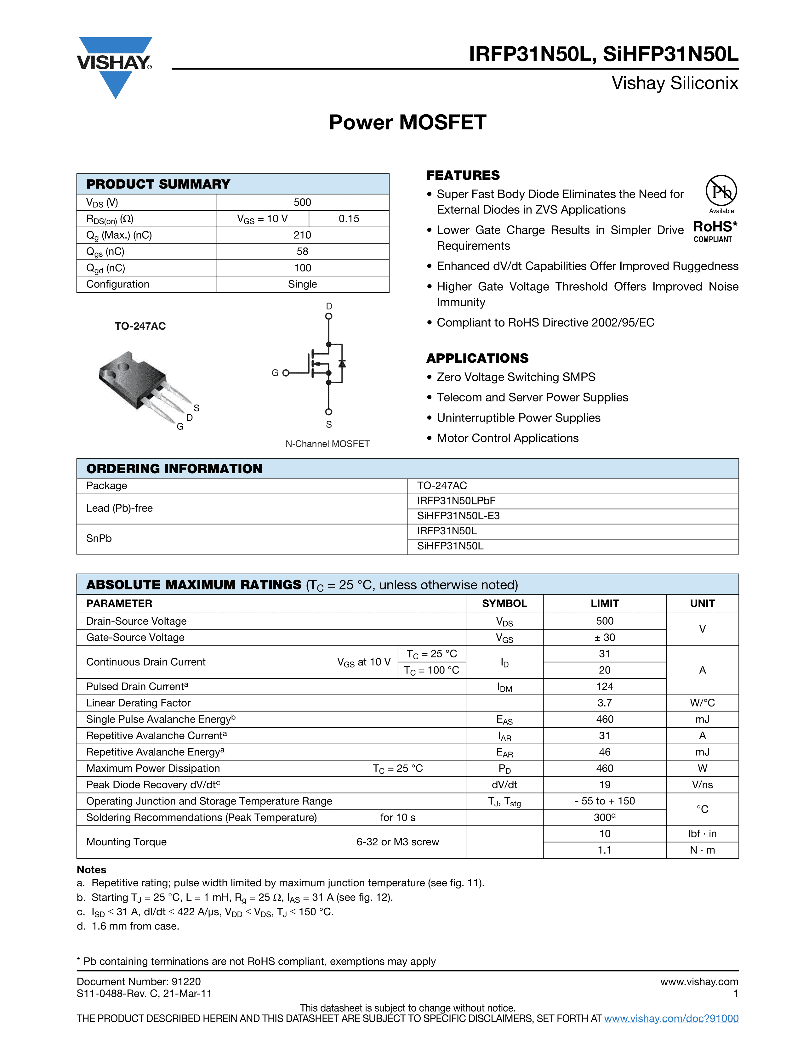 IRFP31N50LPBF数据手册TO-247AC封装VISHAY(威世)PDF规格书,中英文下载