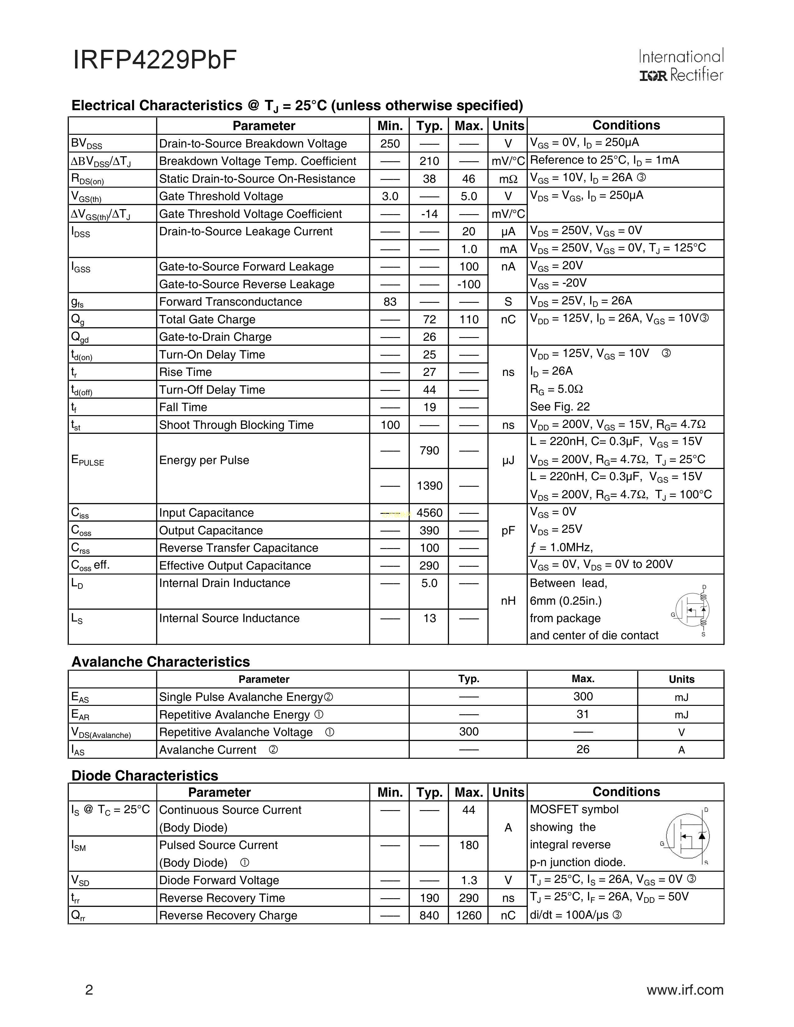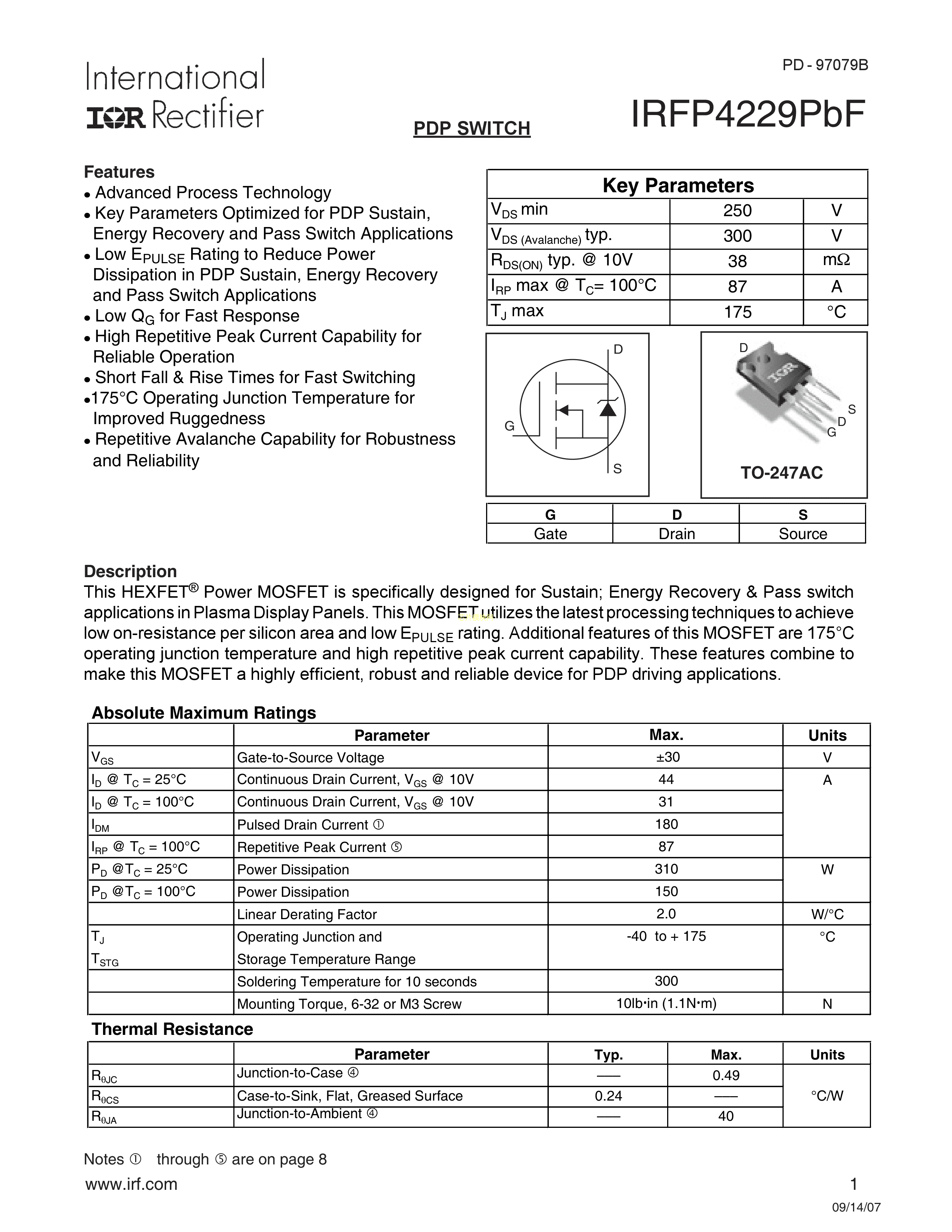 IRFP4229PBF数据手册TO-247封装Infineon(英飞凌)PDF规格书,中英文下载