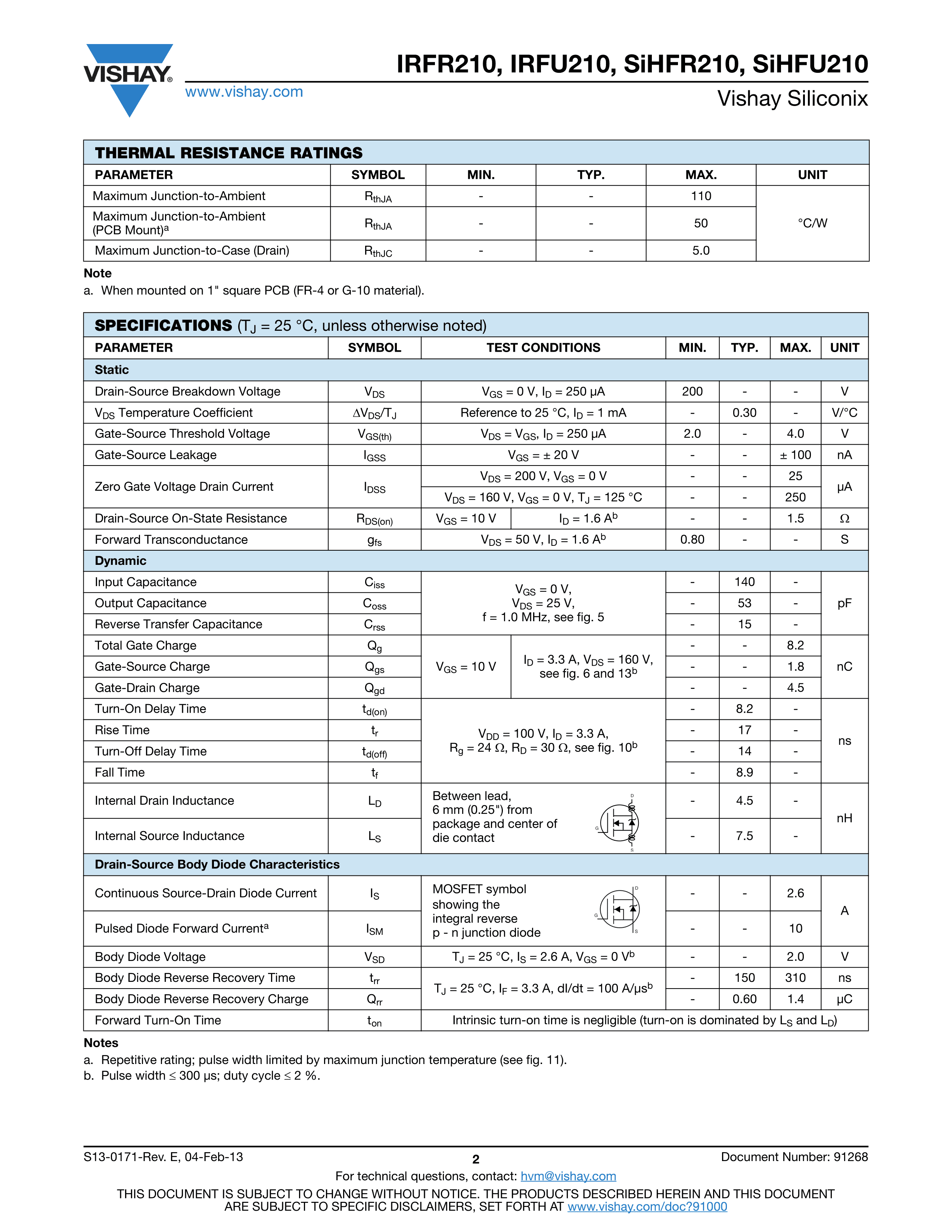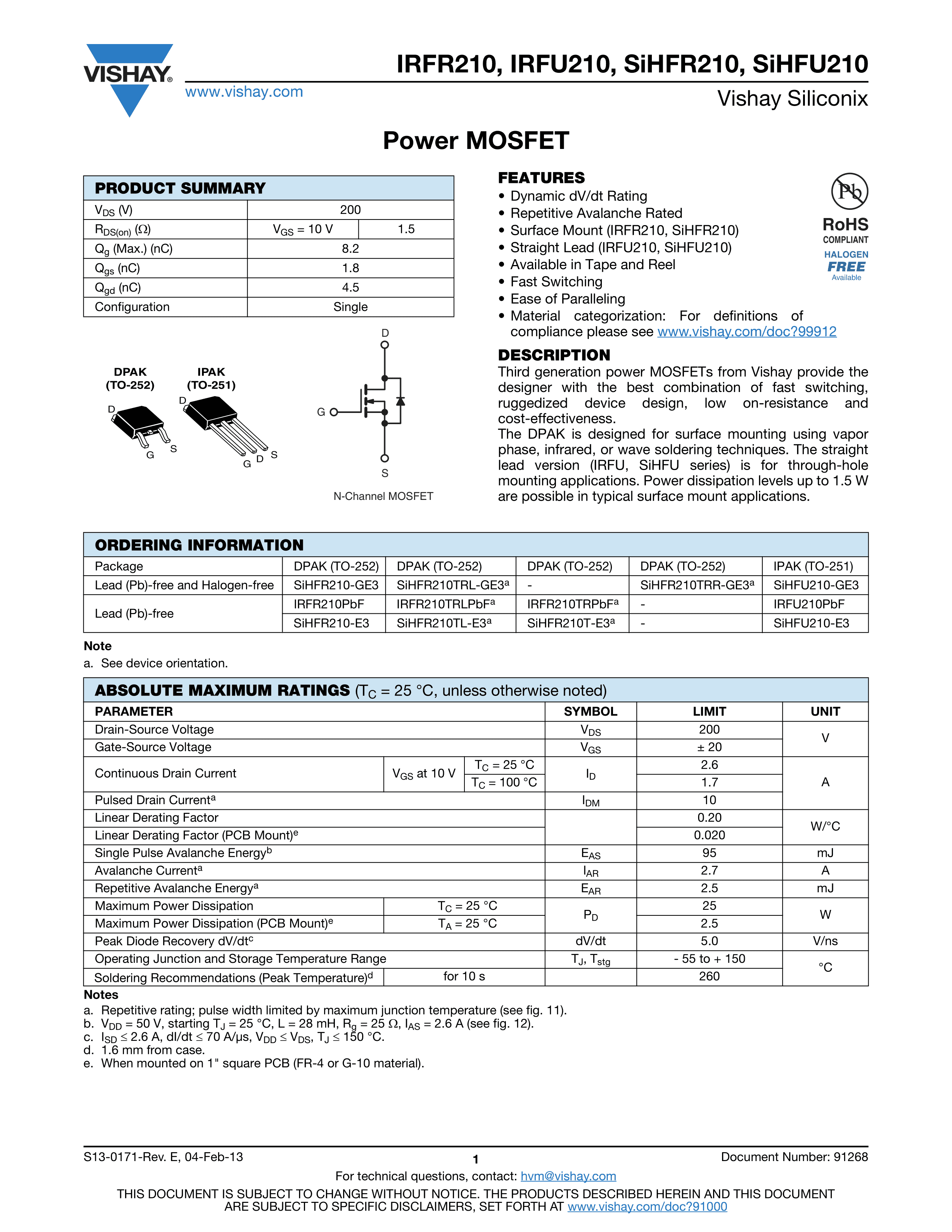 IRFR210PBF数据手册TO-252-2(DPAK)封装VISHAY(威世)PDF规格书,中英文