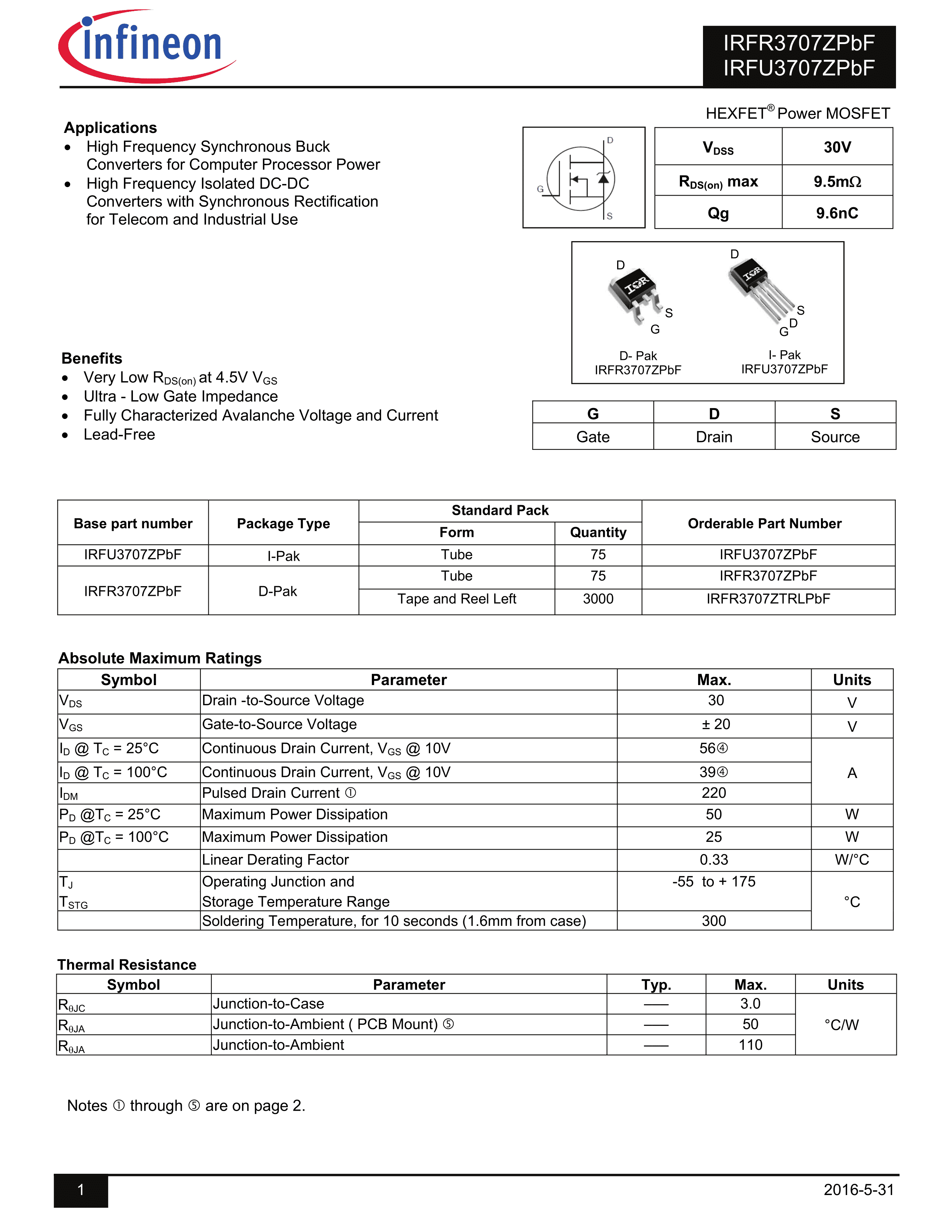 IRFR3707ZTRPBF数据手册TO-252-2(DPAK)封装Infineon(英飞凌)PDF
