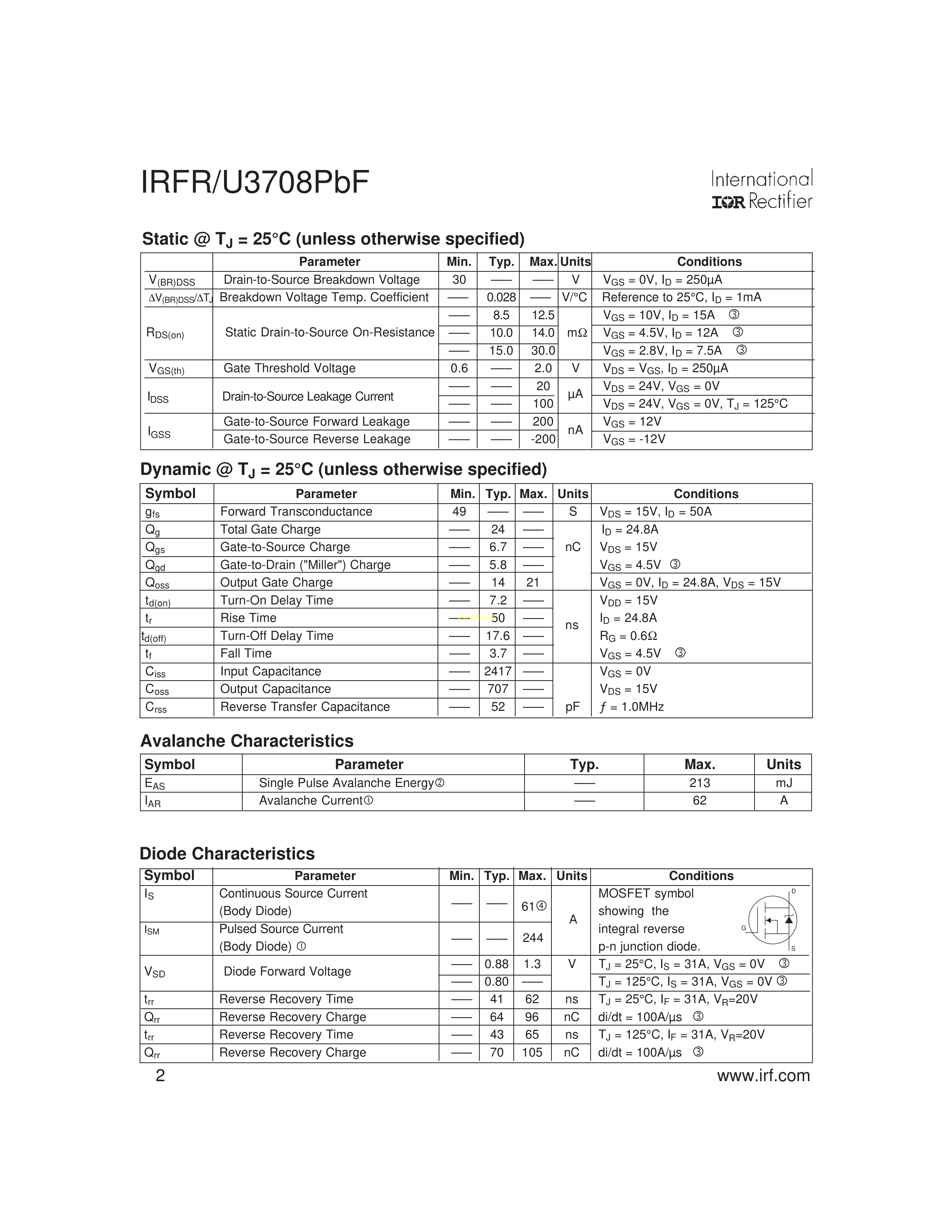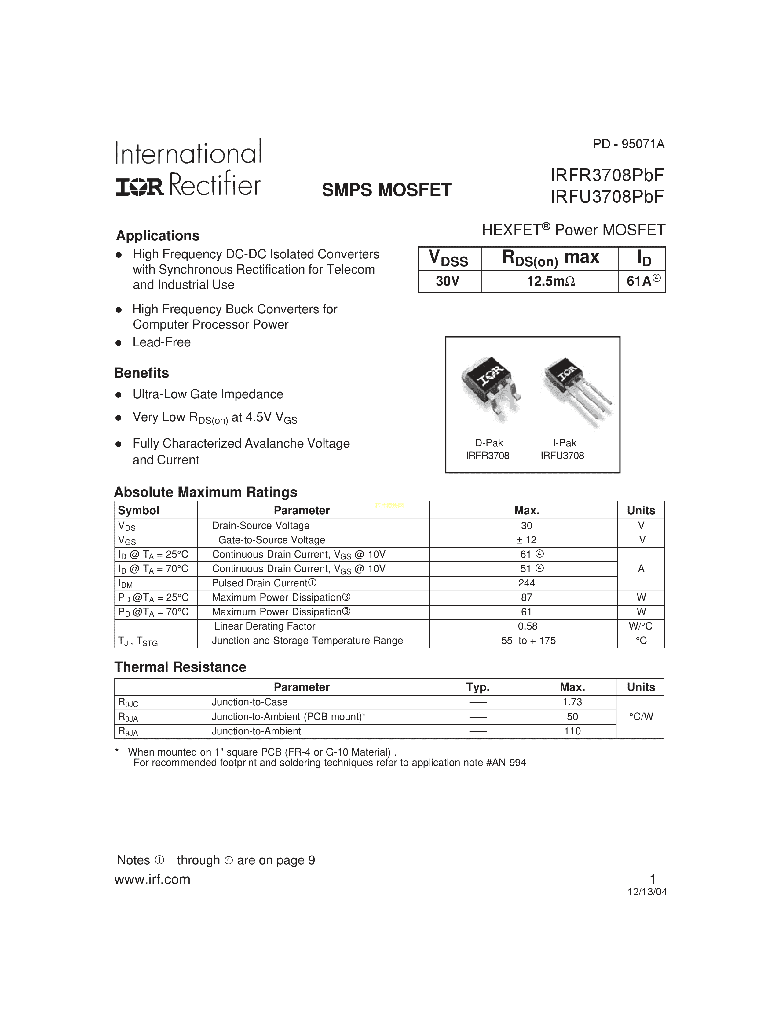 IRFR3708TRRPBF数据手册DPAK封装Infineon(英飞凌)PDF规格书,中英文下载
