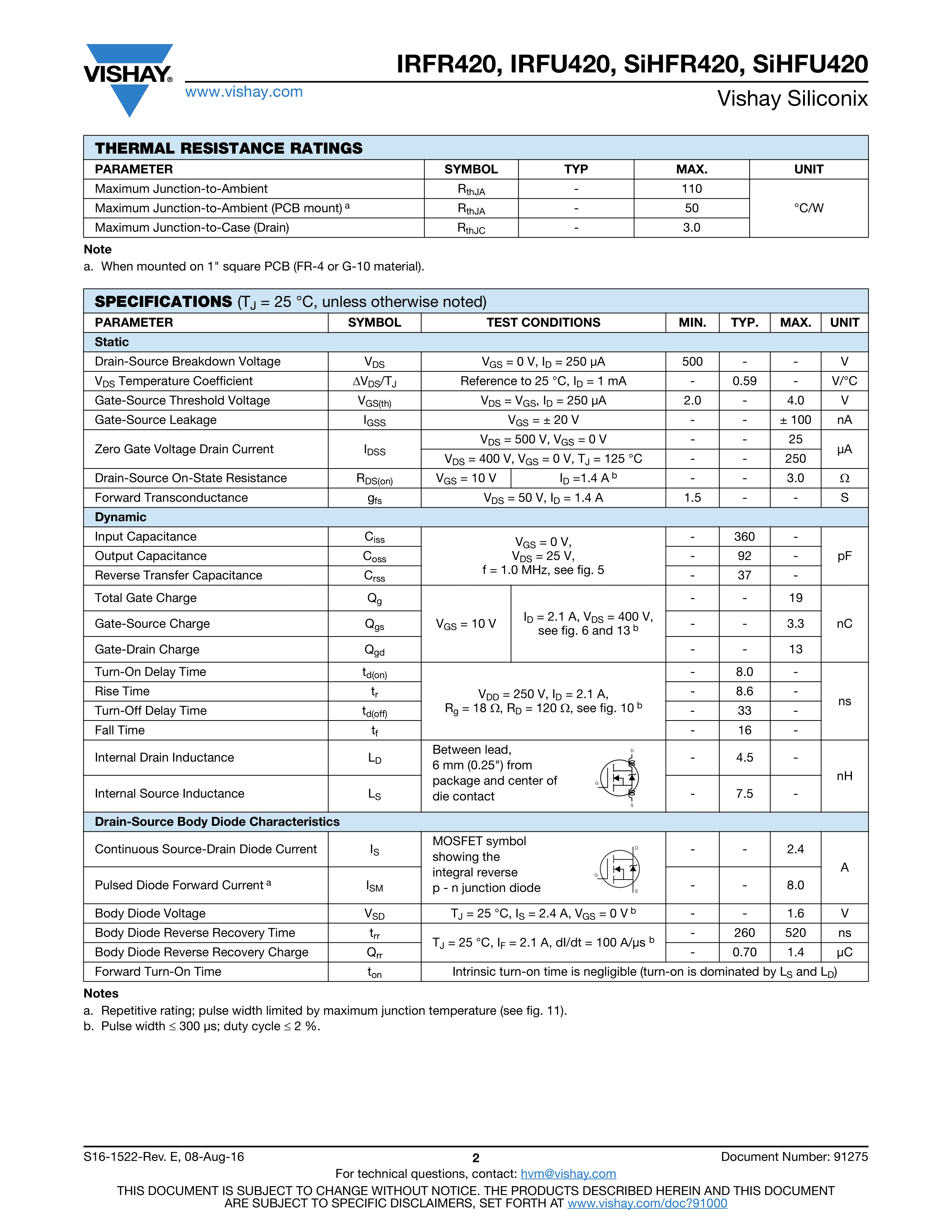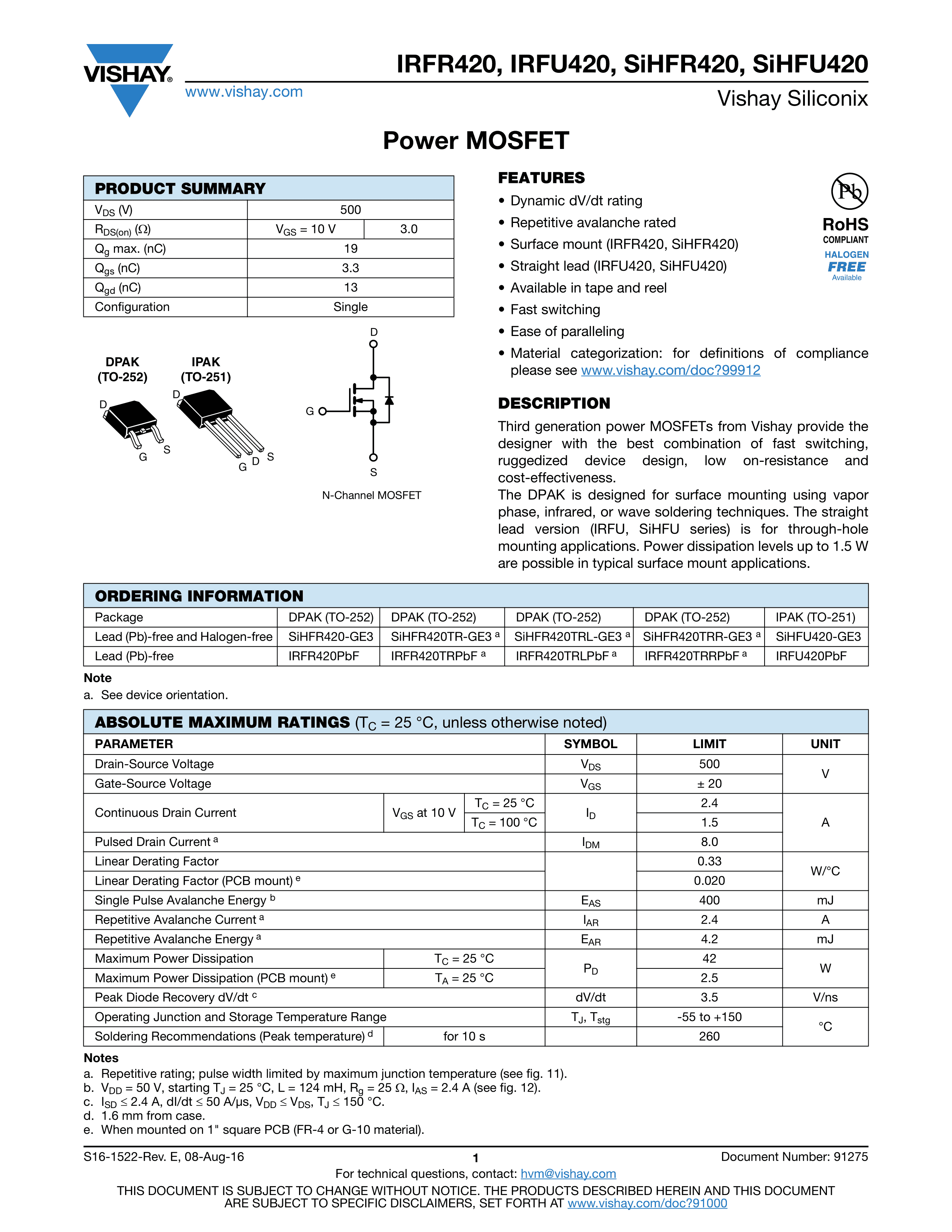 IRFR420TRPBF数据手册TO-252-3封装VISHAY(威世)PDF规格书,中英文下载