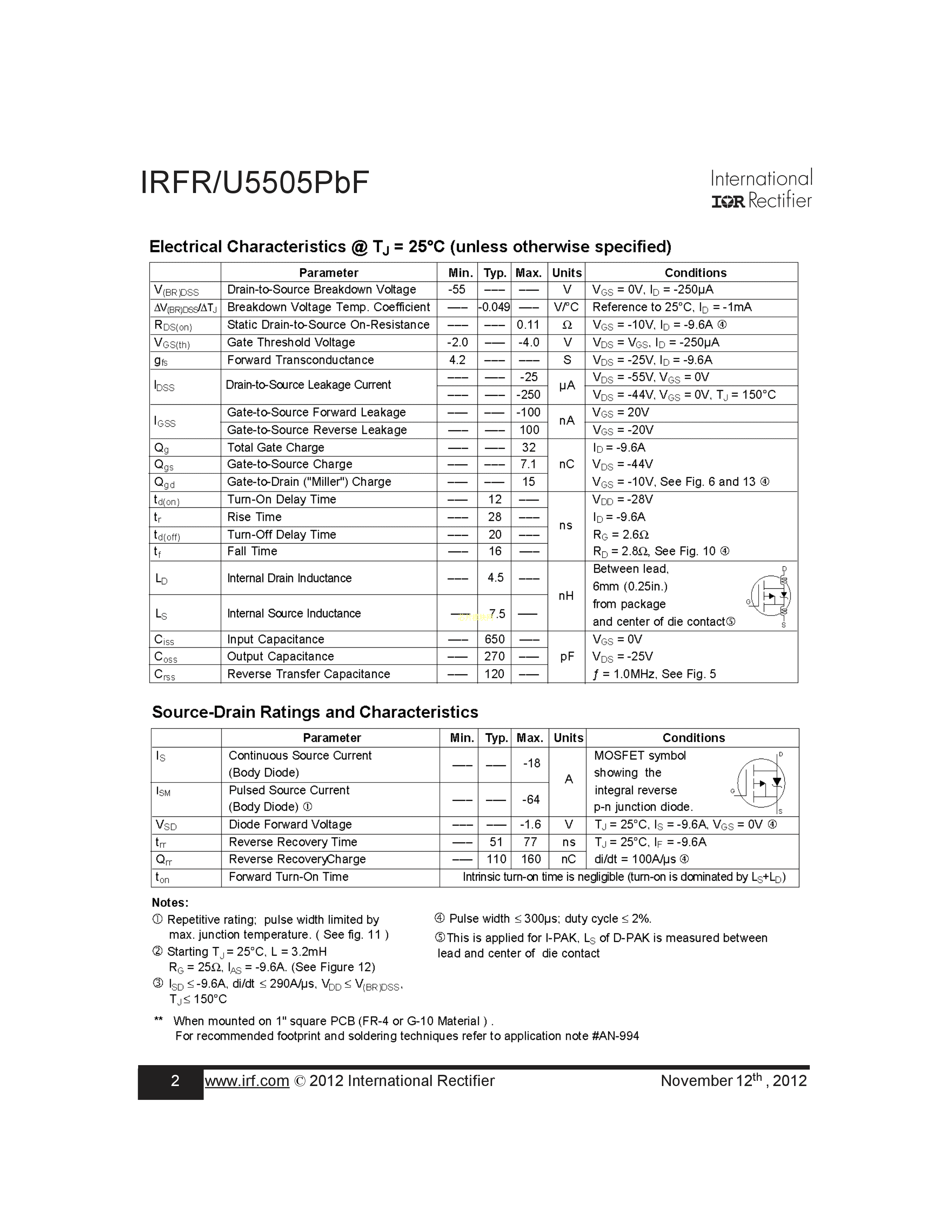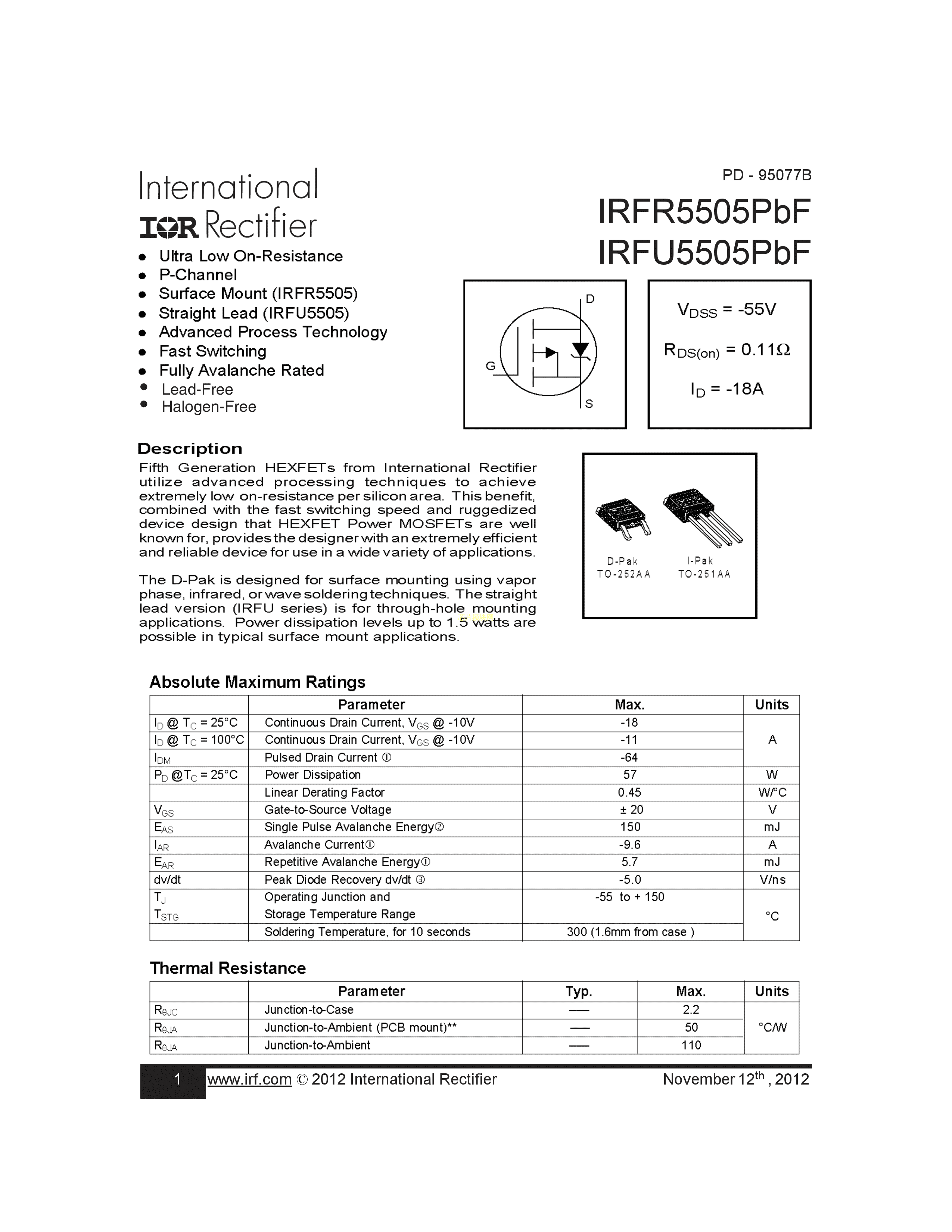 IRFR5505TRLPBF数据手册DPAK封装Infineon(英飞凌)PDF规格书,中英文下载