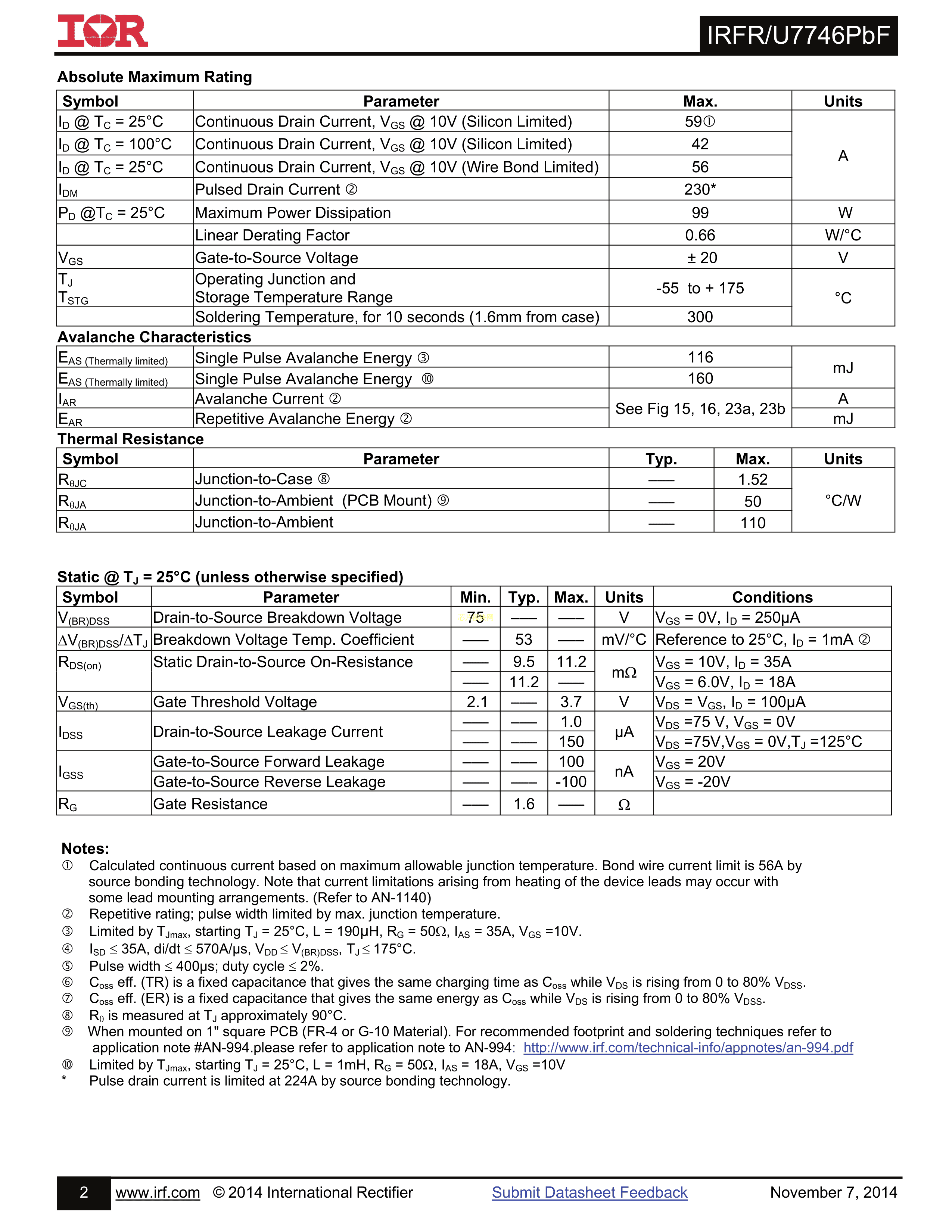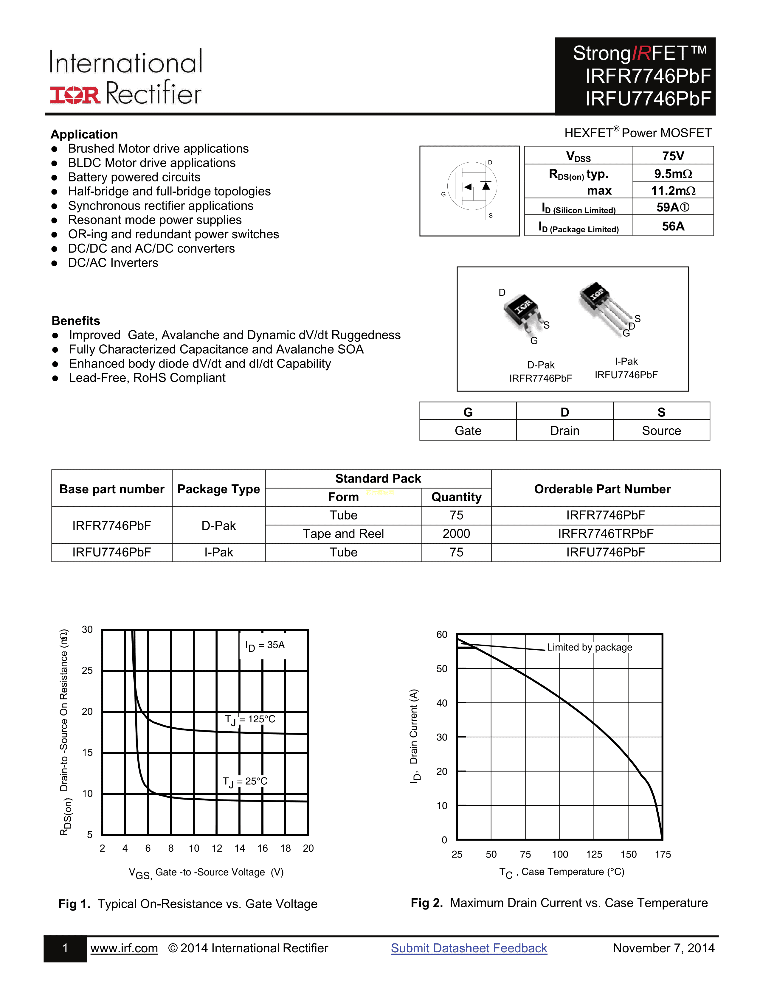 IRFR7746TRPBF数据手册TO-252-2(DPAK)封装Infineon(英飞凌)PDF规
