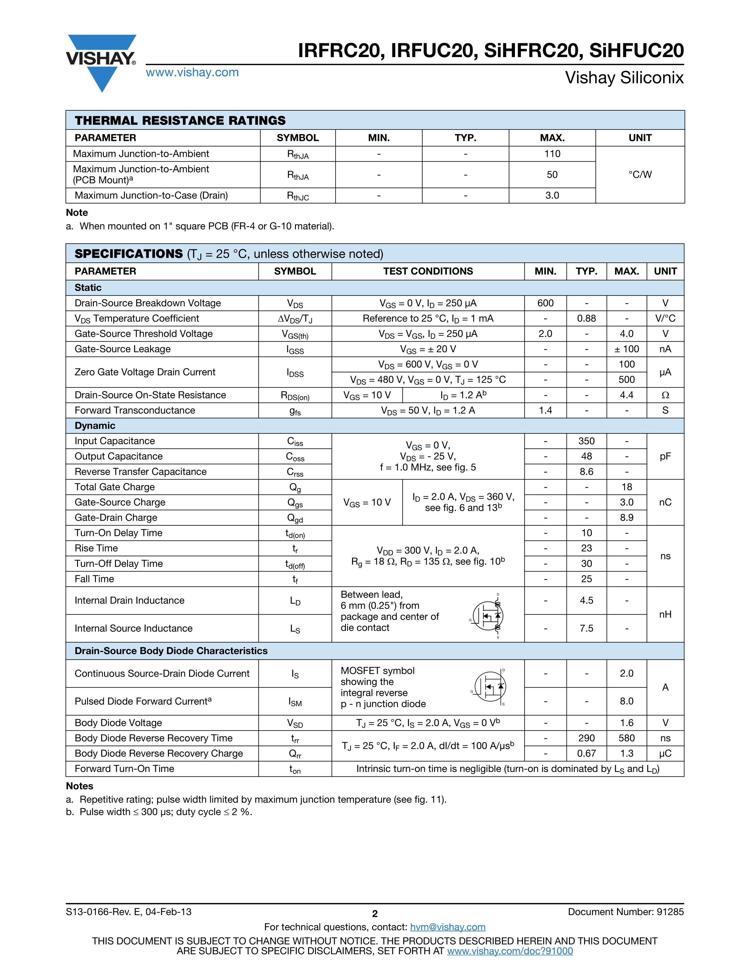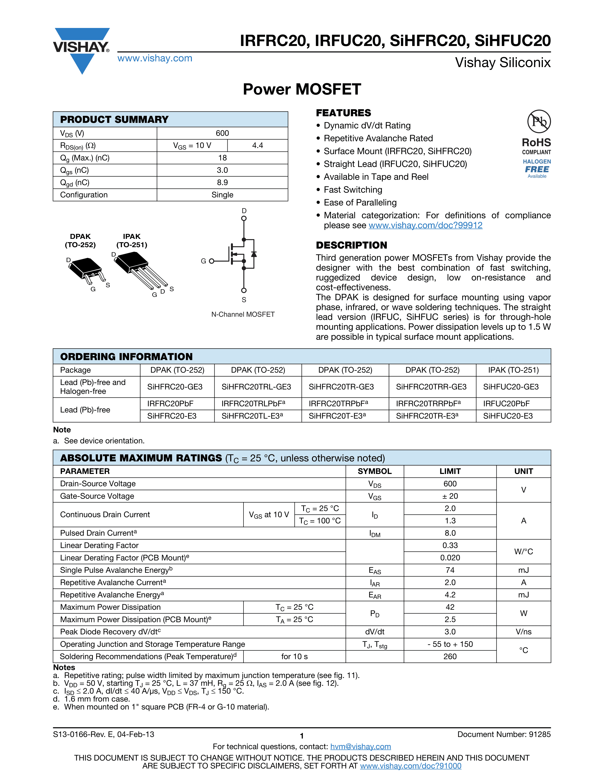IRFRC20TRRPBF数据手册TO-252-3封装VISHAY(威世)PDF规格书,中英文下载
