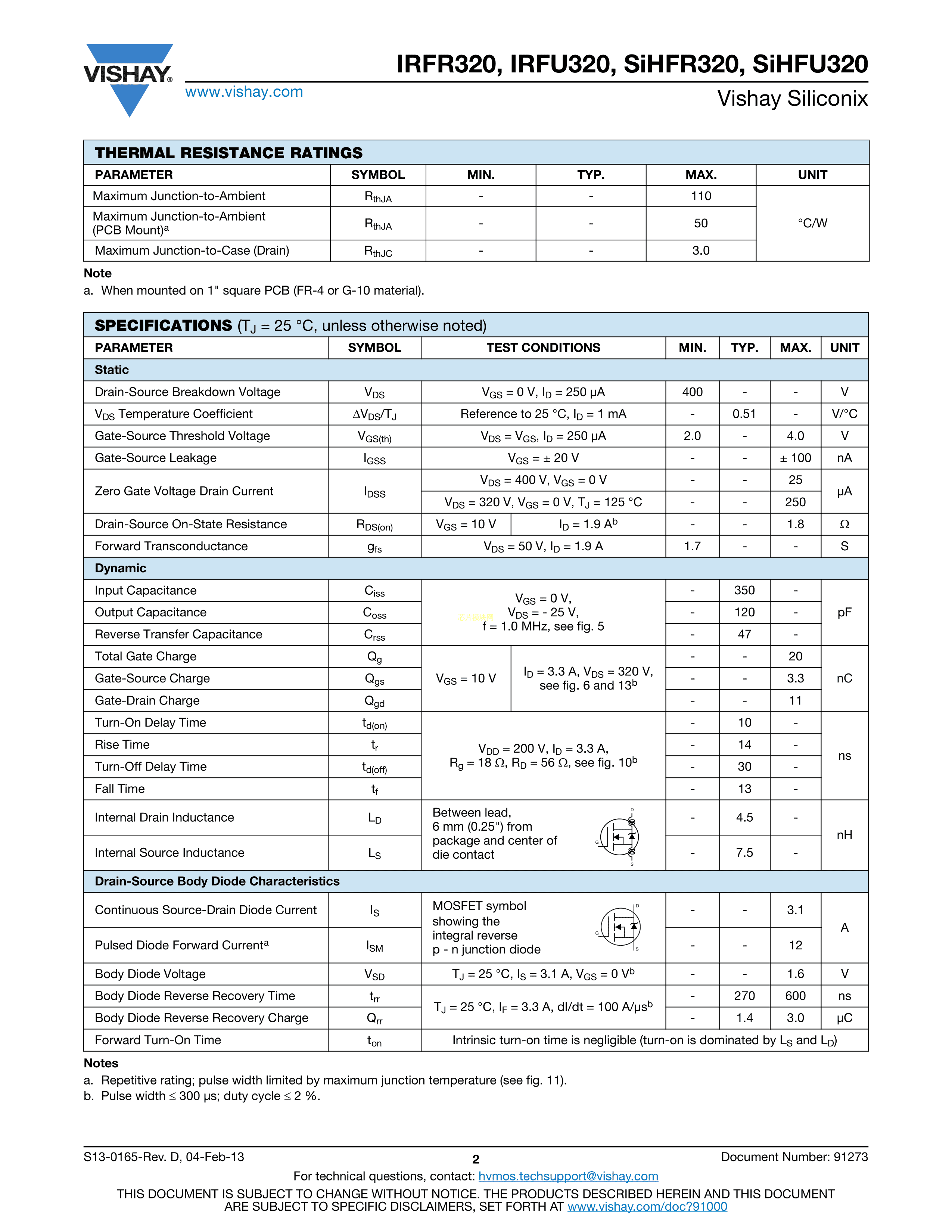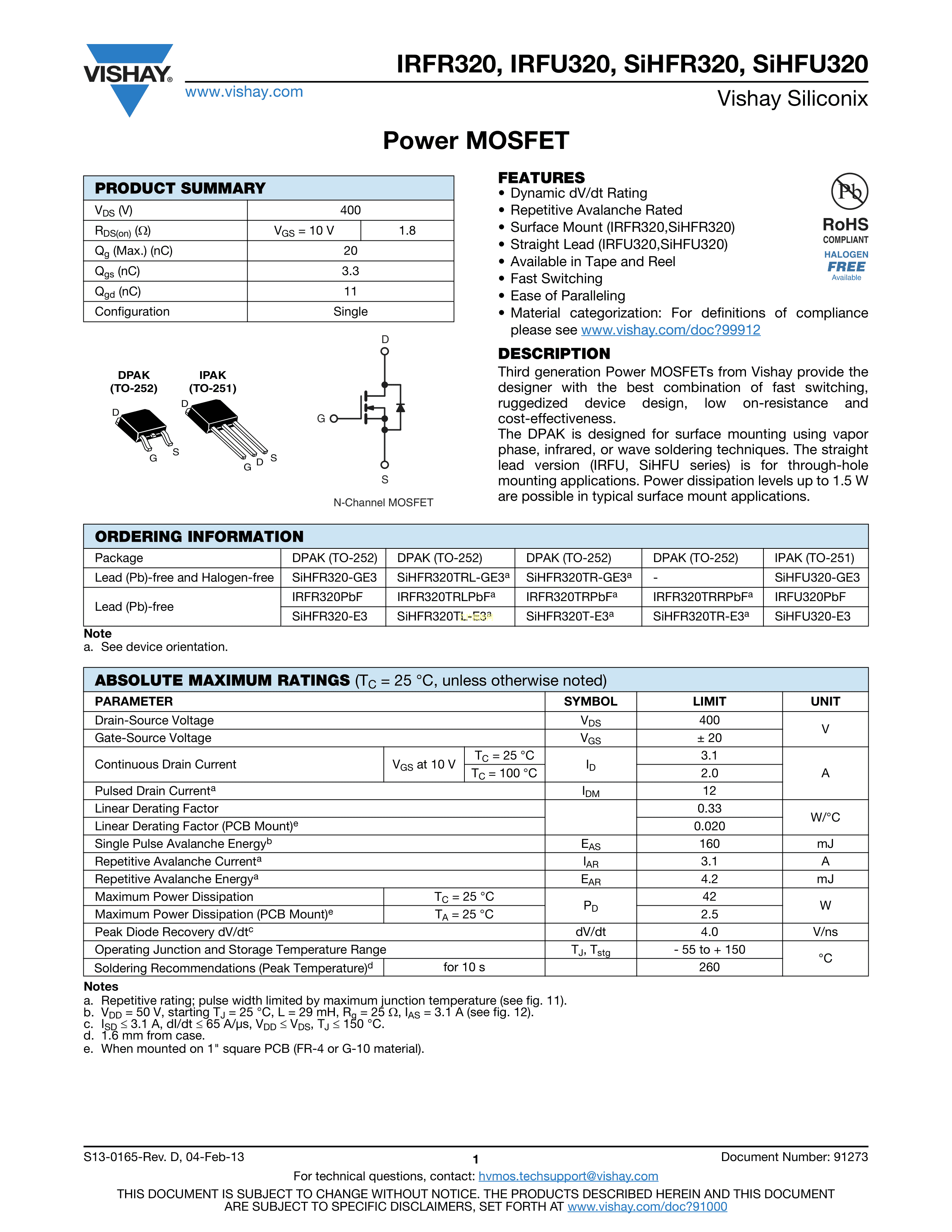 IRFU320PBF数据手册TO-251(I-PAK)封装Infineon(英飞凌)PDF规格书,中