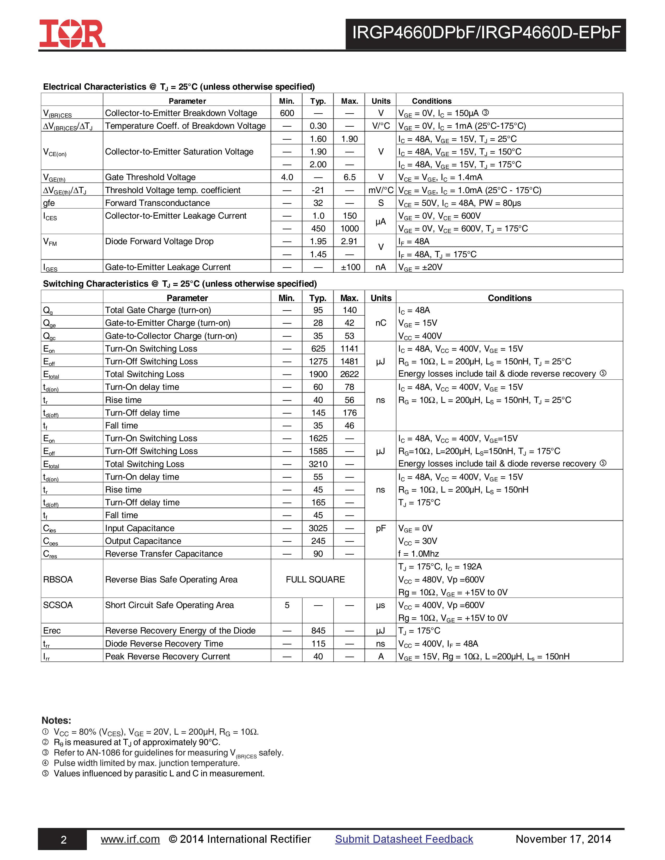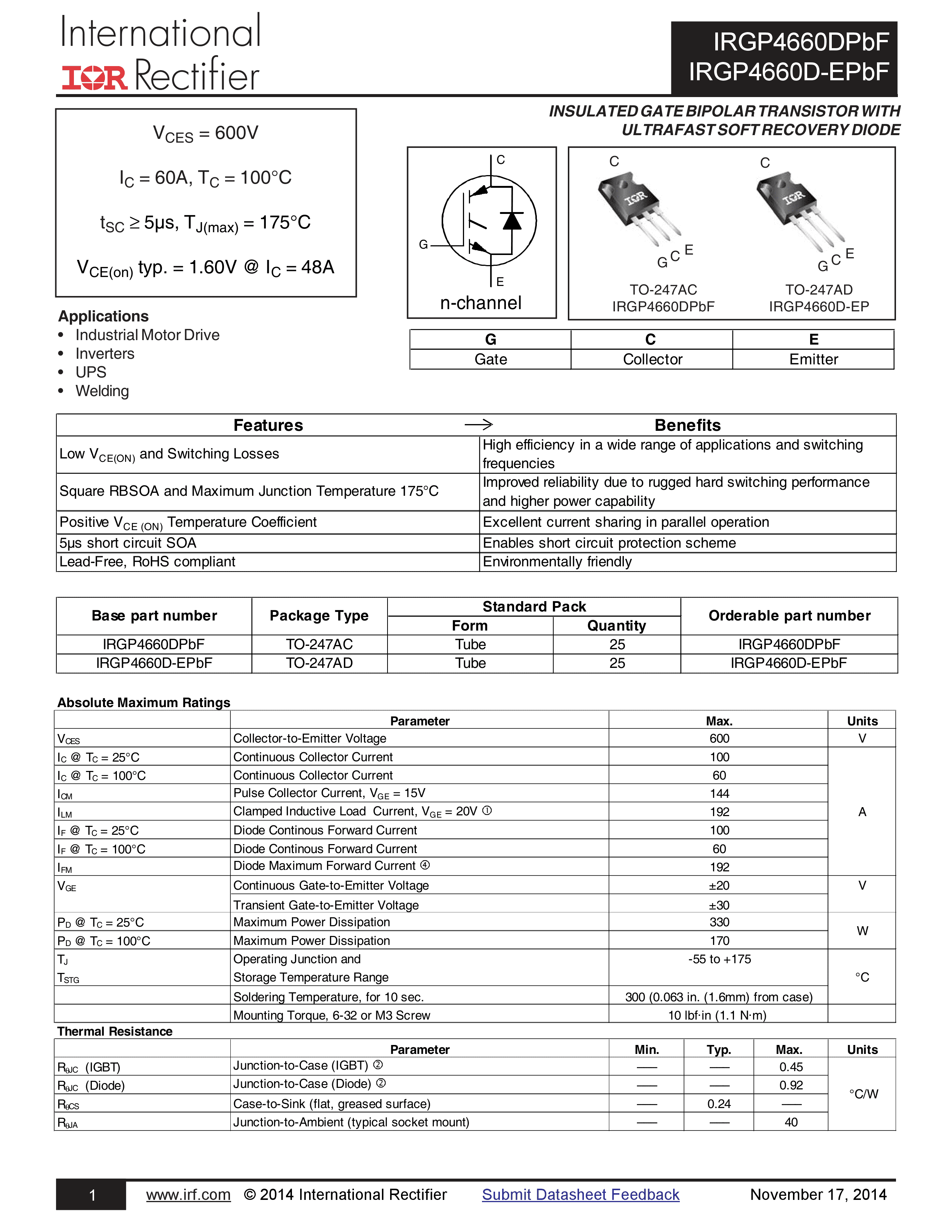 IRGP4660DPBF数据手册TO-247-3封装Infineon(英飞凌)PDF规格书,中英文下