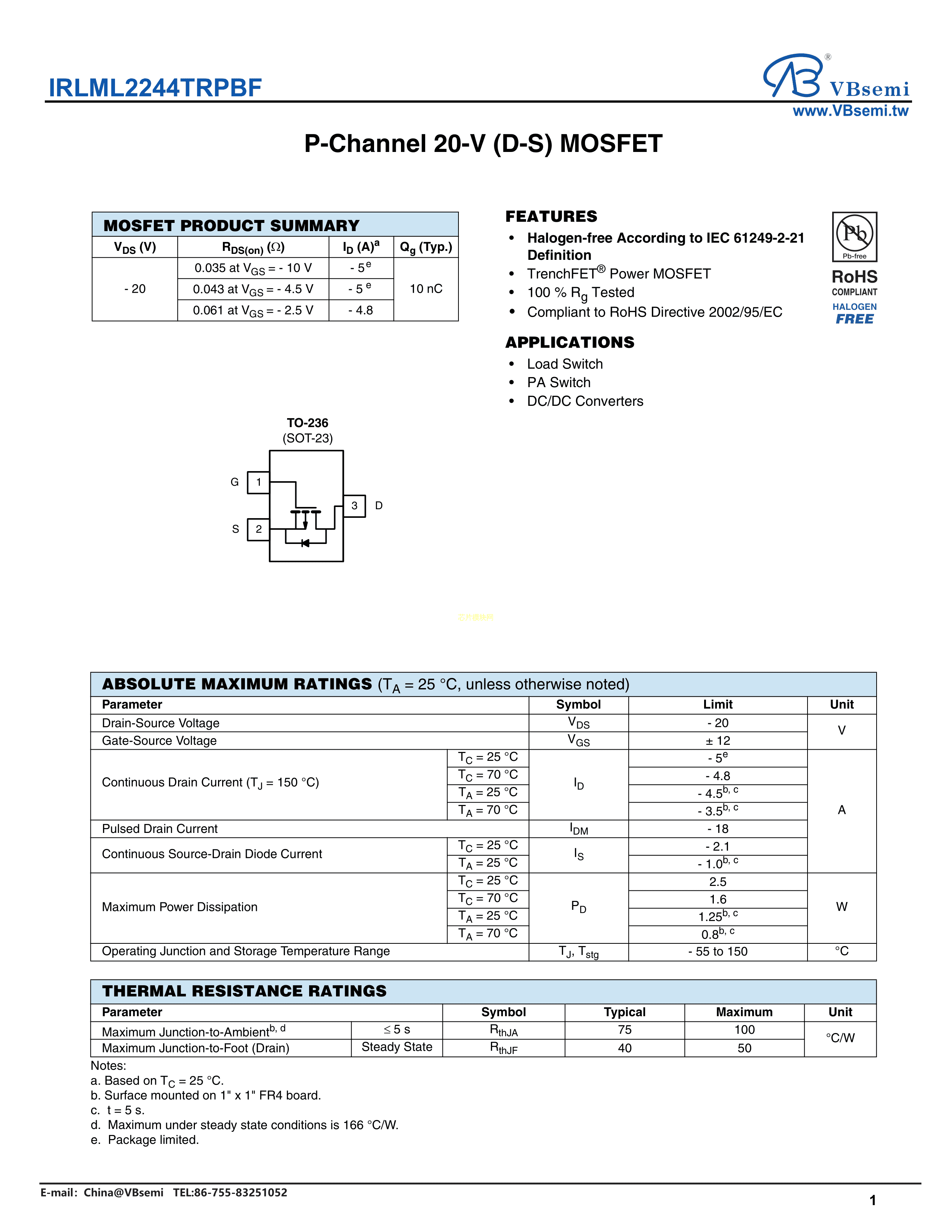 IRLML2244TRPBF数据手册SOT-23-3封装VBsemi(台湾微碧)PDF规格书,中英文