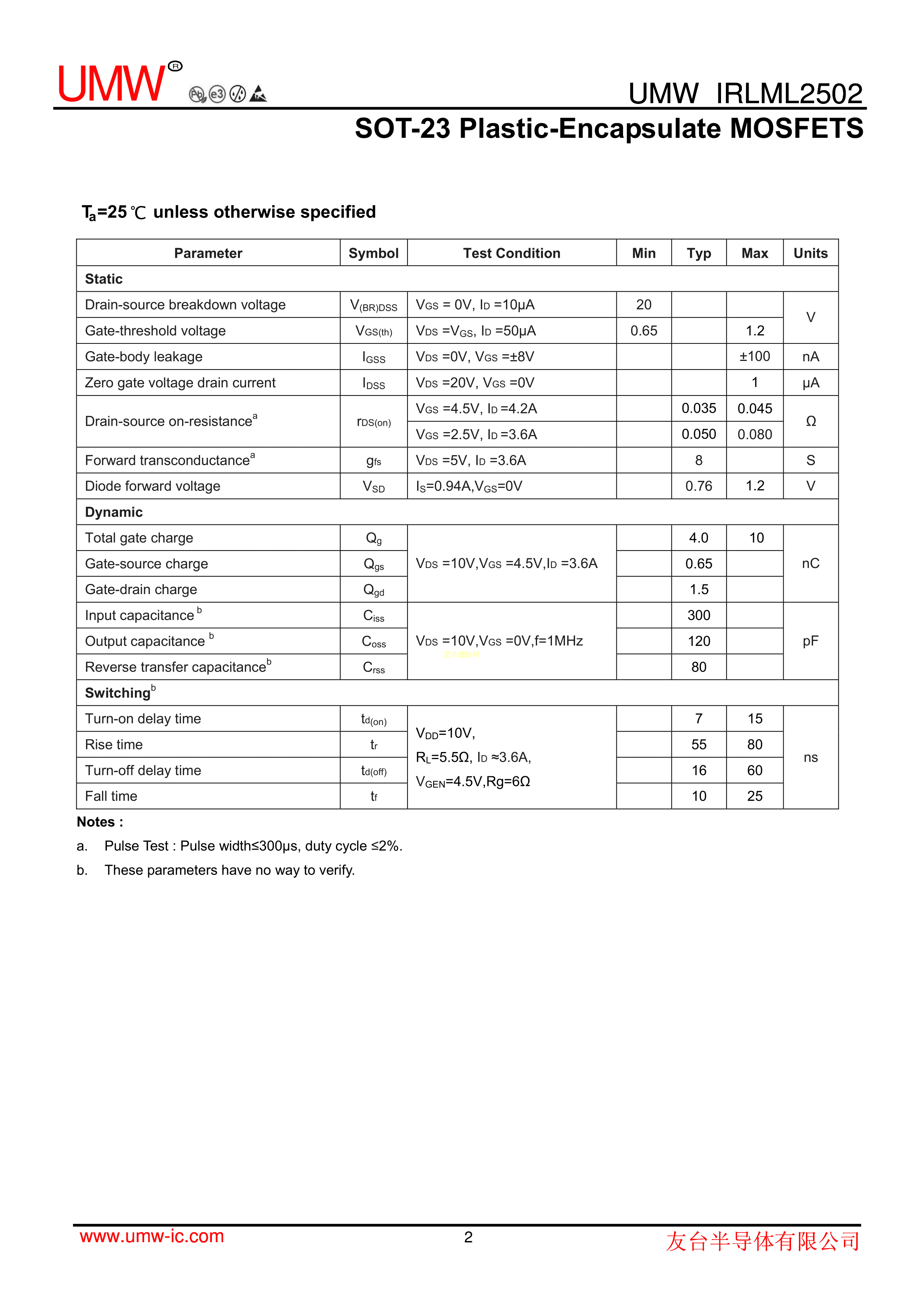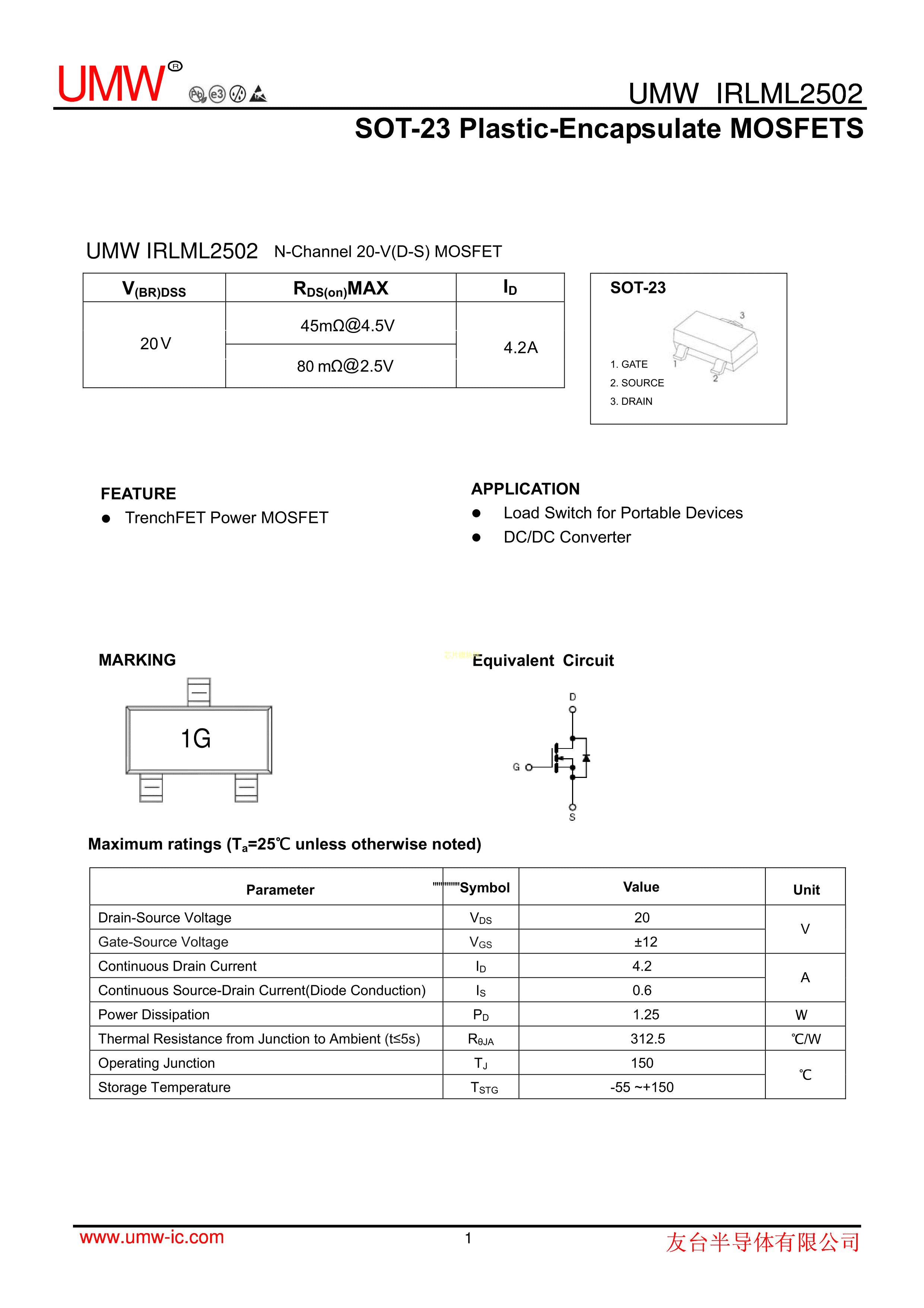 IRLML2502数据手册SOT-23封装UMW(友台半导体)PDF规格书,中英文下载