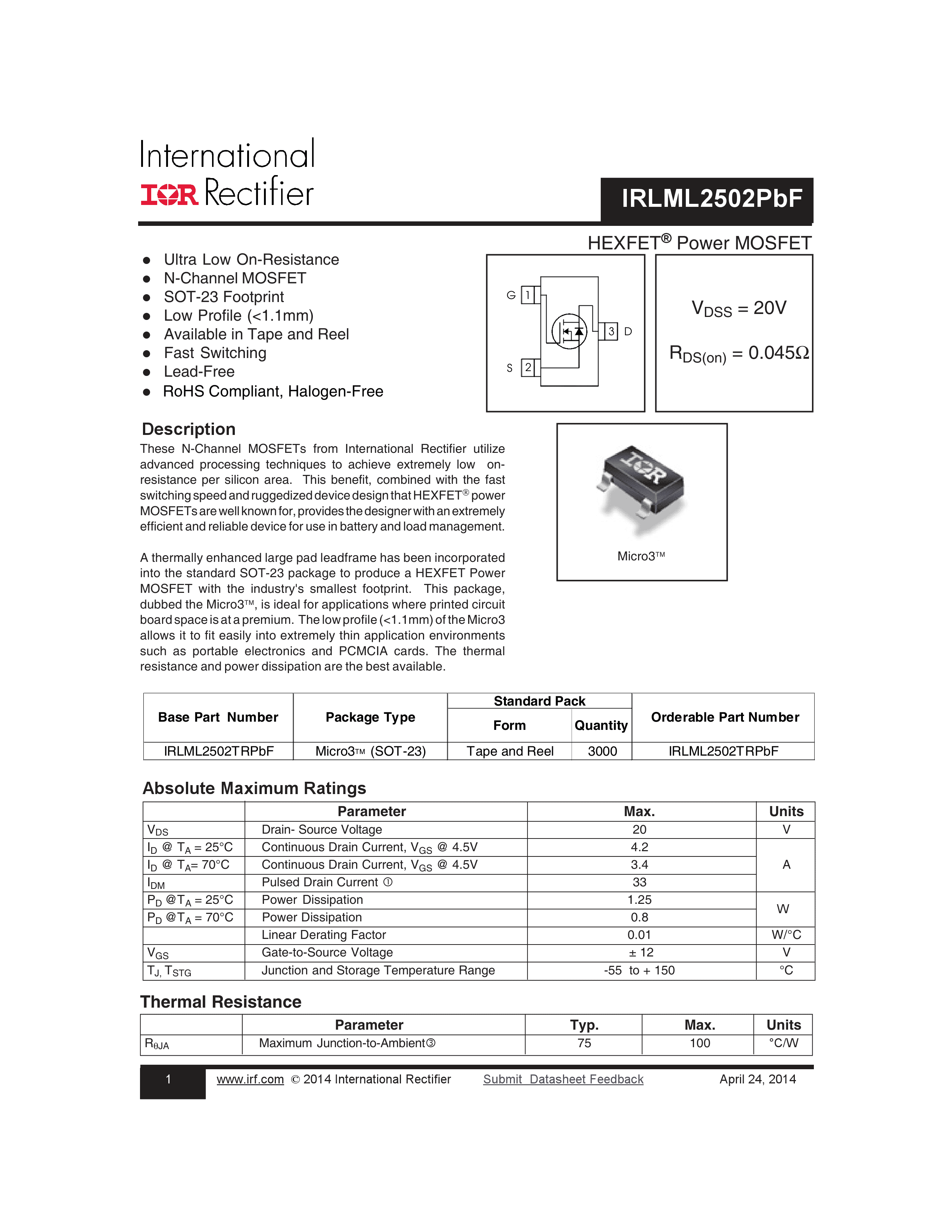 IRLML2502TRPBF数据手册SOT-23(SOT-23-3)封装Infineon(英飞凌)P