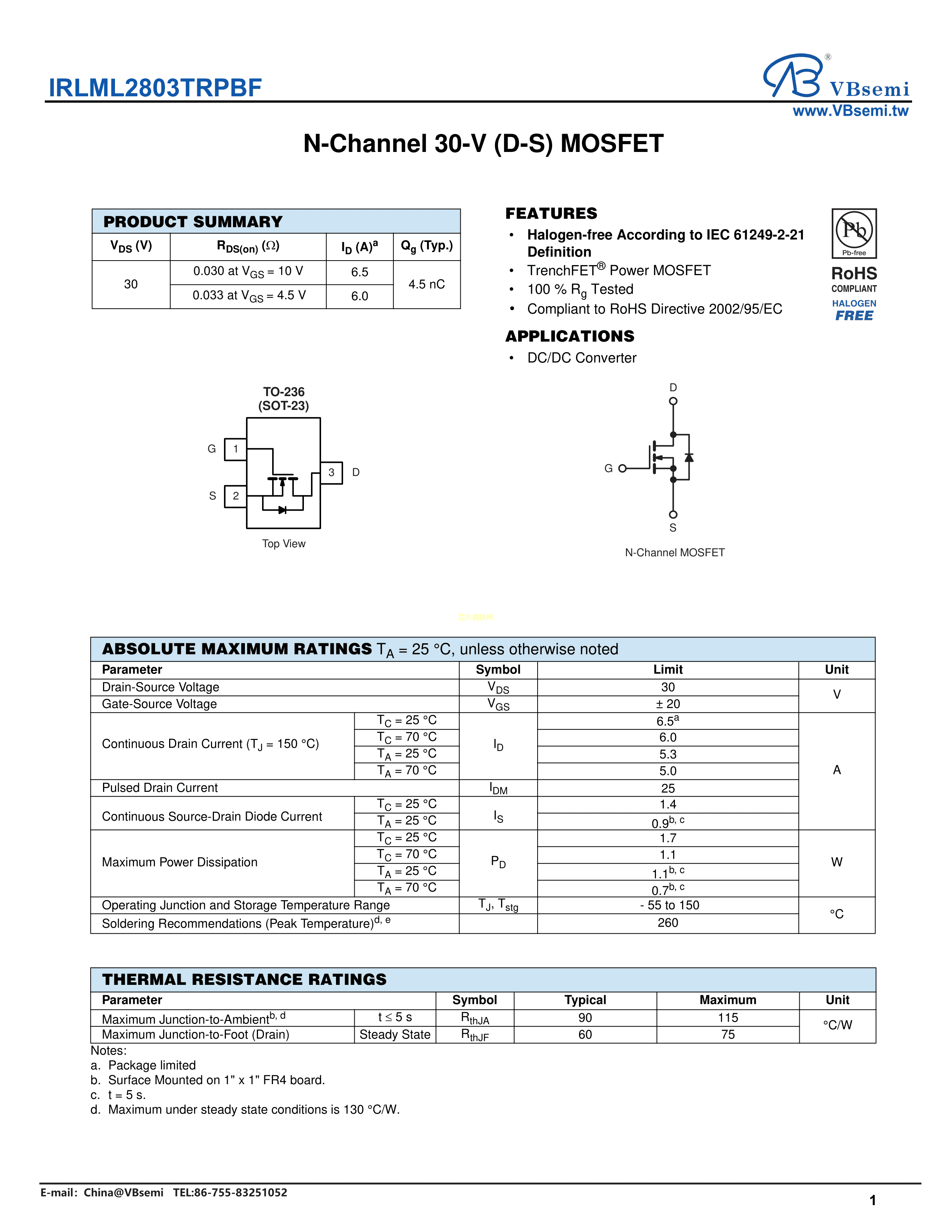 IRLML2803TRPBF数据手册SOT-23-3封装VBsemi(台湾微碧)PDF规格书,中英文