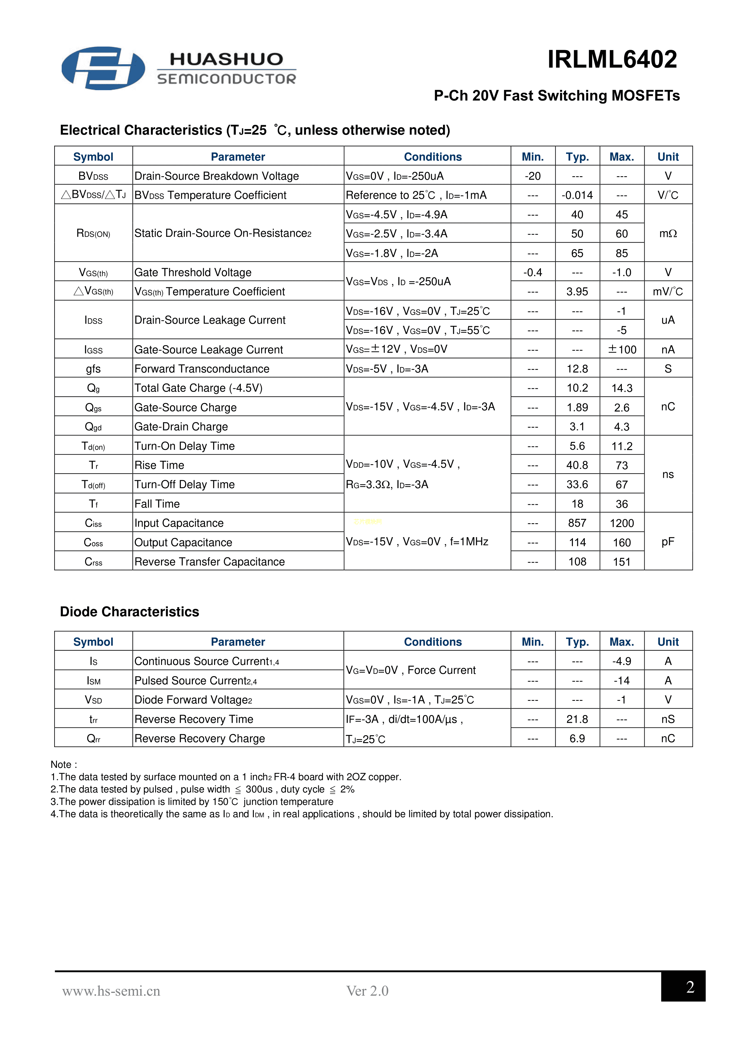 IRLML6402数据手册SOT-23-3封装HUASHUO(华朔)PDF规格书,中英文下载