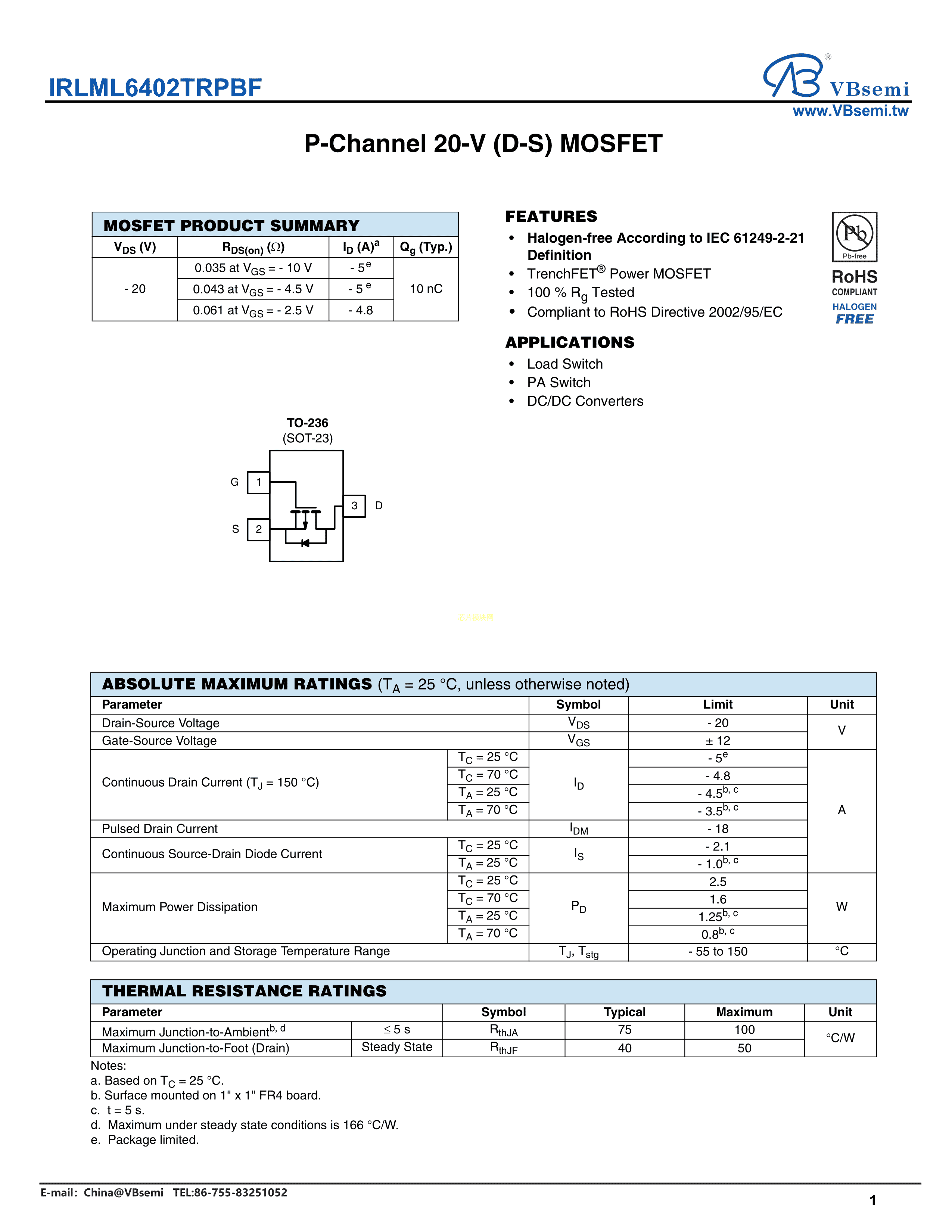 IRLML6402TRPBF数据手册SOT-23-3封装VBsemi(台湾微碧)PDF规格书,中英文