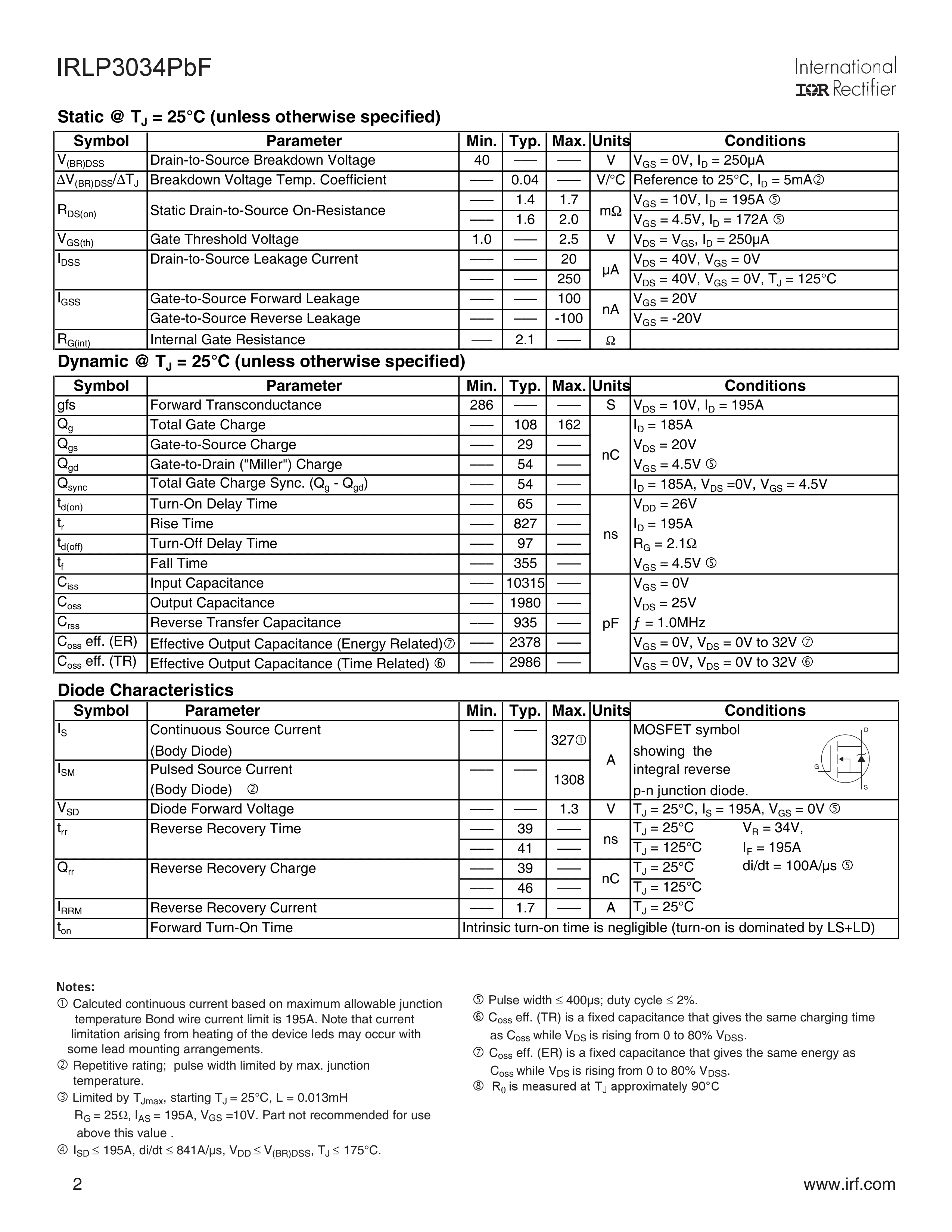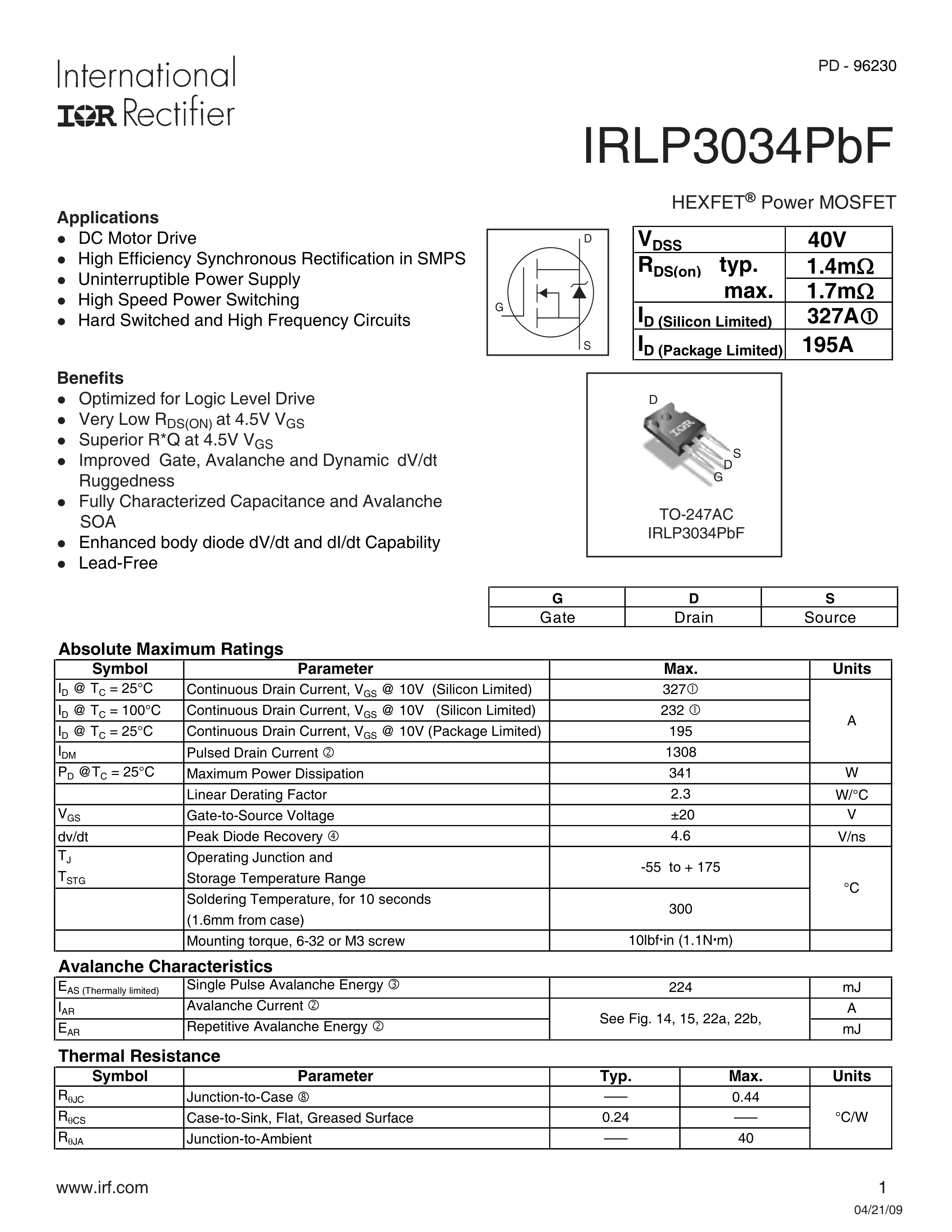IRLP3034PBF数据手册TO-247AC封装Infineon(英飞凌)PDF规格书,中英文下载
