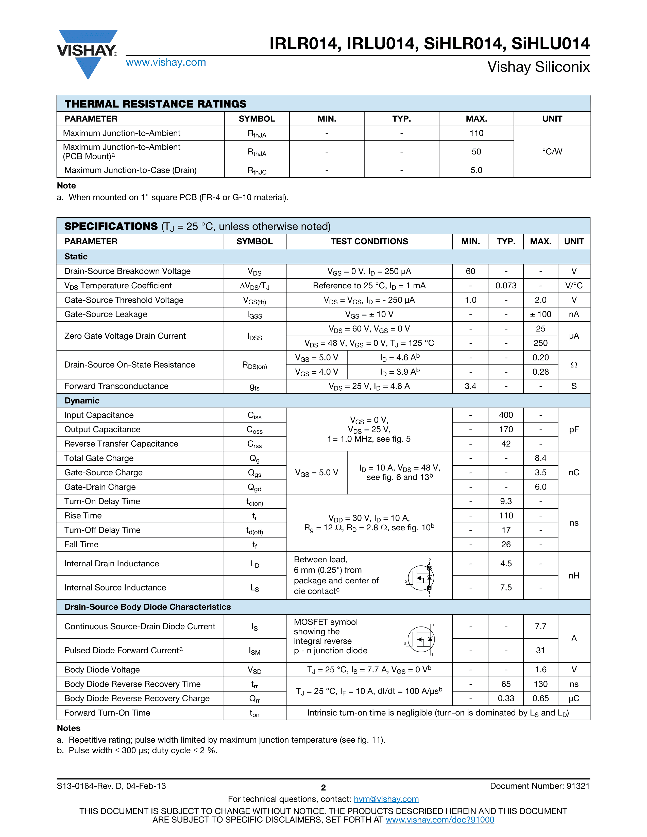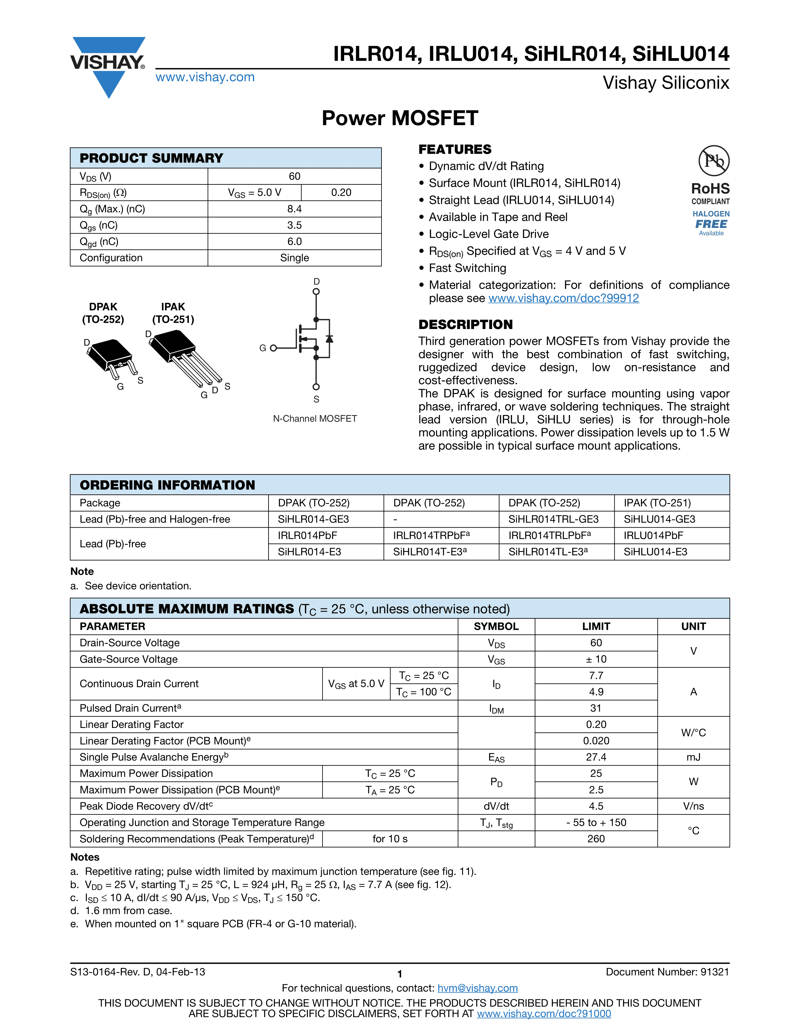IRLR014TRPBF数据手册TO-252-2(DPAK)封装VISHAY(威世)PDF规格书,中