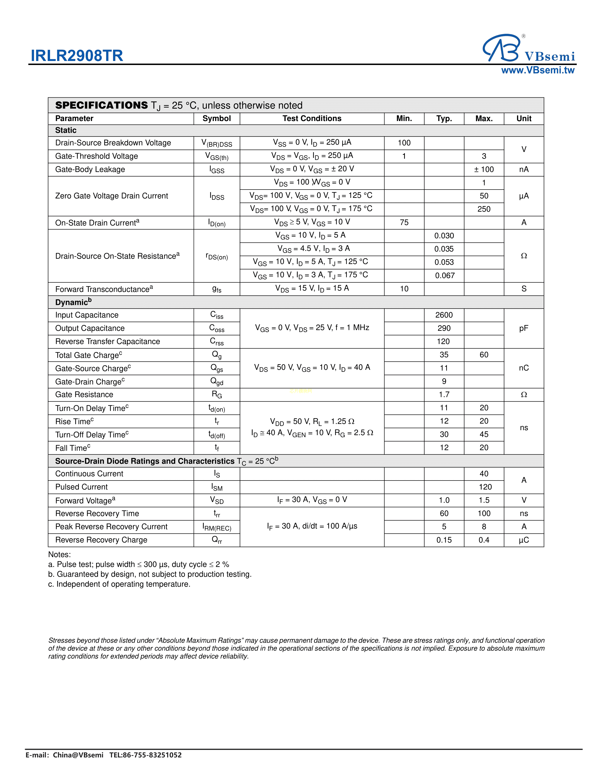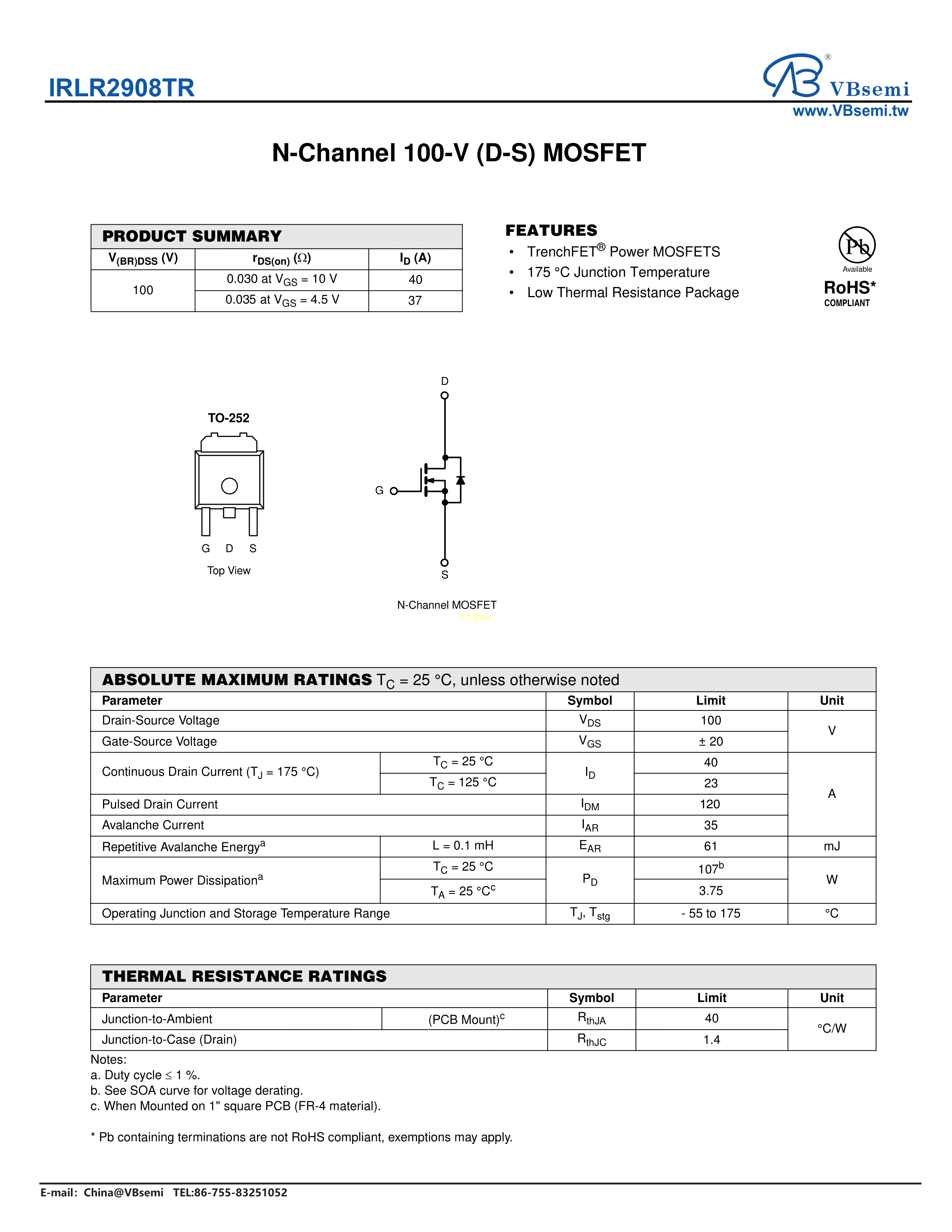 IRLR2908TR数据手册TO-252封装VBsemi(台湾微碧)PDF规格书,中英文下载